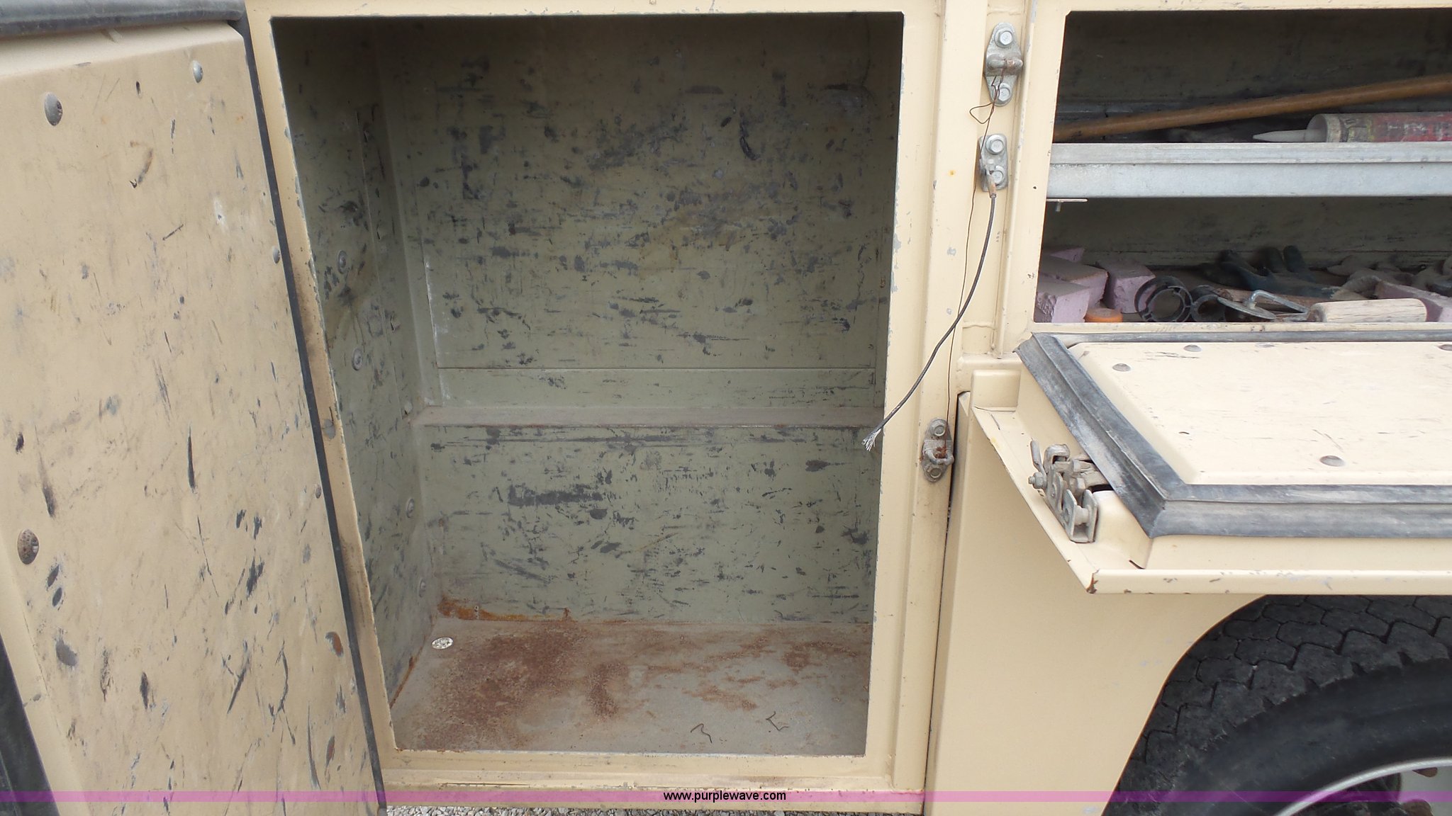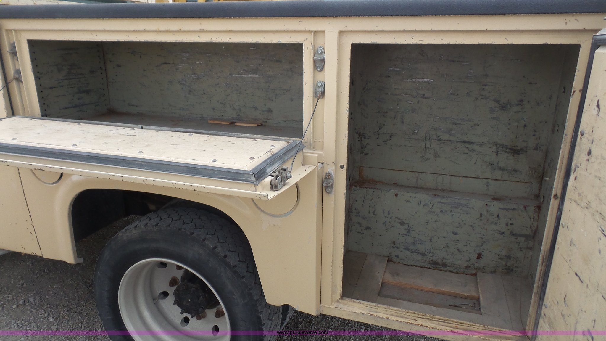Purple Wave is selling a used Service Truck in Kansas. This item is a 2007 Chevrolet C4500 Crew Cab service truck with the following: 222,119 miles on odometer, 6.6L V8 OHV 32V turbo diesel engine, Automatic transmission, AC and heat, Tilt, Cruise, AM/FM, Vinyl interior, Utility bed, 9.5'L, Ladder rack, Pintle hitch, 225/70R19.5 tires, Interior/exterior cosmetic damage, Left turn signal missing, Battery dead