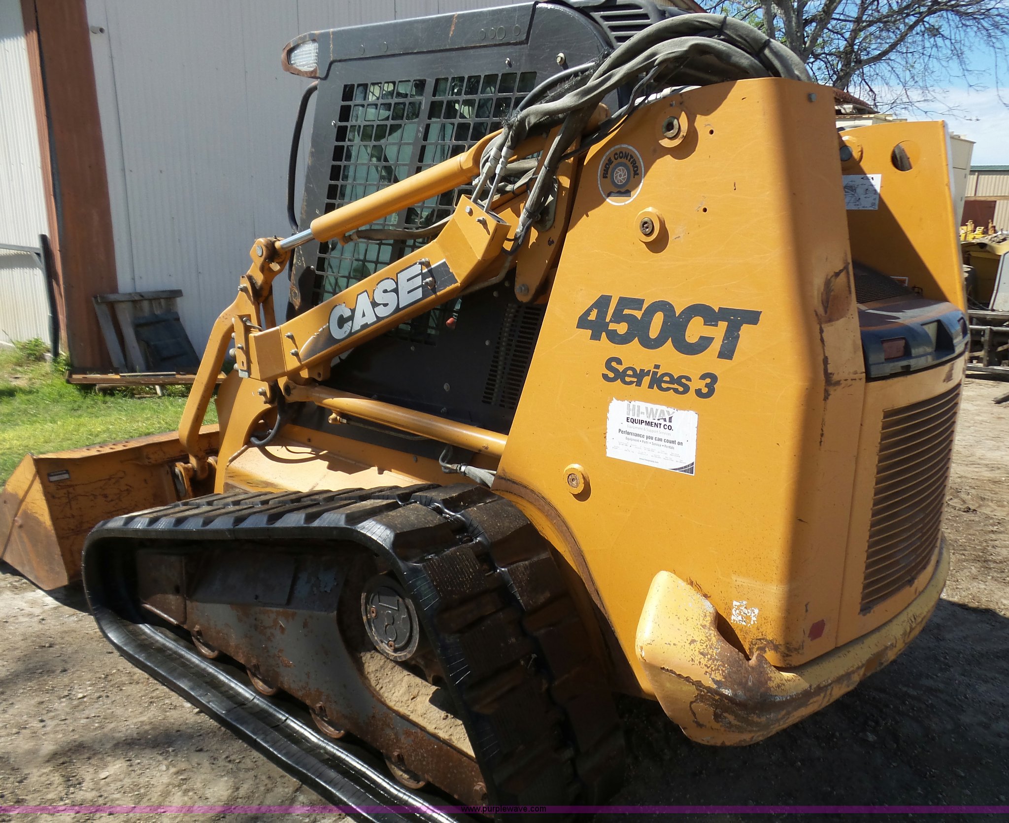 Purple Wave is selling a used Tracked Skid Steer Loader in Texas. This item is a 2010 Case 450CT Series III skid steer with the following: 1,764 hours on meter, Case 44ST/M2 four cylinder turbo diesel engine, 88 HP, Two speed hydrostatic transmission, Enclosed cab, AC and heat, Joystick controls, Spring suspension seat, Ride control switch, Wipers, Front work lights, Backup alarm, Case 84"W low profile bucket, Bolt-on cutting edge, Hydraulic quick coupler, High Flow auxiliary hydraulics, Duro Force 18"W tracks, Serial NAM420252