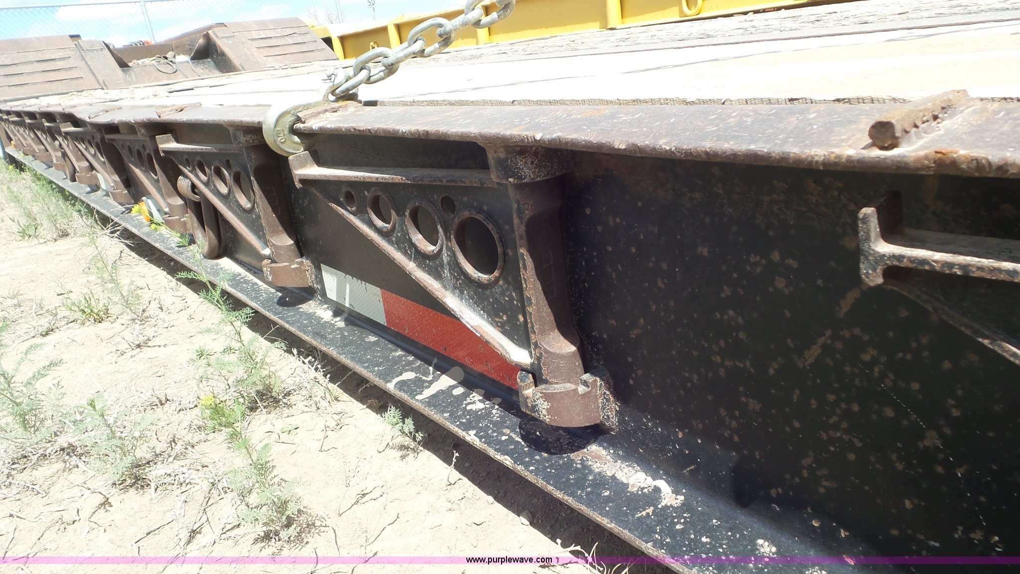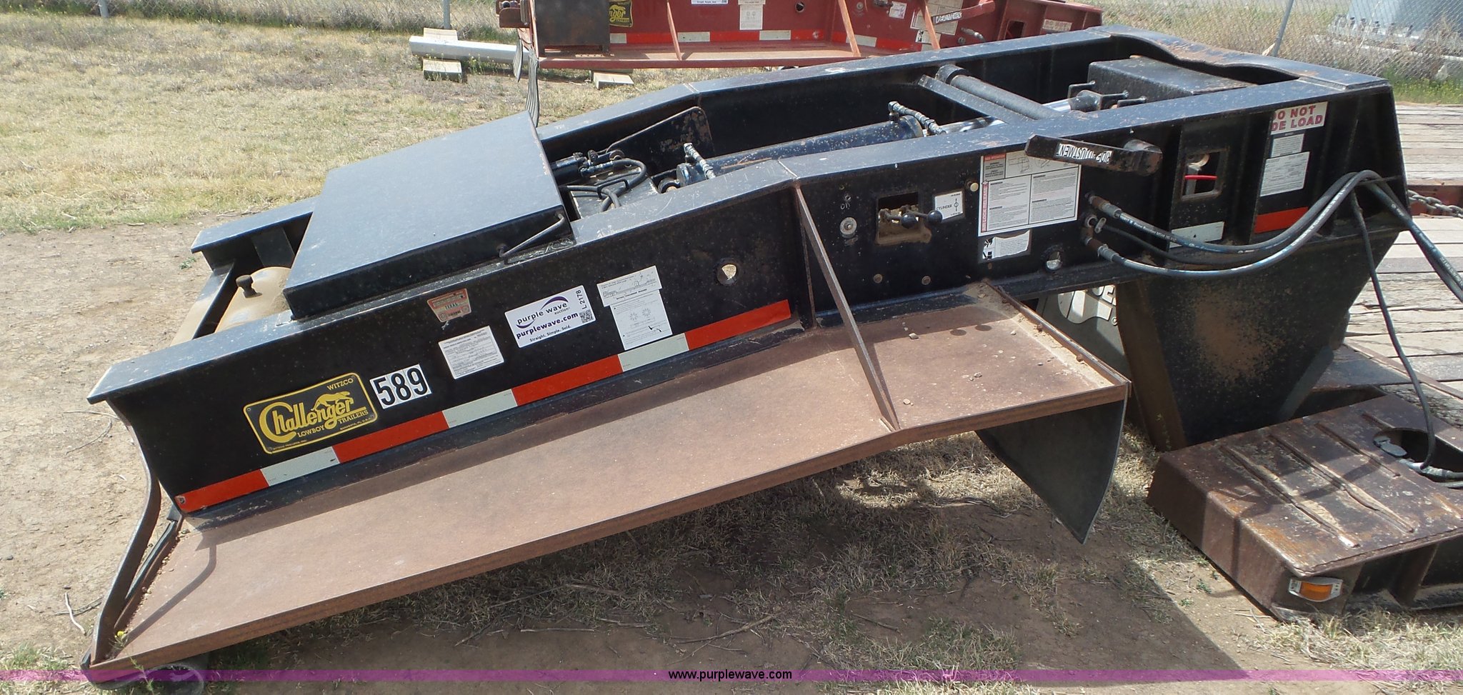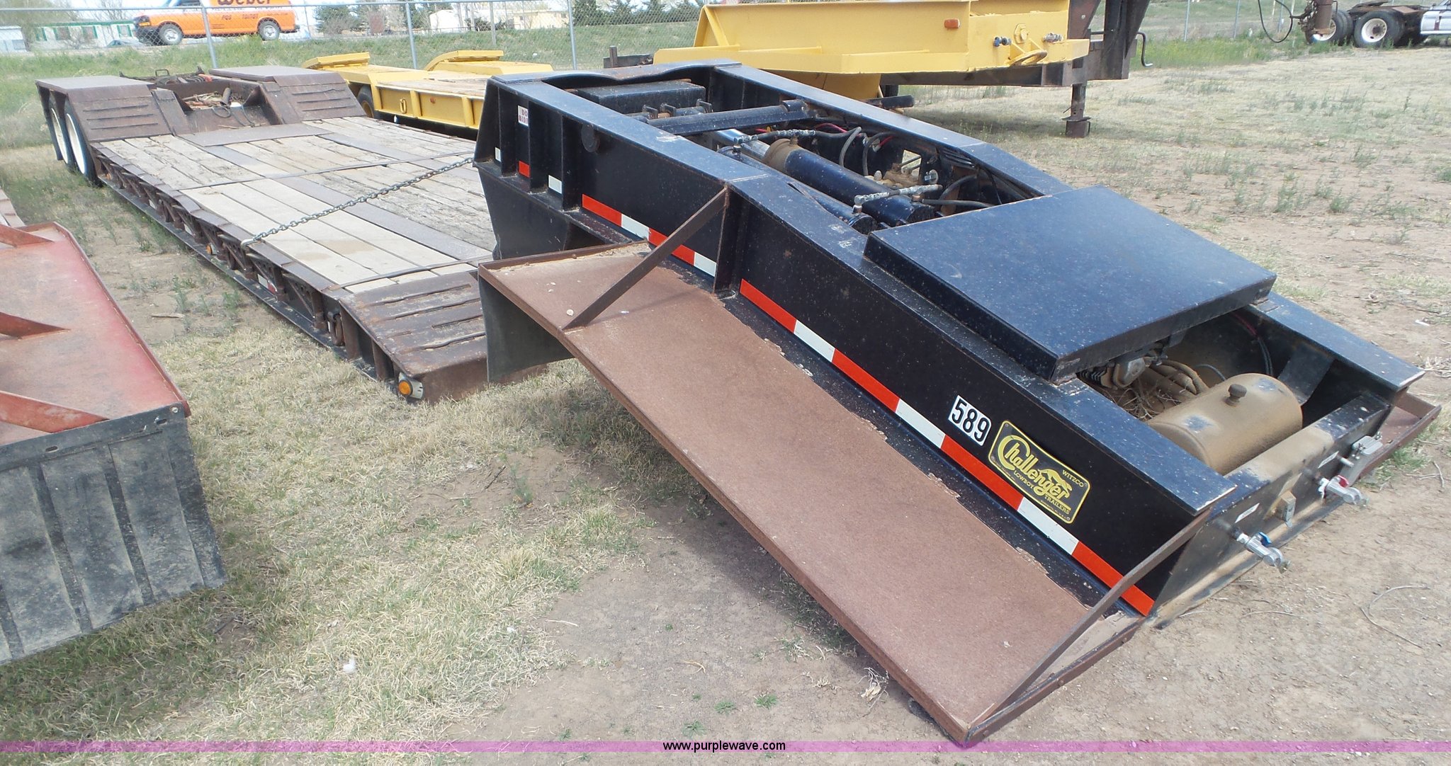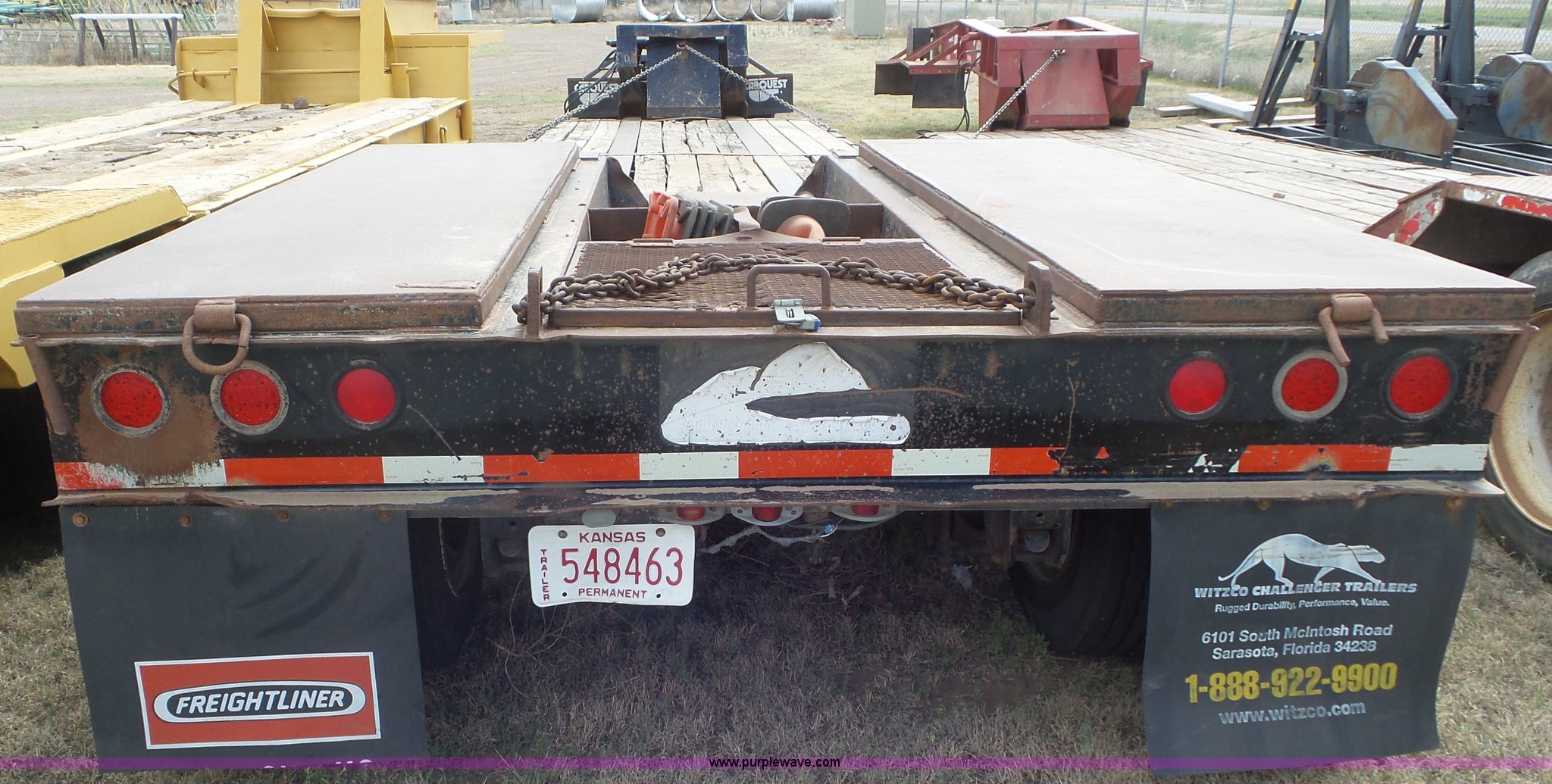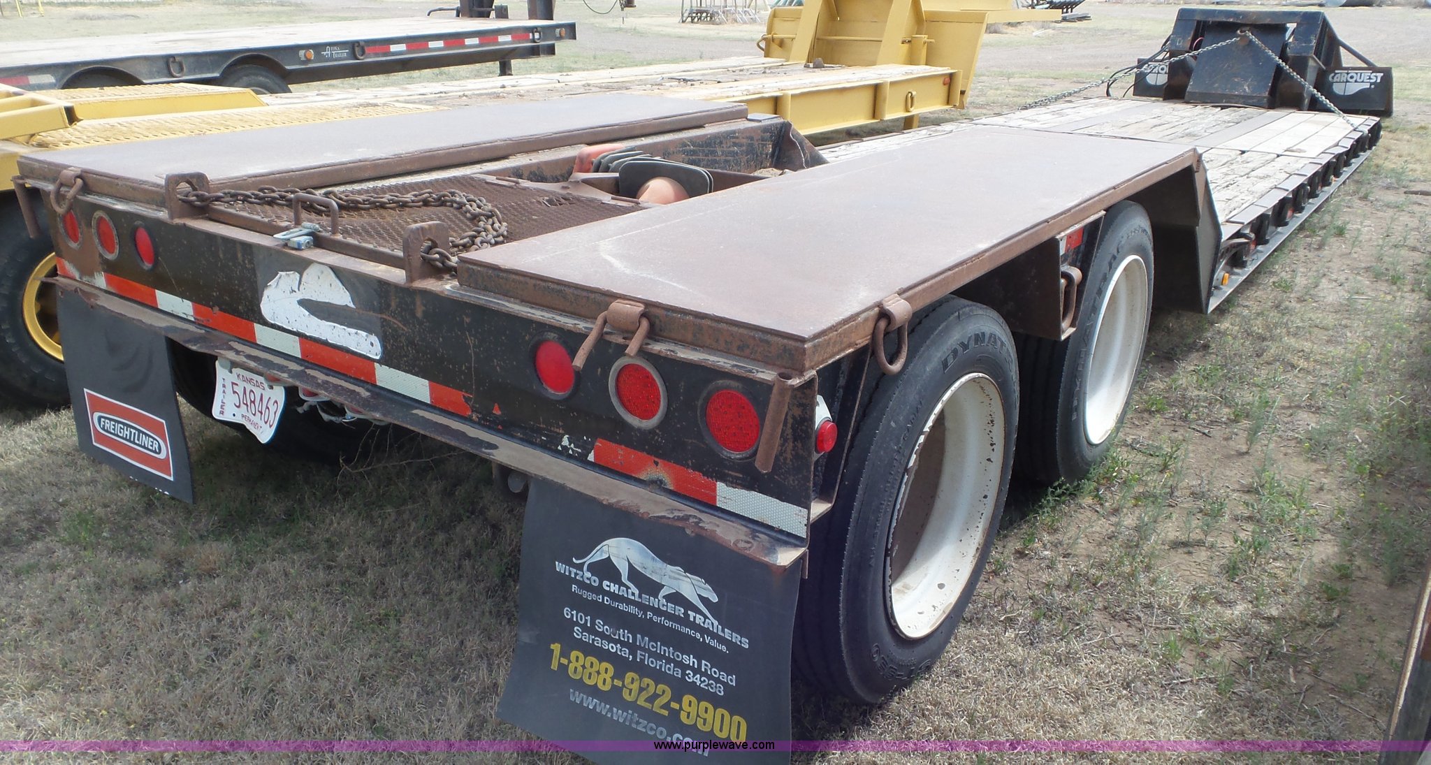 Purple Wave is selling a used Equip. Trailer in Kansas. This item is a 2006 Witzco Challenger low boy equipment trailer with the following: 45' overall length, 25'L x 101"W main deck, 9'4" upper deck, 10.5'L rear deck, 22" floor height, 12" swing out outriggers, Detachable neck, Honda GX340 gas engine, D-ring tire downs, Fifth wheel plate, Tandem axle, Spring suspension, Air brakes, 255/70R22.5 tires, GVWR 86,840 lbs, Unit# 589