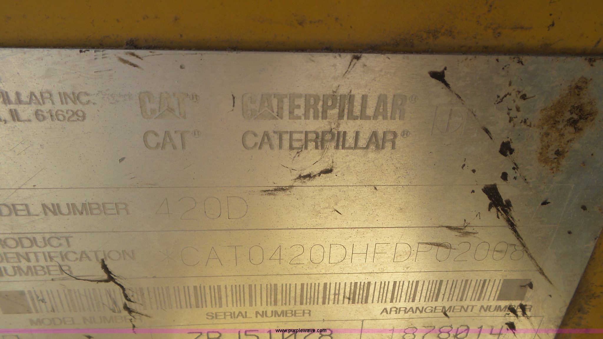 2001 Caterpillar 420D backhoe. 6,982 hours on meter, Caterpillar 3.9L four cylinder turbo diesel engine Serial 7BJ51078, Shuttle shift transmission 4F-4R gears, Four wheel drive, EROPS, AC and heat, Tilt steering wheel, Suspension seat, Pilot control Pattern changer, Wipers, Front and rear work lights, Caterpillar 9R5989 89"W loader bucket 1.25 cu. yd. capacity, Bolt-on cutting edge, E-stick, Caterpillar 24"W backhoe bucket Weld-on cutting edge, (5) teeth, Front counter weights, 12.5-80-18 front tires, 19.5L-24 rear tires, 15,772 lbs. base operating weight, Interior/exterior cosmetic damage, Serial CAT0420DHFDP02008, Unit# 305. Treco Inc.. 2871 West Oklahoma. Ulysses, KS 67880