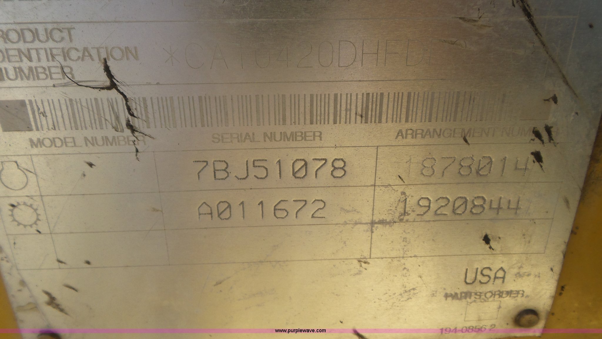 Purple Wave is selling a used Tractor Loader Backhoe in Kansas. This item is a 2001 Caterpillar 420D backhoe with the following: 6,982 hours on meter, Caterpillar 3.9L four cylinder turbo diesel engine, Serial 7BJ51078, Shuttle shift transmission, 4F-4R gears, Four wheel drive, EROPS, AC and heat, Tilt steering wheel, Suspension seat, Pilot control, Pattern changer, Wipers, Front and rear work lights, Caterpillar 9R5989 89"W loader bucket, 1.25 cu. yd. capacity, Bolt-on cutting edge, E-stick, Caterpillar 24"W backhoe bucket, Weld-on cutting edge, (5) teeth, Front counter weights, 12.5-80-18 front tires, 19.5L-24 rear tires, 15,772 lbs. base operating weight, Interior/exterior cosmetic damage, Serial CAT0420DHFDP02008, Unit# 305