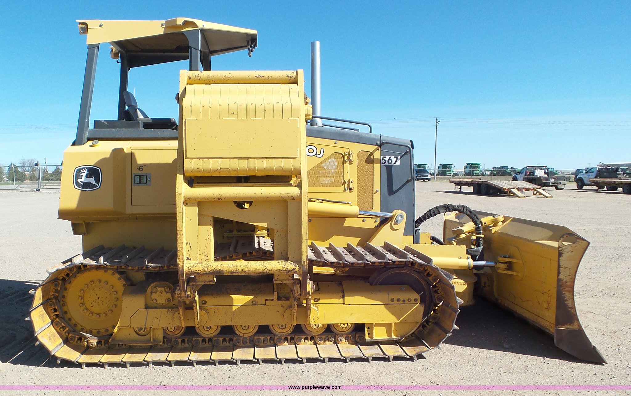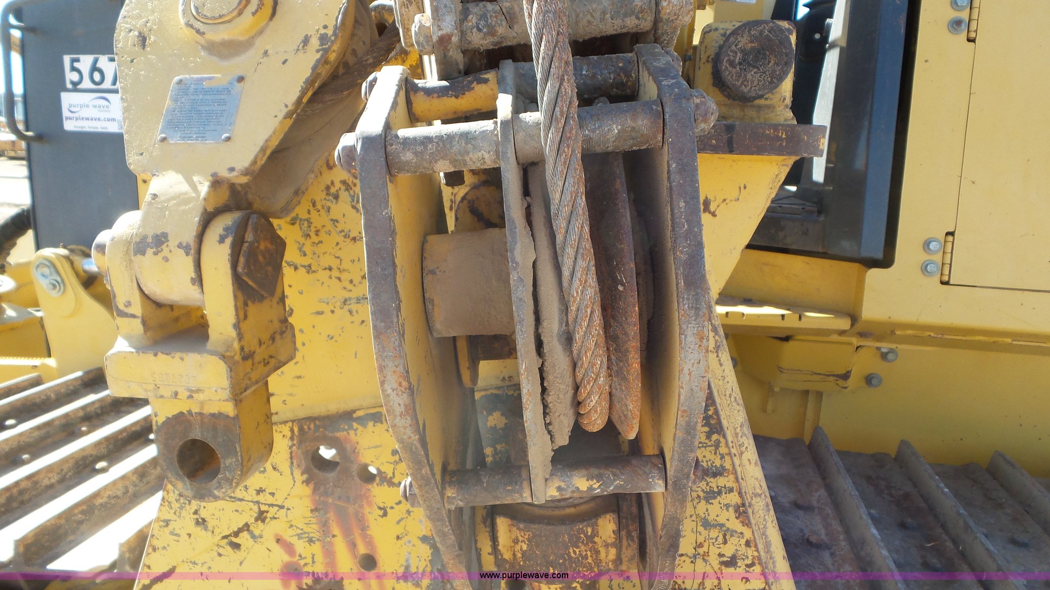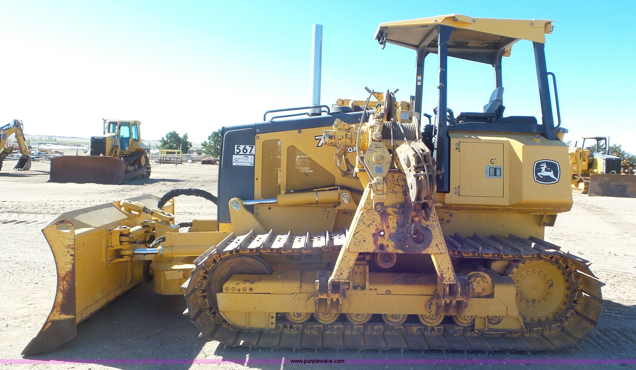 Purple Wave is selling a used Crawler Dozer in Kansas. This item is a 2005 John Deere 700J pipelayer with the following: 4,020 hours on meter, John Deere 6068TT060 6.8L six cylinder turbo diesel engine, Hydrostatic transmission, Canopy, Suspension seat, Joystick control steering, Rear work lights, 120" six-way dozer blade, Midwestern M540 pipe layer, Serial 14A0C236, Dual Winch, 15 ton capacity, Seven bottom rollers, 30" single grouser track pads, Serial TO700JX114005, Unit# 567