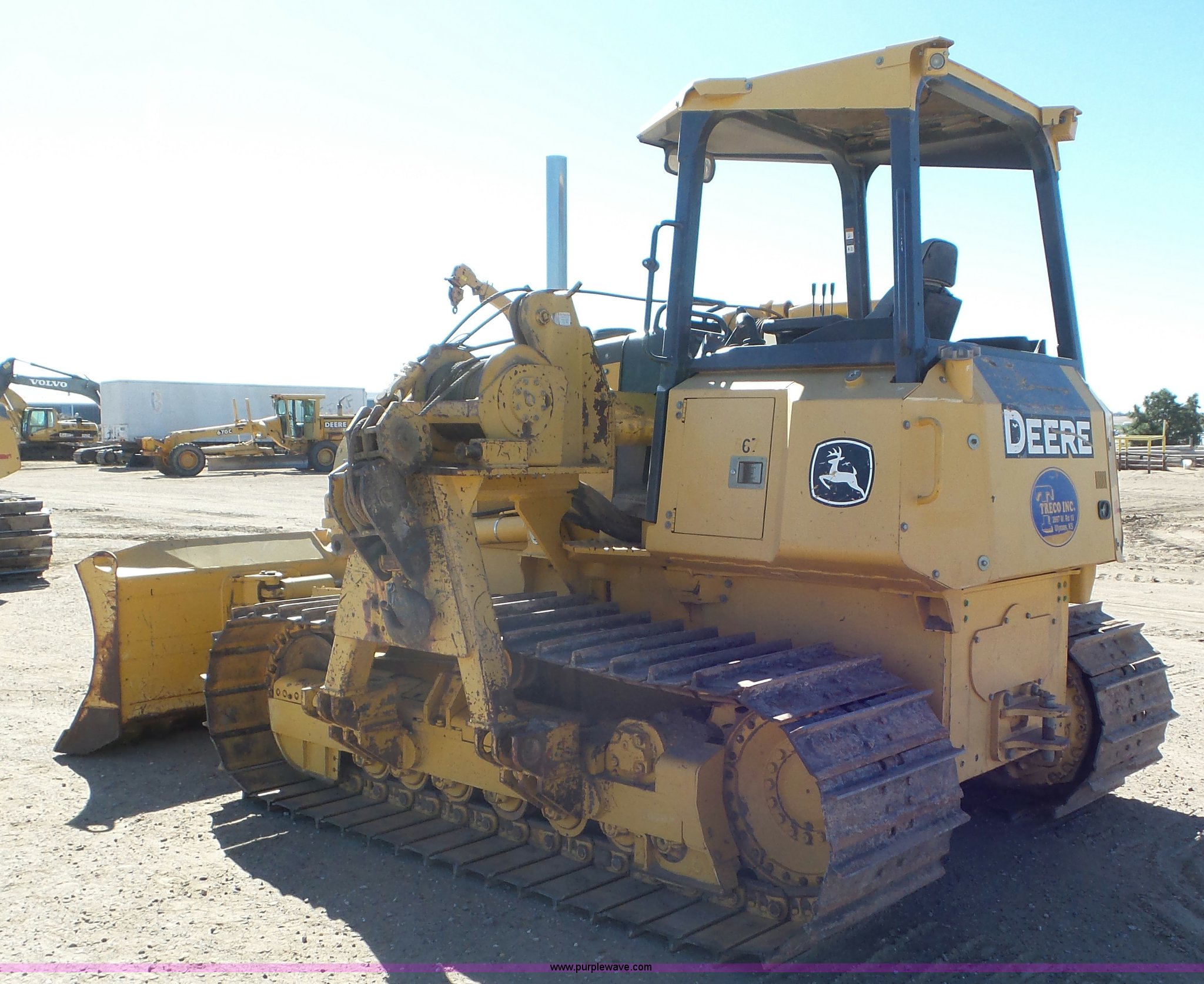 2005 John Deere 700J pipelayer. 4,020 hours on meter, John Deere 6068TT060 6.8L six cylinder turbo diesel engine, Hydrostatic transmission, Canopy, Suspension seat, Joystick control steering, Rear work lights, 120" six-way dozer blade, Midwestern M540 pipe layer Serial 14A0C236, Dual Winch 15 ton capacity, Seven bottom rollers, 30" single grouser track pads, Serial TO700JX114005, Unit# 567. Treco Inc.. 2871 West Oklahoma. Ulysses, KS 67880