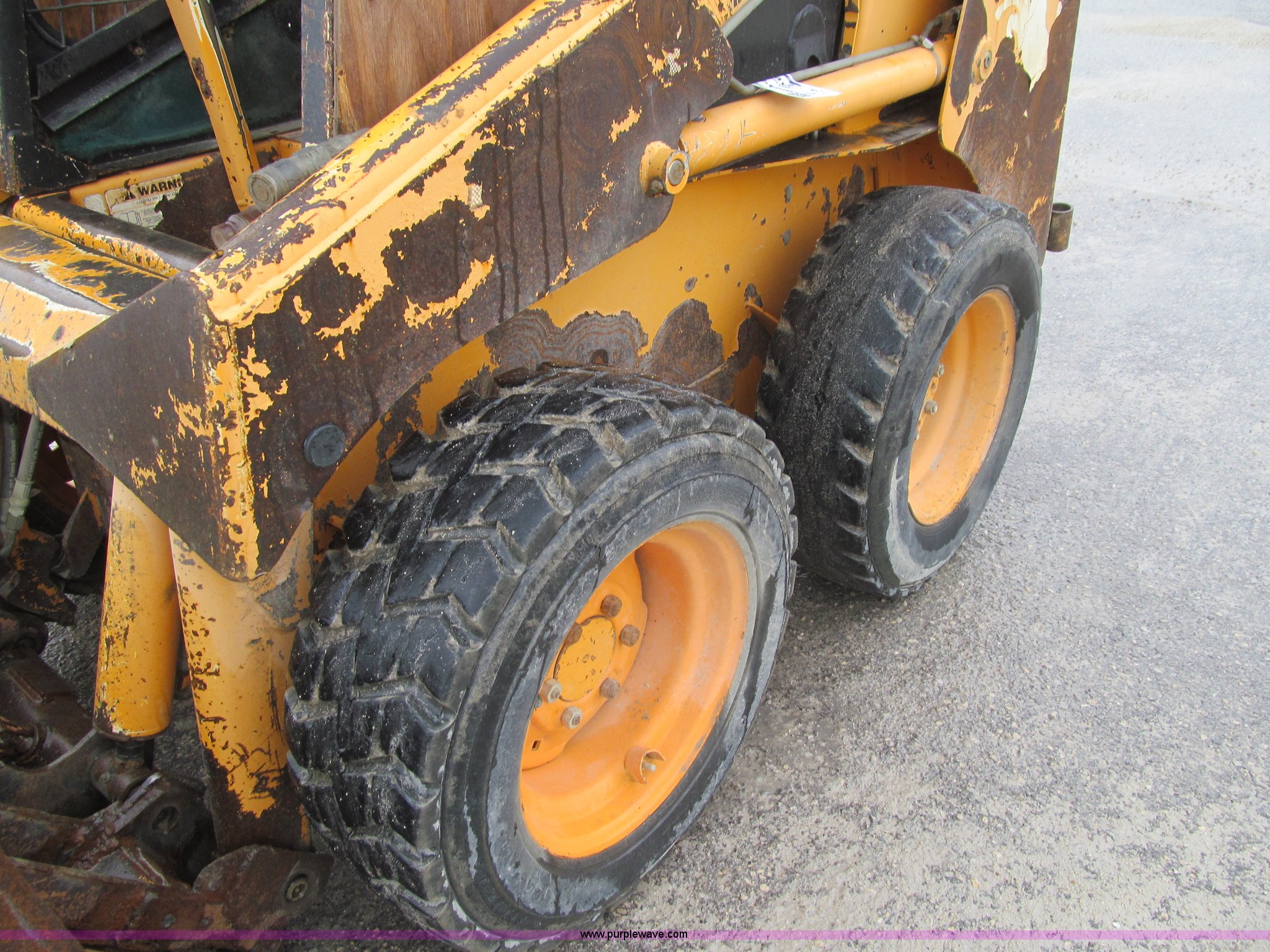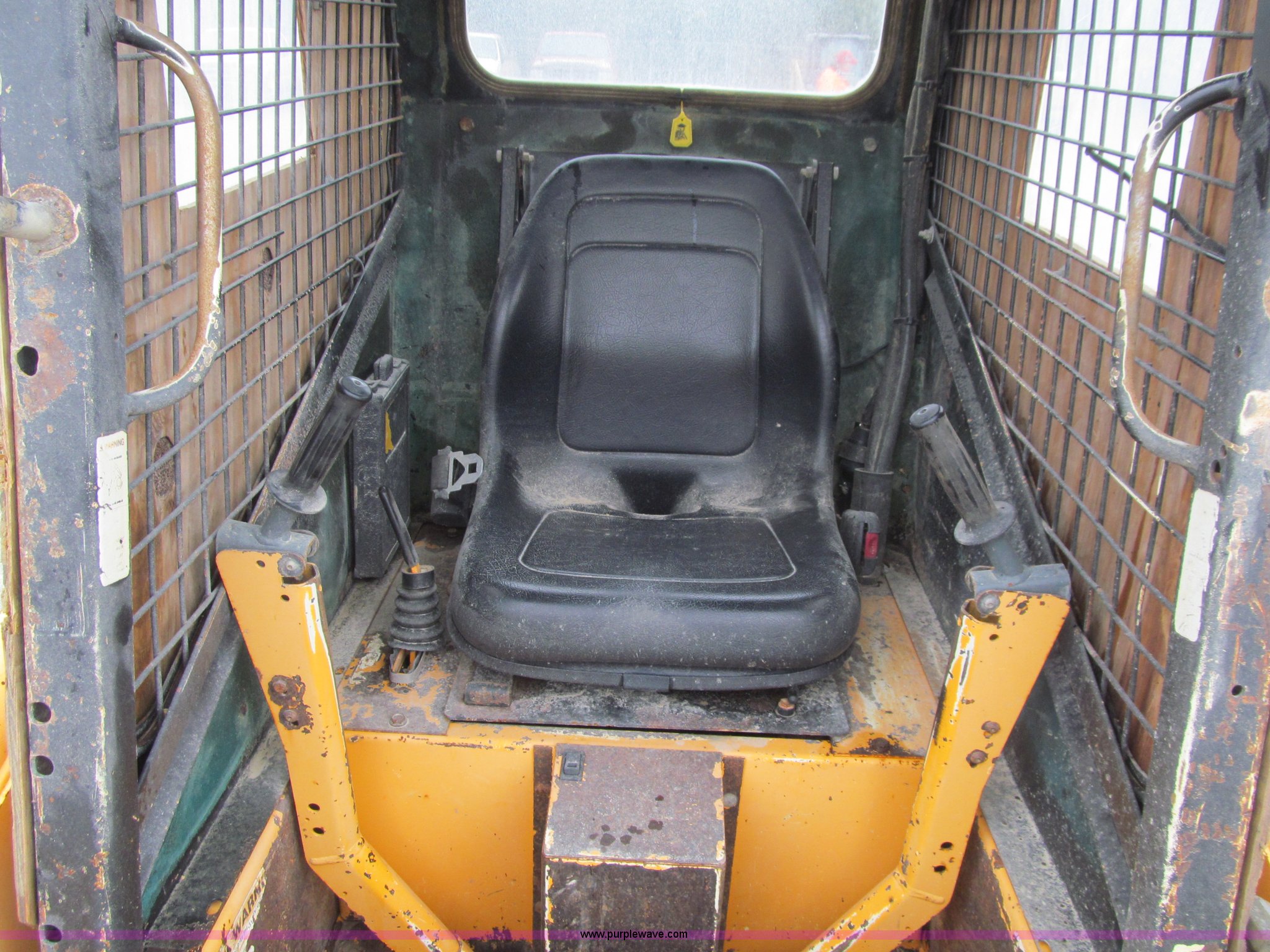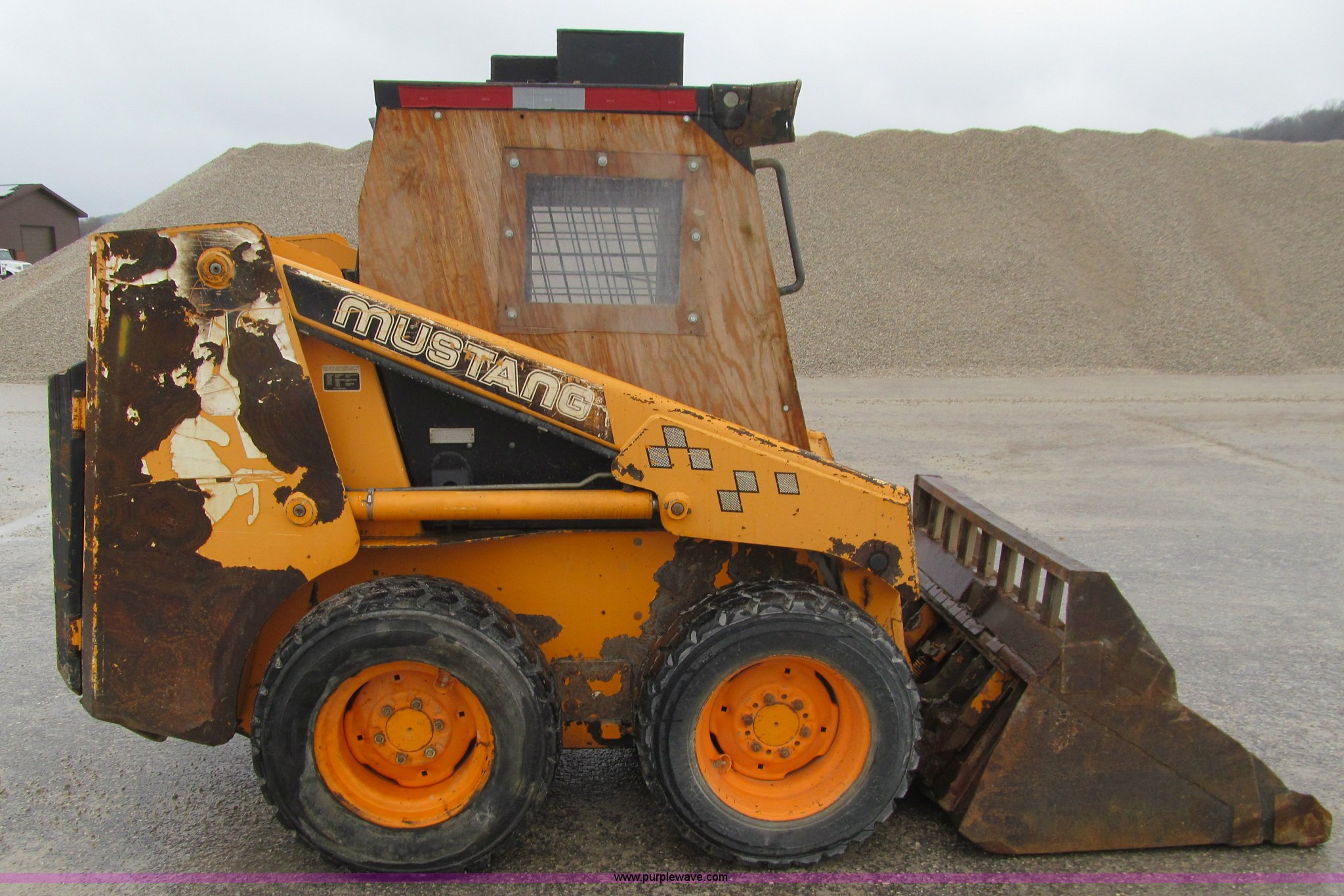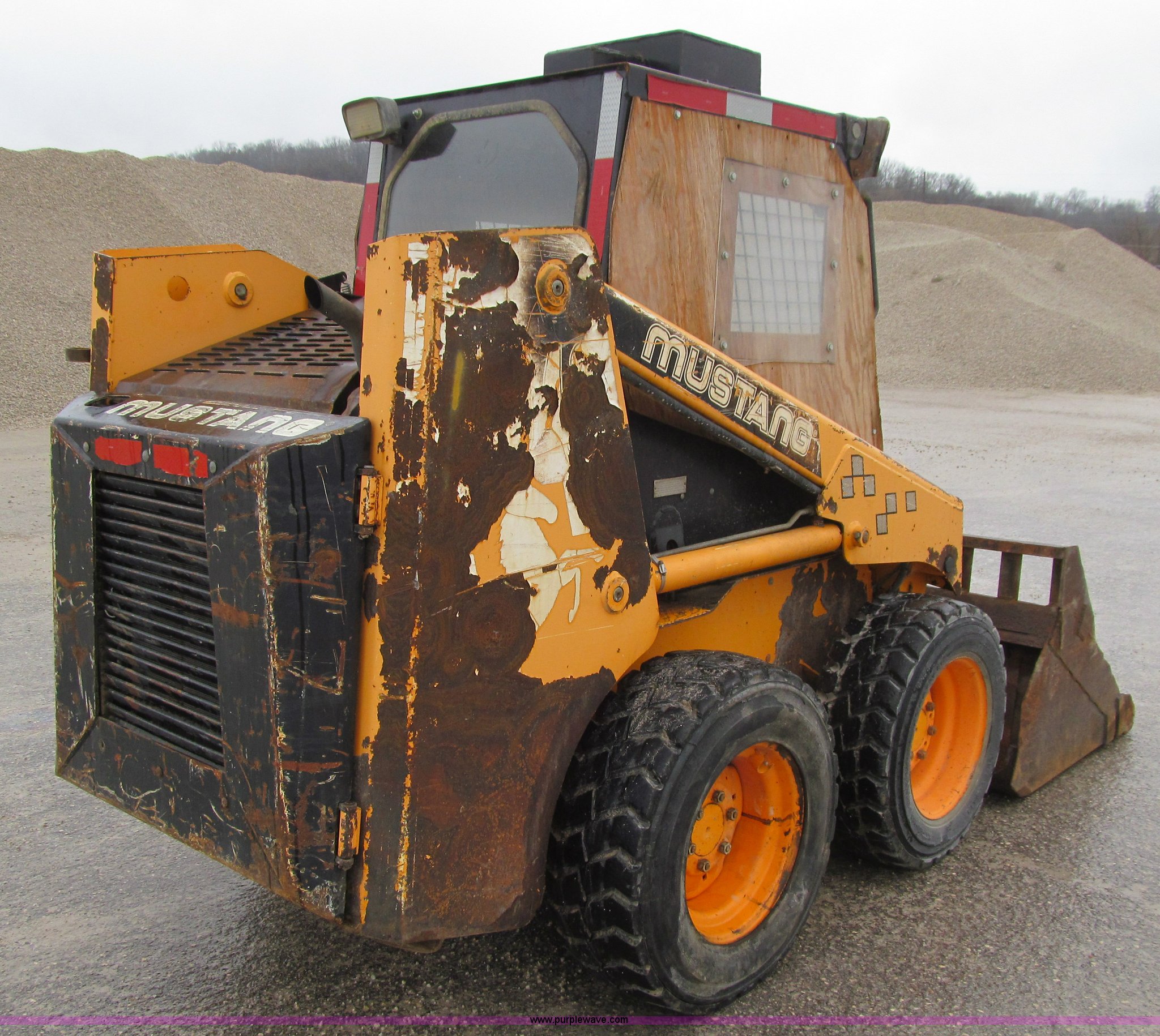 Purple Wave is selling a used Skid Steer Loader in Iowa. This item is a 1997 Mustang 2040 skid steer with the following: 6,894 hours on meter, Four cylinder diesel engine, 40 HP, Hydrostatic transmission, Open station/canopy, Heat, Hand and foot controls, 55"W bucket, Weld-on cutting edge, Manual quick coupler, Auxiliary hydraulics, 1,300 lbs maximum lift capacity, 5,300 lbs. base operating weight, Serial SF97L002057