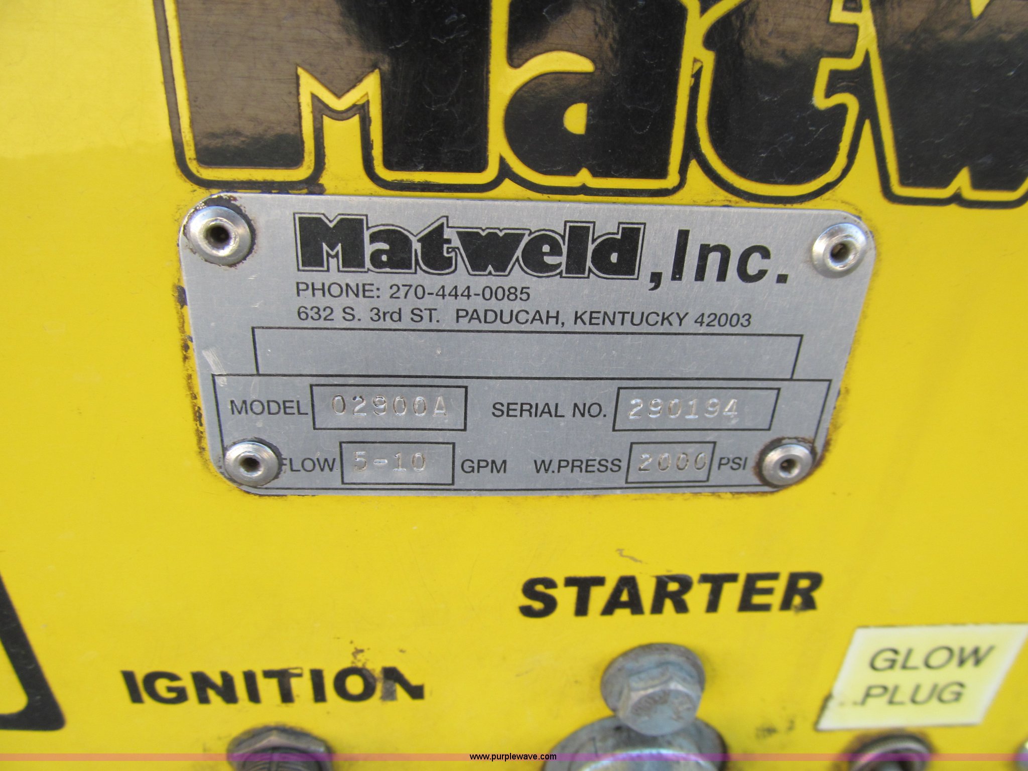 Matweld 2900A power unit. Kubota D722 three cylinder diesel engine Glow plugs, 5 to 10 gallon per minute capacity at 2,000 psi, (3) hose reels, Serial 290194. West Des Moines, IA 50265