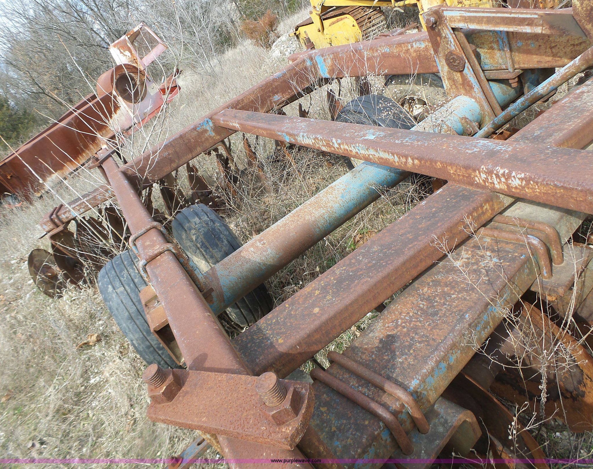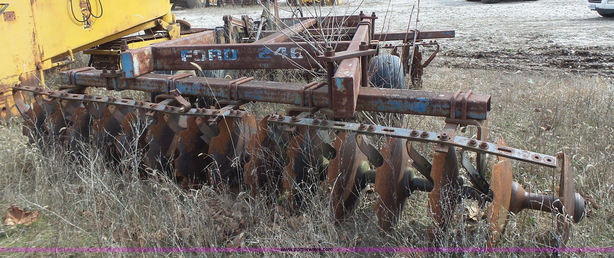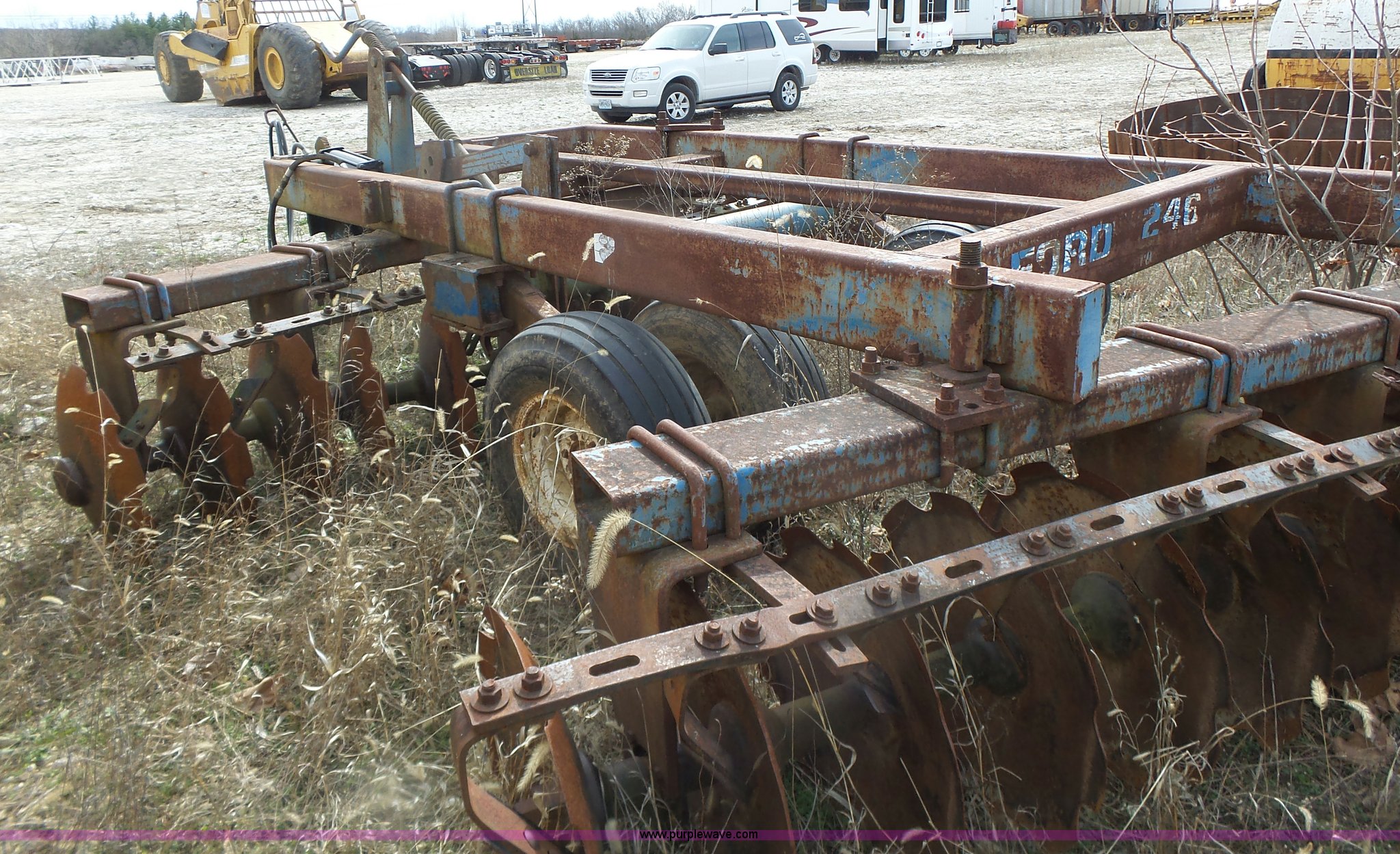 Purple Wave is selling a used Disk in Missouri. This item is a Ford 246 disk with the following: 13'W, 24" front and rear blades, 12" spacing, Disk scrapers, Hydraulic lift, Manual leveler, Pin hitch, 12.5-15 tires, Serial WN01366