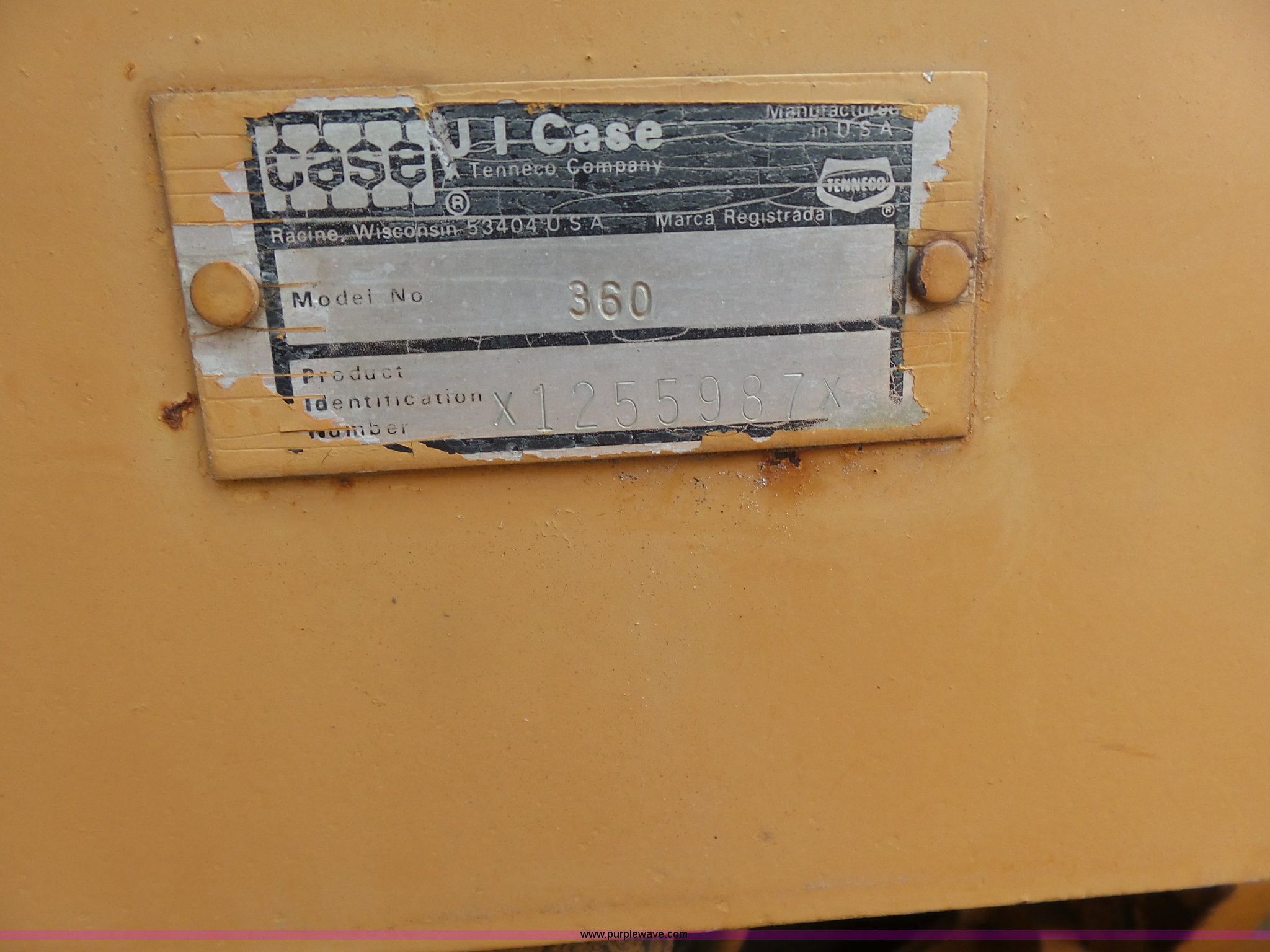 Case 360 trencher. 1,069 hours on meter, Deutz two cylinder diesel engine, Hydrostatic transmission, Roll bar, Trencher 3' maximum digging depth, 15"W backhoe bucket, 5'W back fill blade, 26 x 12.00-12 tires, Pivot on trencher worn, Recently replaced blower belts on engine, seat, filters, and ignition switch, Recently rebuilt starter and backfill blade hydraulic cylinder, Serial X1255987. Mid American Equipment. Wichita, KS 67201