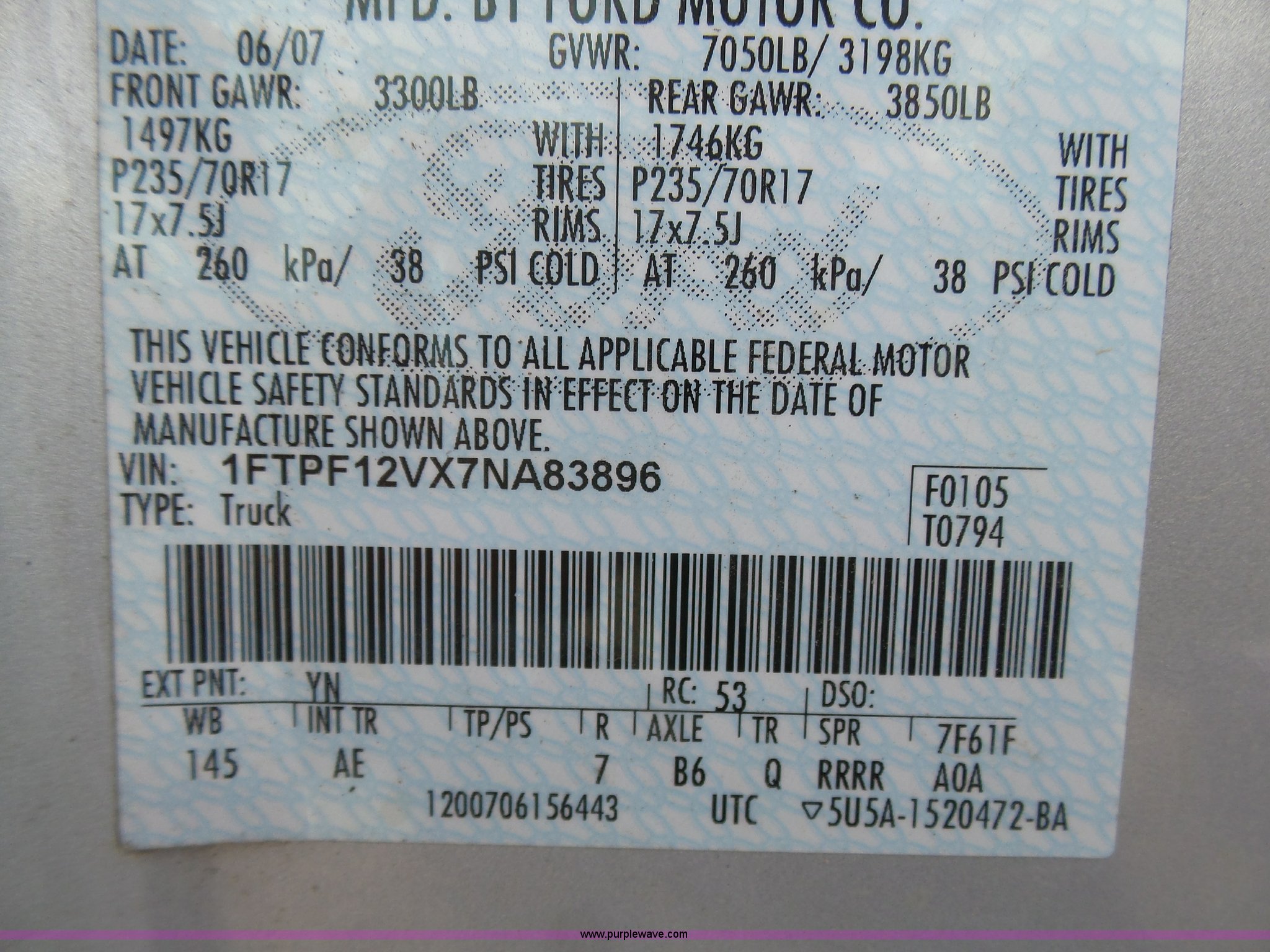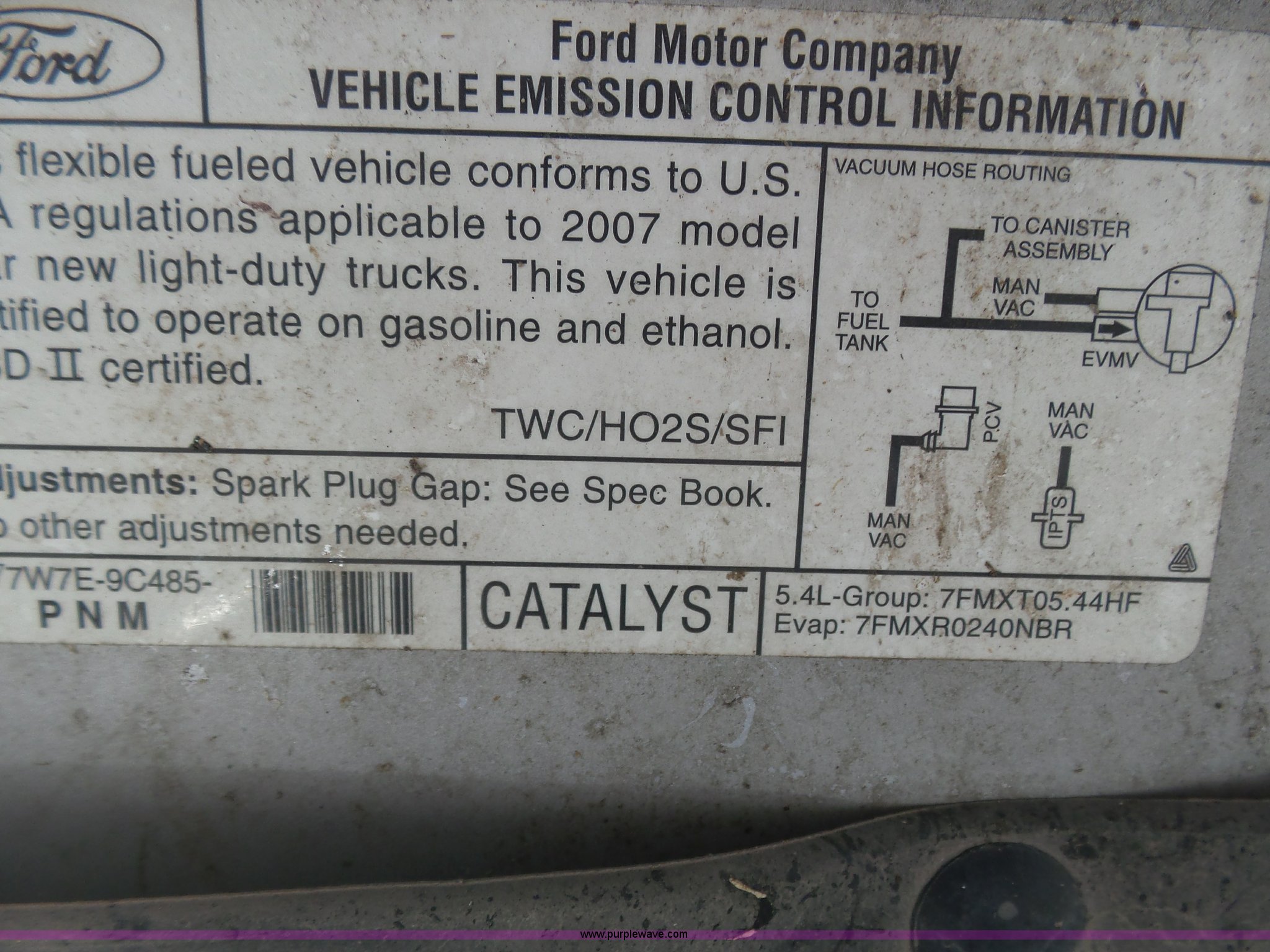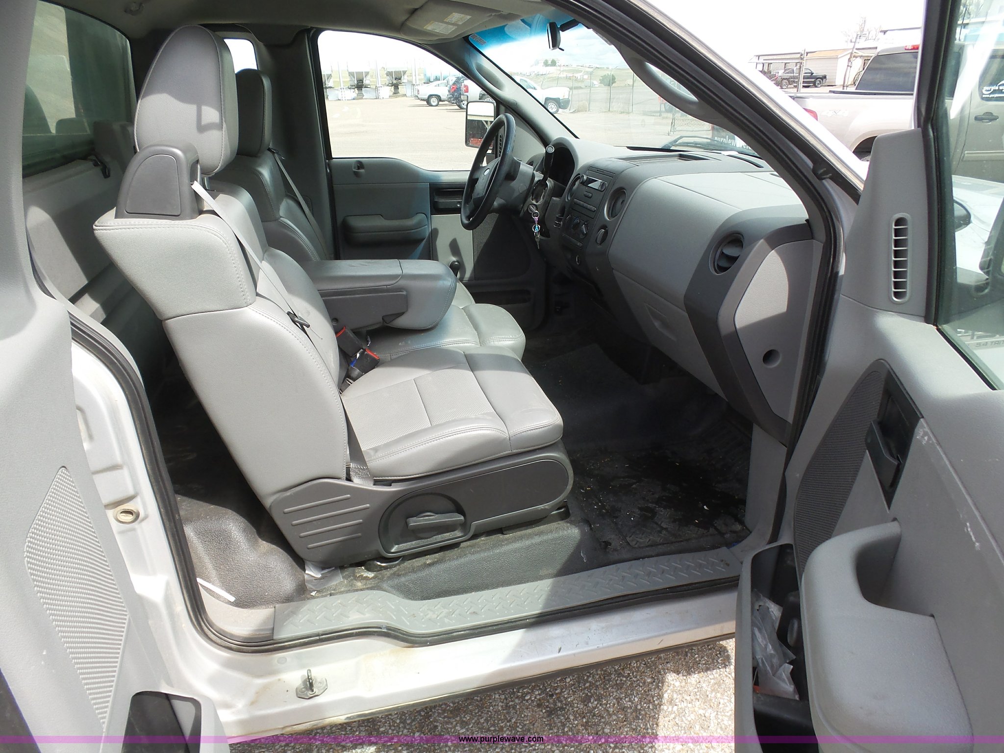 Purple Wave is selling a used 1/2 Ton Pickup or Van in Kansas. This item is a 2007 Ford F150 XL pickup truck with the following: 173,499 miles on odometer, 5.4L V8 SOHC 24V FFV gas engine, Automatic transmission, AC and heat, Tilt, Cruise, Manual windows and locks, Vinyl interior, Topper, Receiver hitch, Trailer wiring, P235/70R17 tires, Engine runs rough, Check engine light is on, One bad cylinder, Interior/exterior cosmetic damage, Drivers seat torn, Windshield cracked