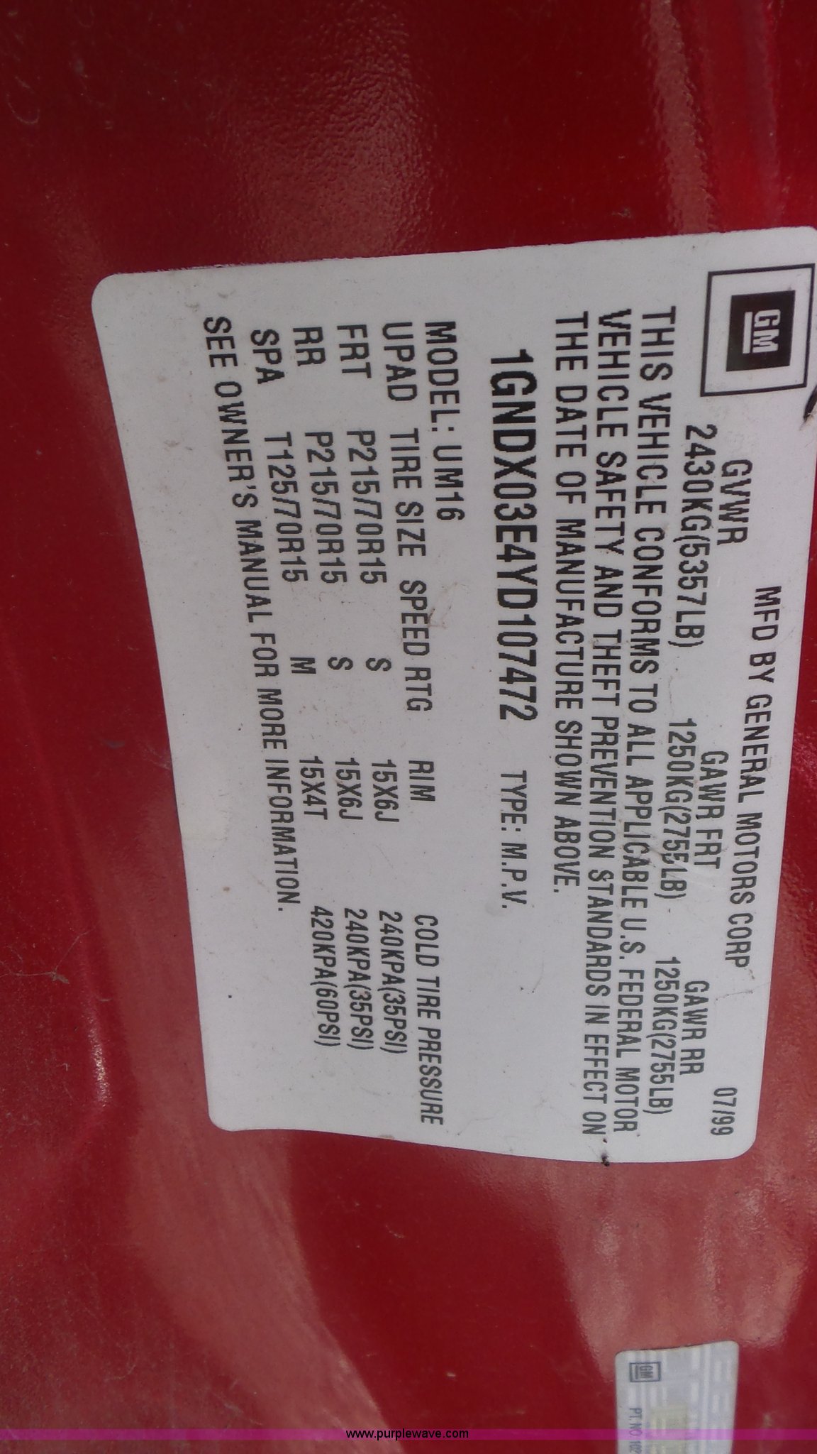 Purple Wave is selling a used Passenger Vehicle in Kansas. This item is a 2000 Chevrolet Venture Extended van with the following: Unknown miles on odometer, 3.4L V6 OHV 12V gas engine, Automatic transmission, AC and heat, Tilt, Cruise, AM/FM/CD, Power windows, locks, mirrors, and seat, Cloth interior, 215/70R15 tires, Interior/exterior cosmetic damage, Dead battery, Unknown operating condition