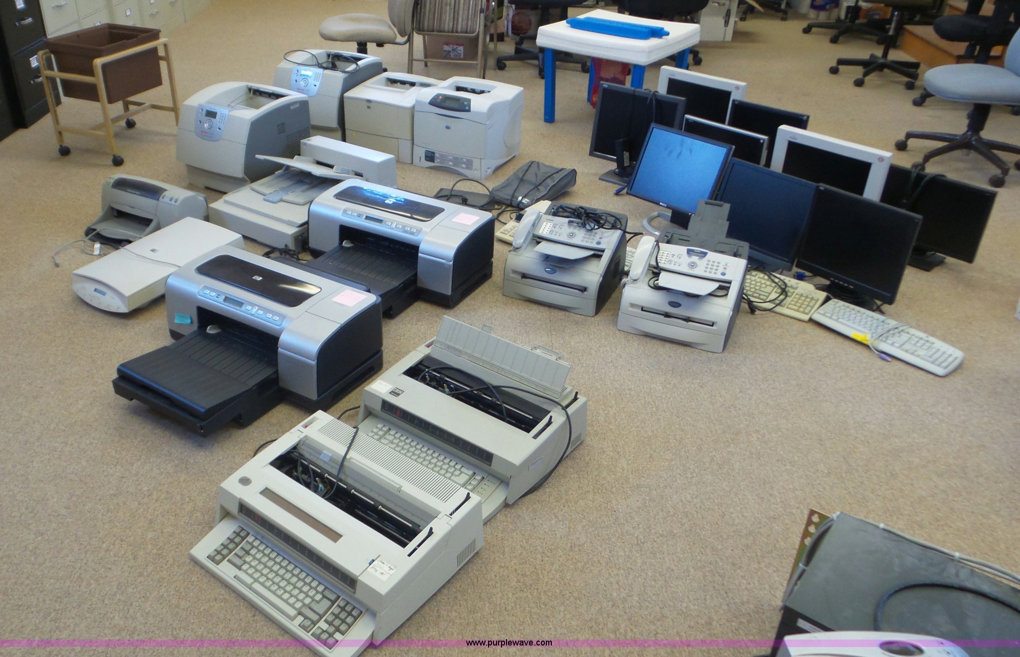 Purple Wave is selling a used Office Supplies and Equip. in Kansas. This item is a Office supplies with the following: (2) HP computers, Double sight dual screen monitor, 19" screens, (2) Fujitsu scanners, (2) HP Business InkJet 2800 printers, (2) Brother fax machines, HP ScanJet 7400C scanner, (4) HP printers, (2) Ricoh IBM printers, (4) IBM splitters, (3) keyboards, (3) 18" monitors, (7) 16" monitors, Various brands, (3) cart/tables, Canon scanner, (3) two drawer card filing cabinet, 20" monitor, Ticket machine