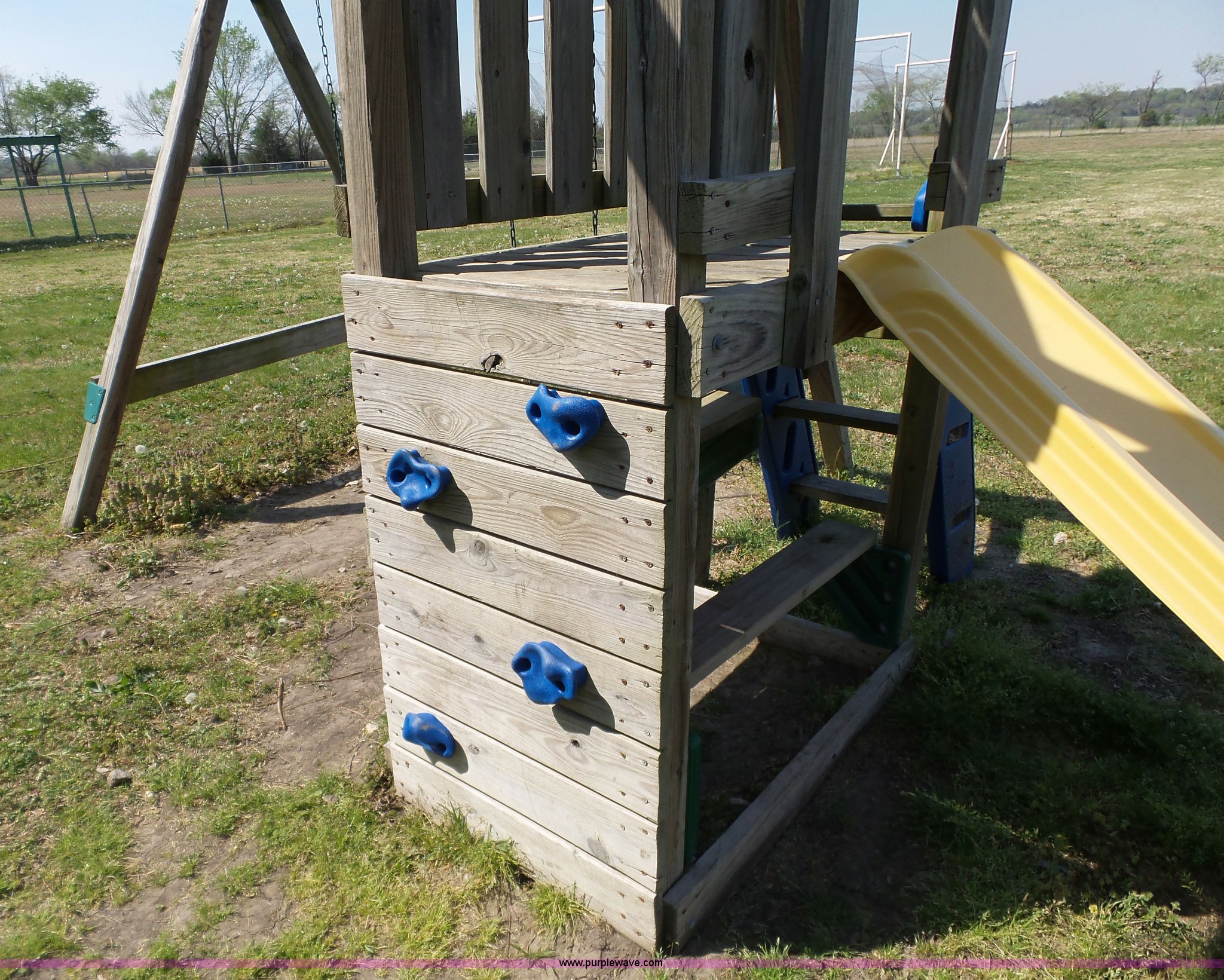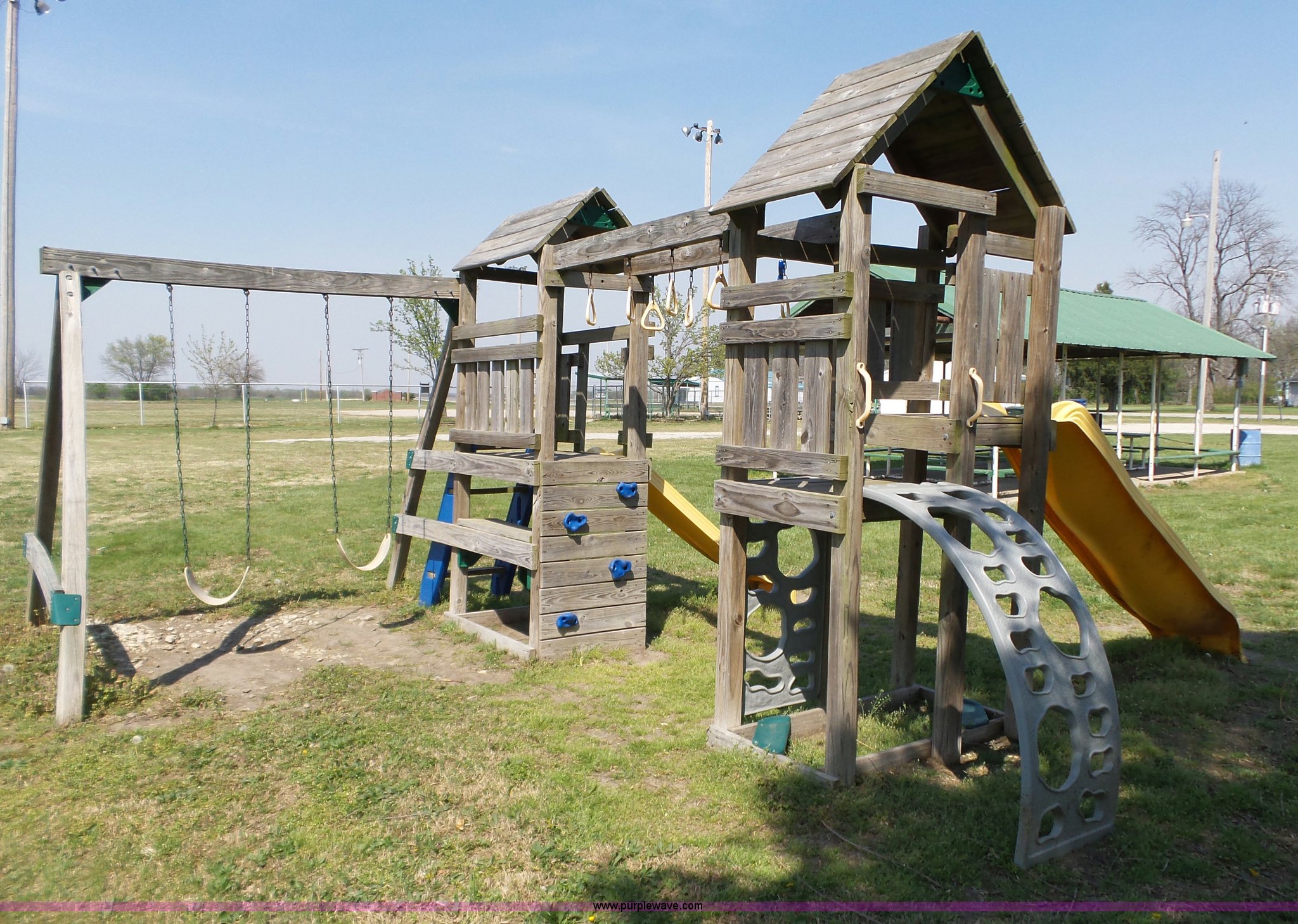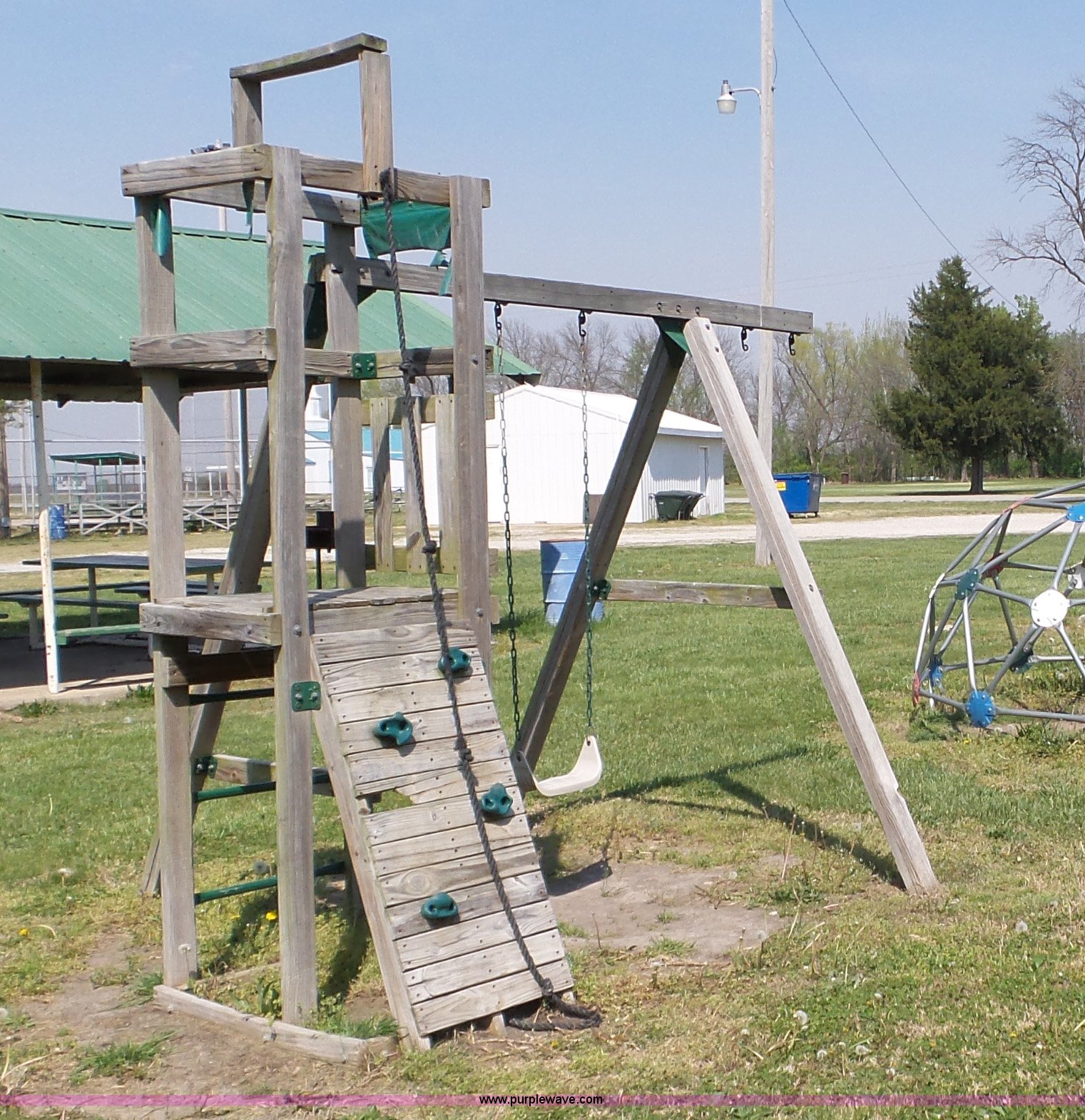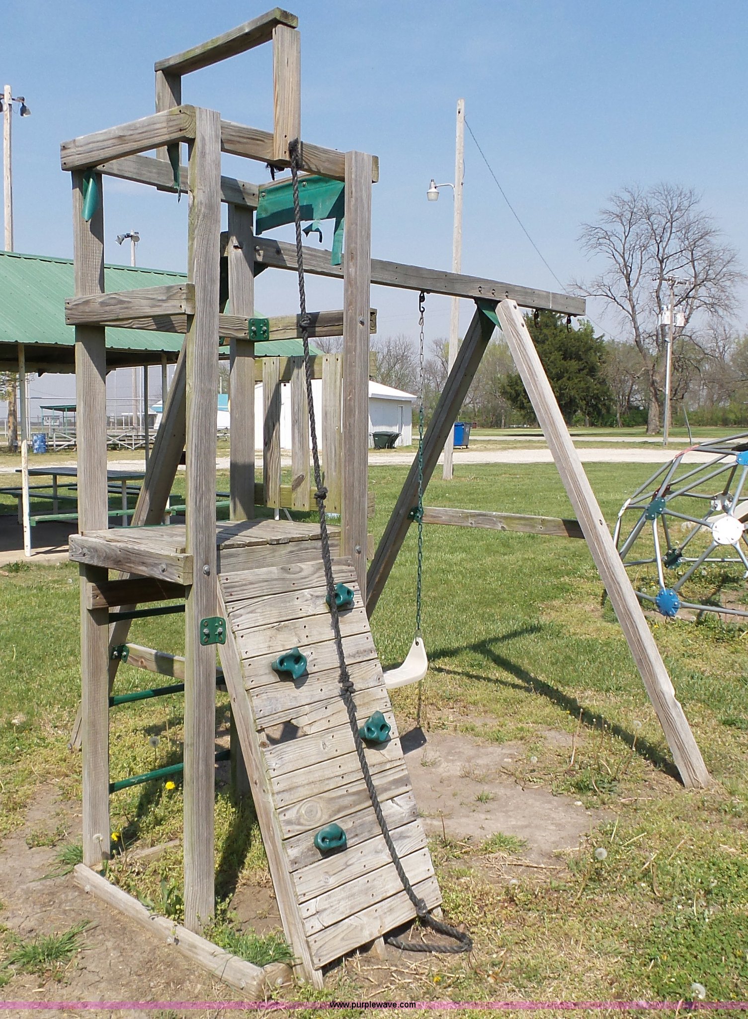 Purple Wave is selling a used Sporting Goods in Kansas. This item is a Playground equipment with the following: Swing, Climbing wall, Monkey bars, Climbing ball and more