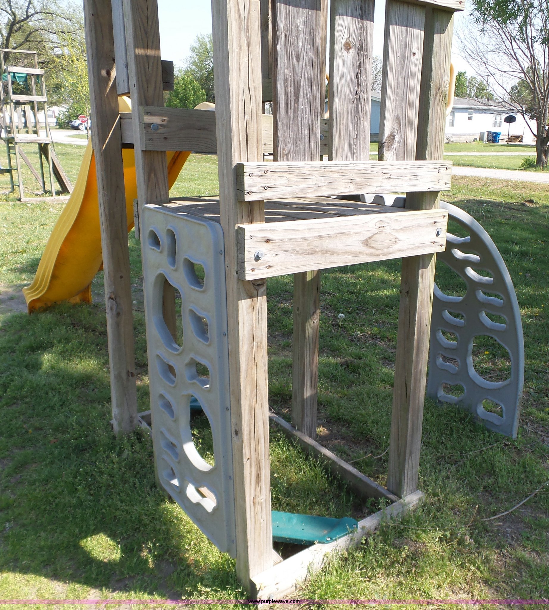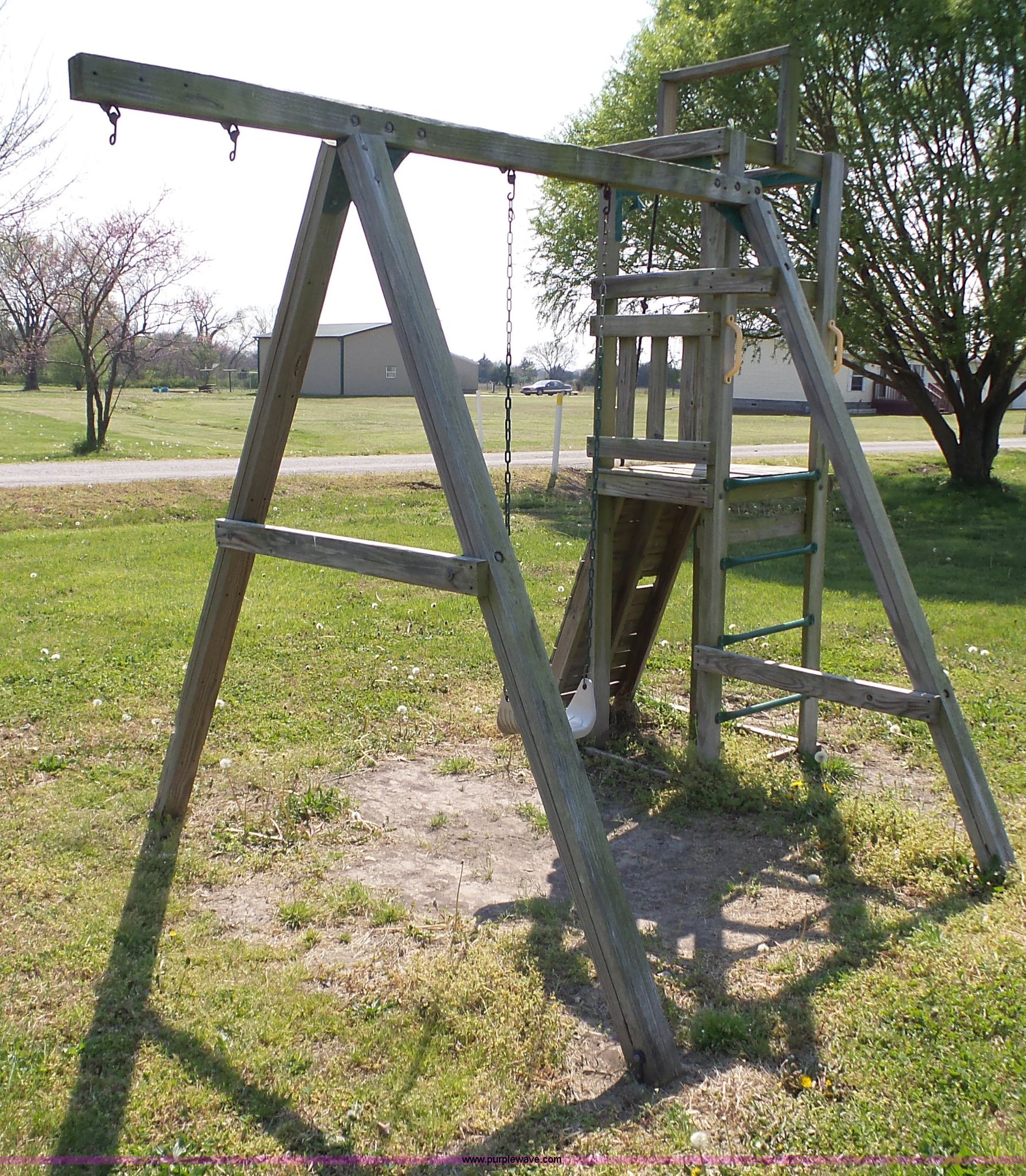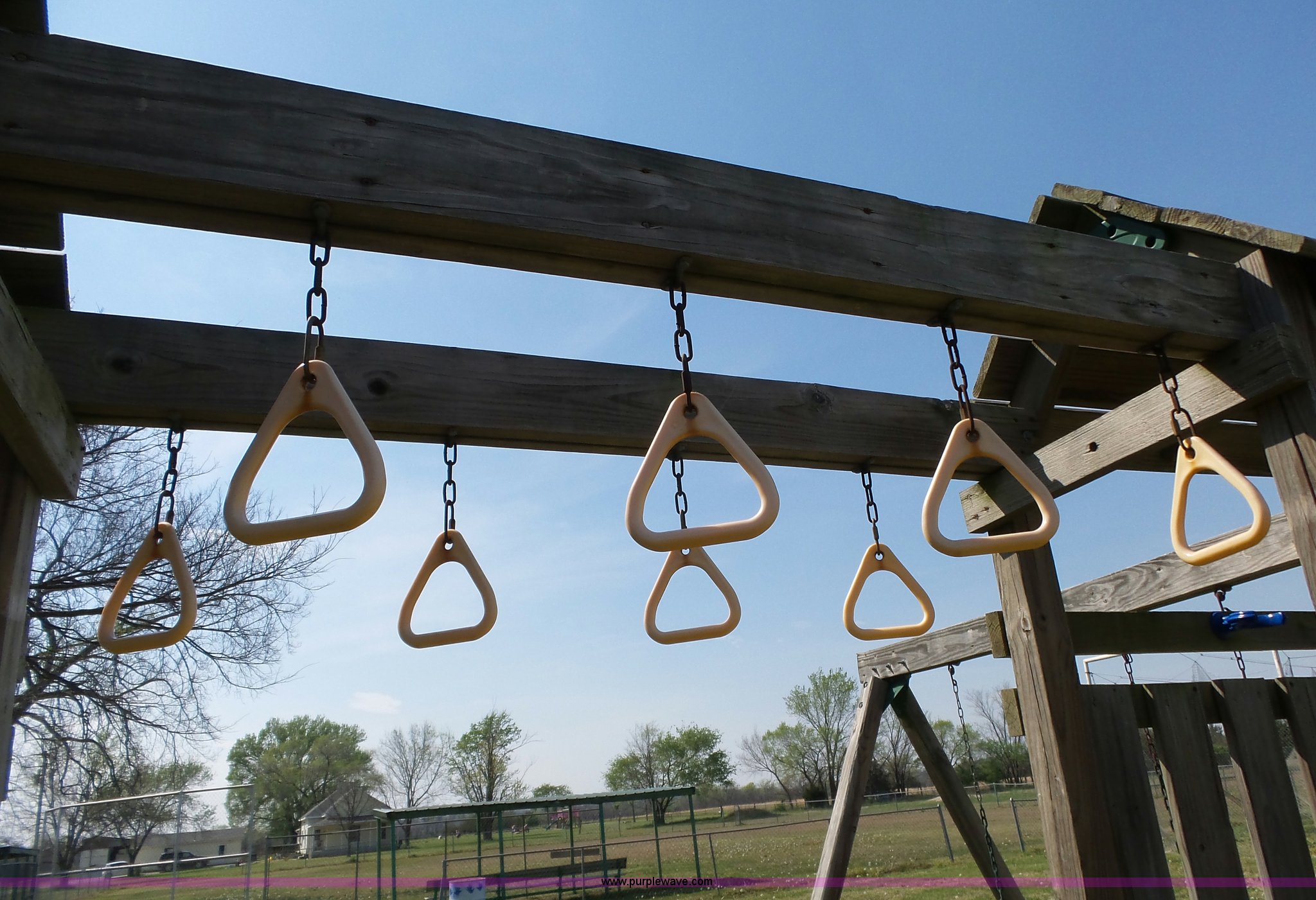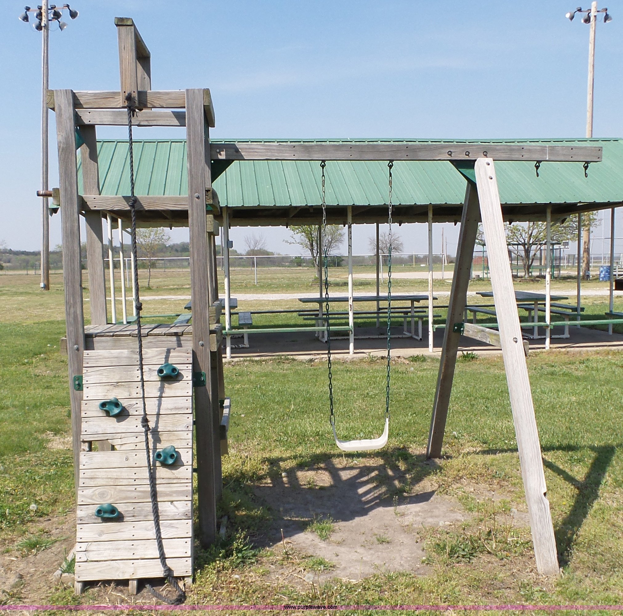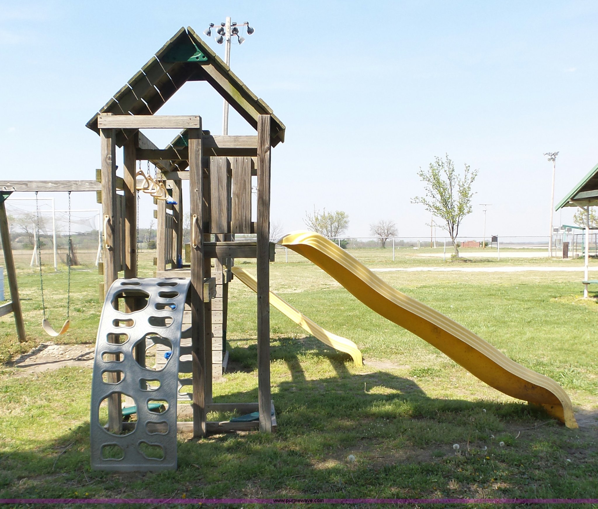 Purple Wave is selling a used Sporting Goods in Kansas. This item is a Playground equipment with the following: Swing, Climbing wall, Monkey bars, Climbing ball and more