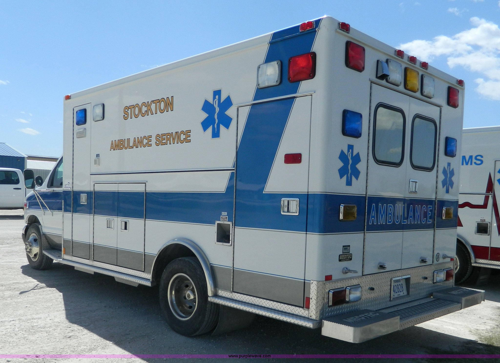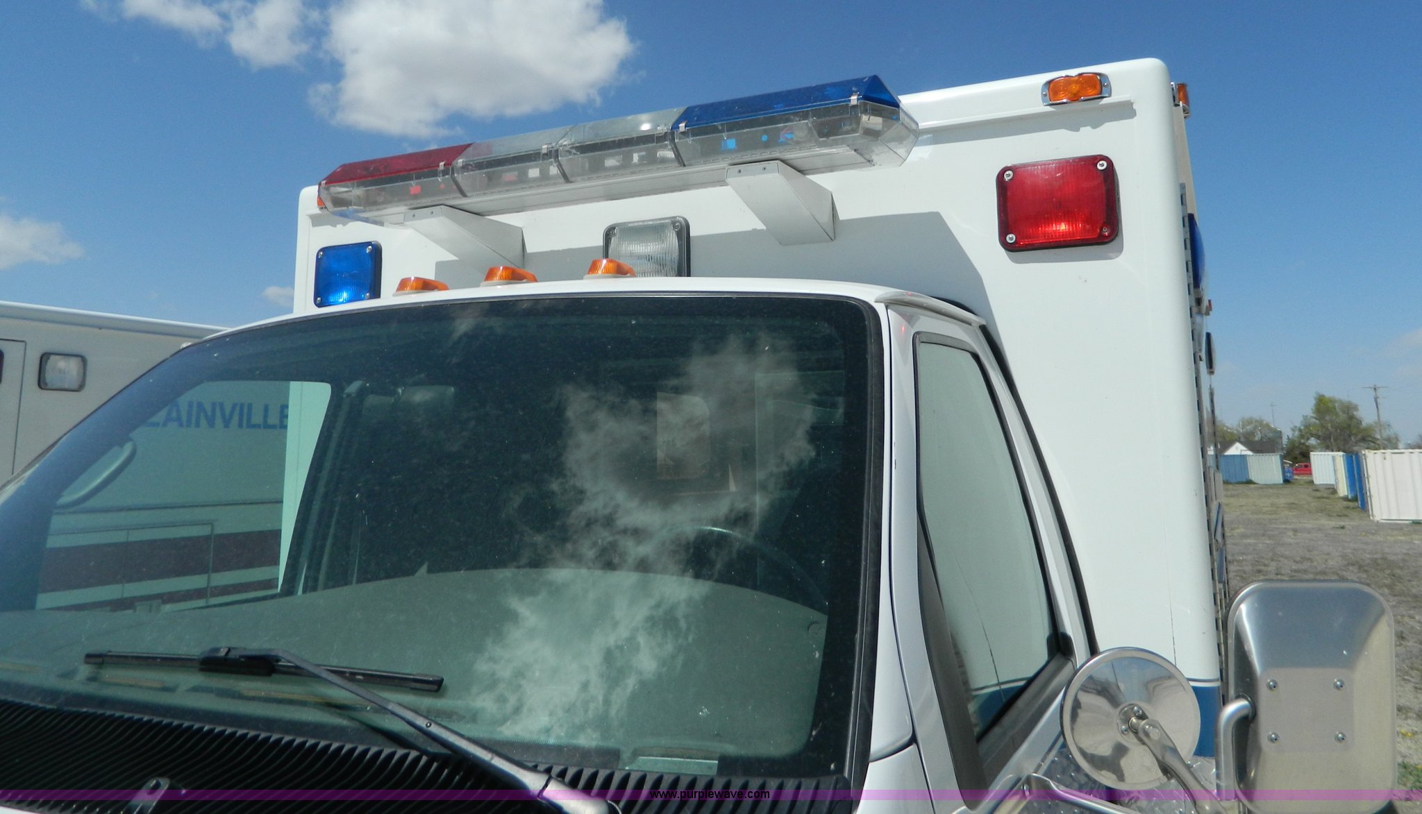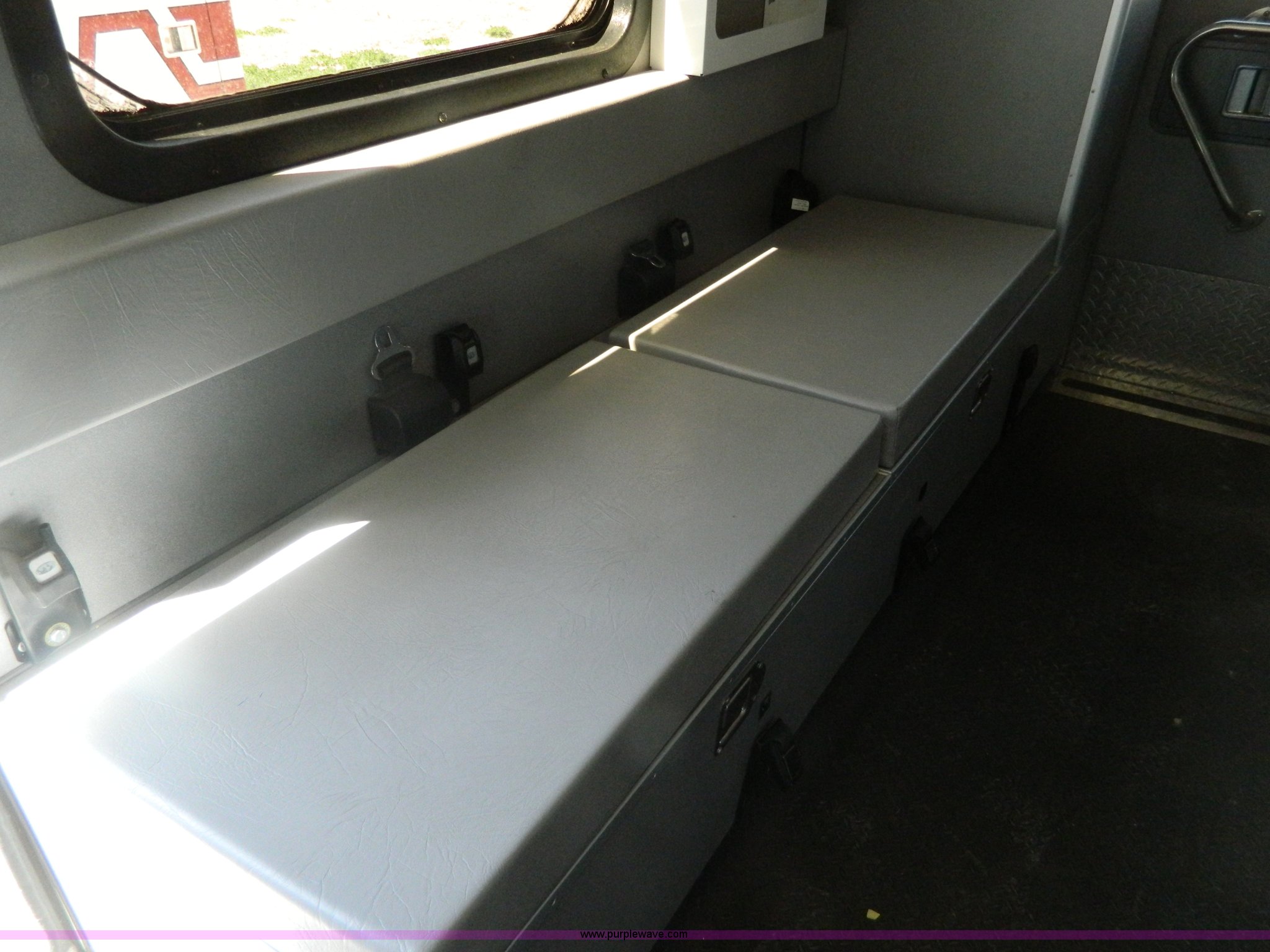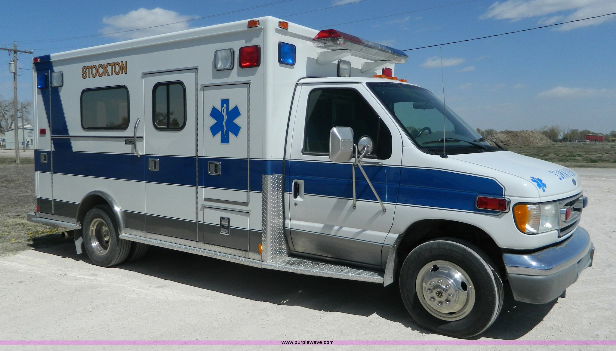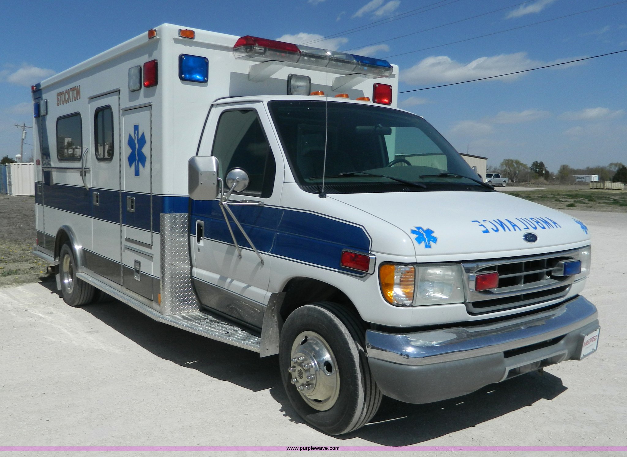 Purple Wave is selling a used Fire Truck or Emergency Vehicle in Kansas. This item is a 2002 Ford 801 ambulance with the following: 65,115 miles on odometer, 2,636 hours on meter, 7.3L V8 OHV 16V diesel engine, Automatic transmission, AC and heat, Tilt, Cruise, AM/FM/CD, Power windows and locks, Cloth interior, On-board power inverter, PA system, Siren, Light bar, Medec body, 225/75R16 tires, GVWR 14,050 lbs, Chipped windshield