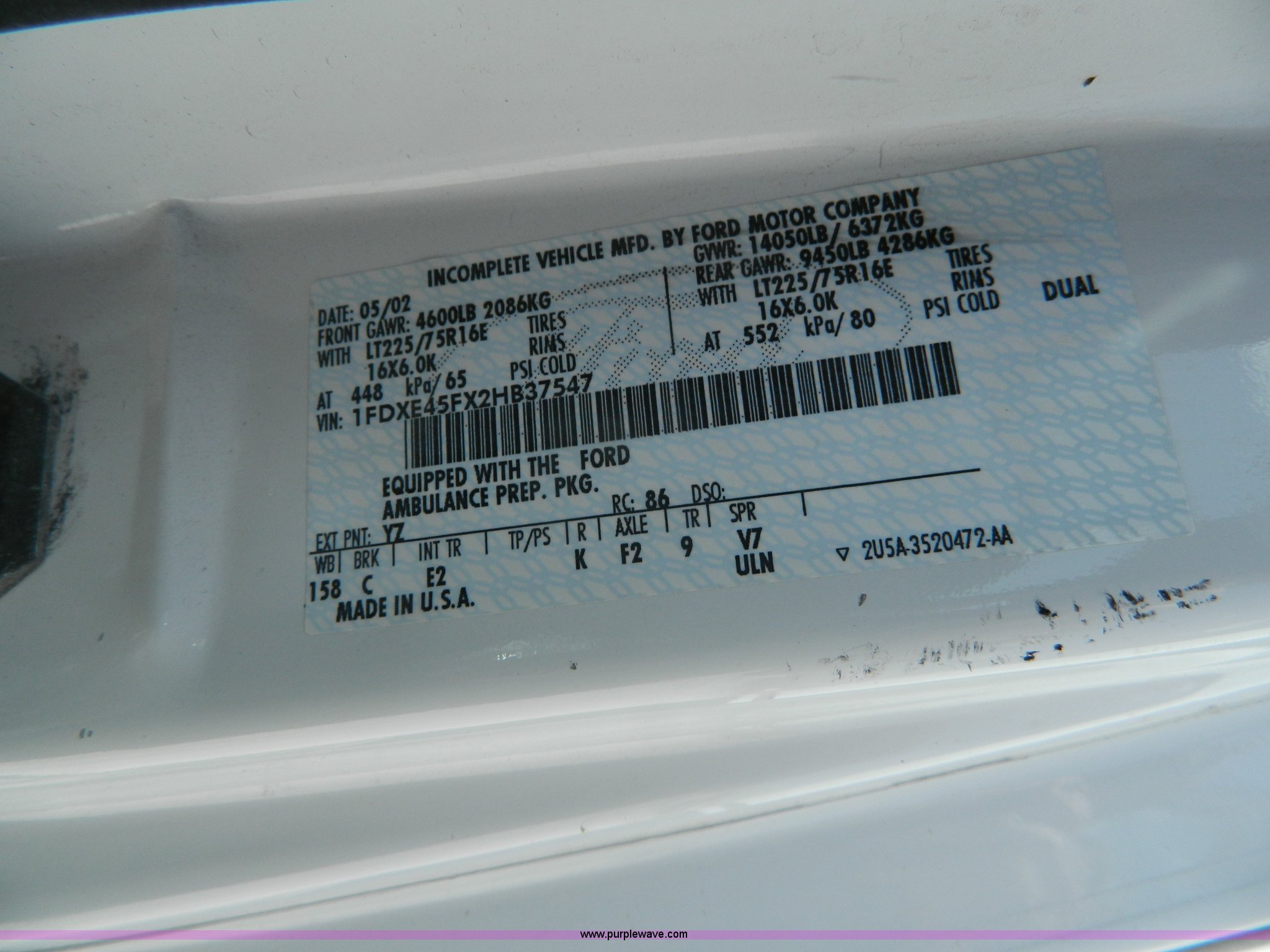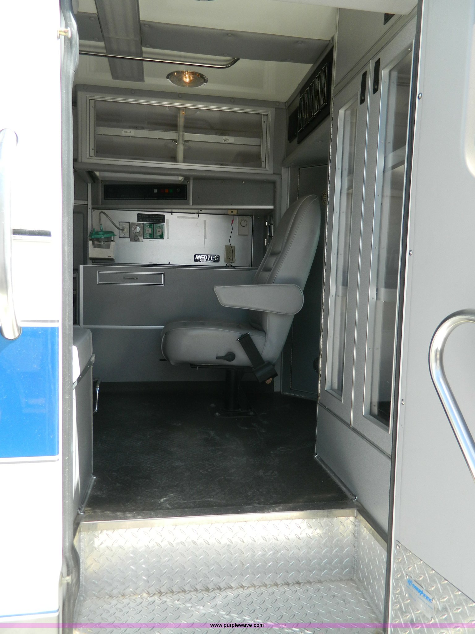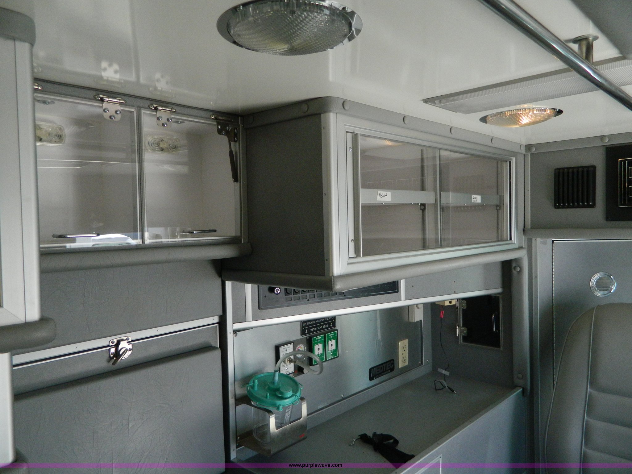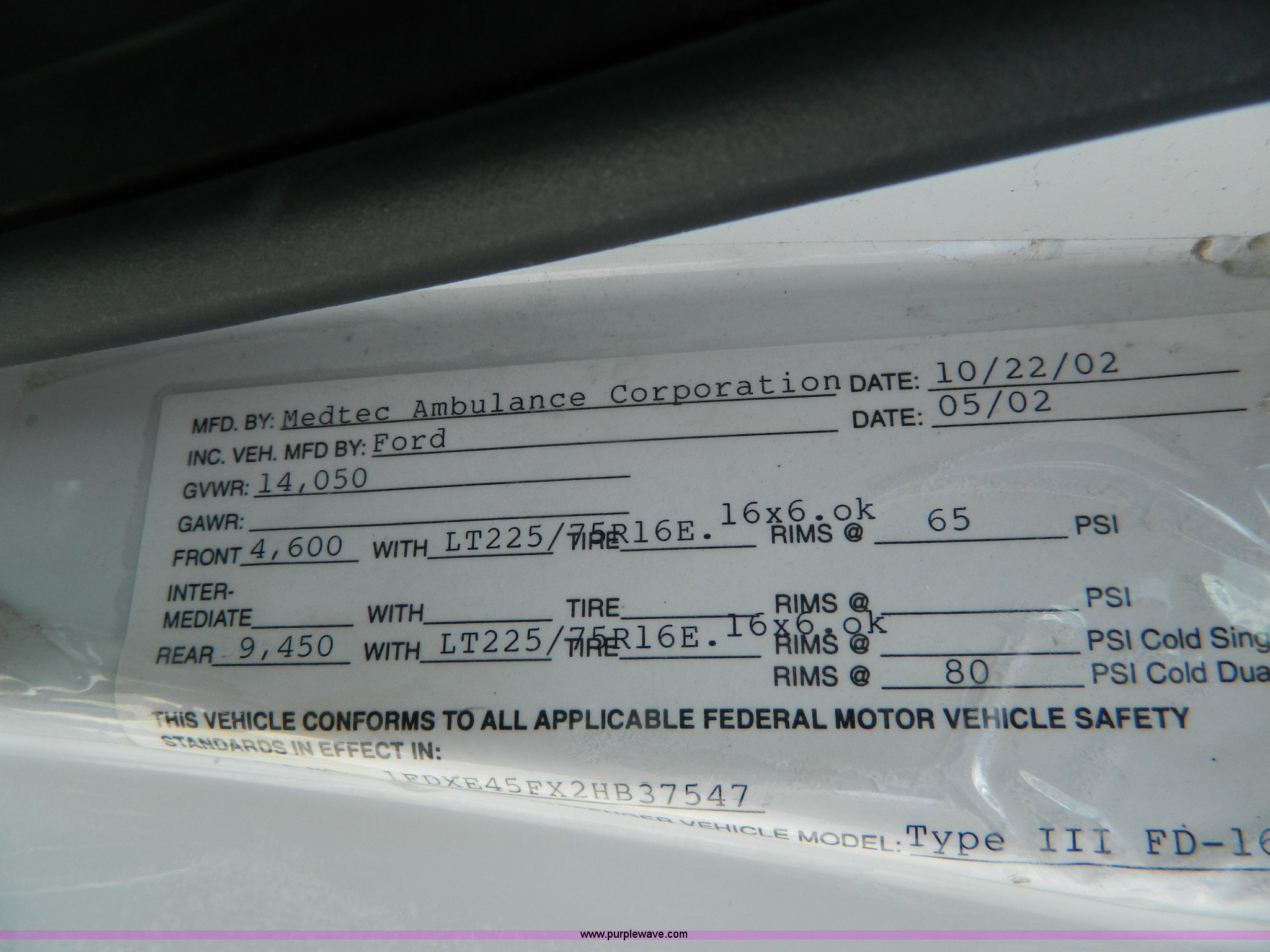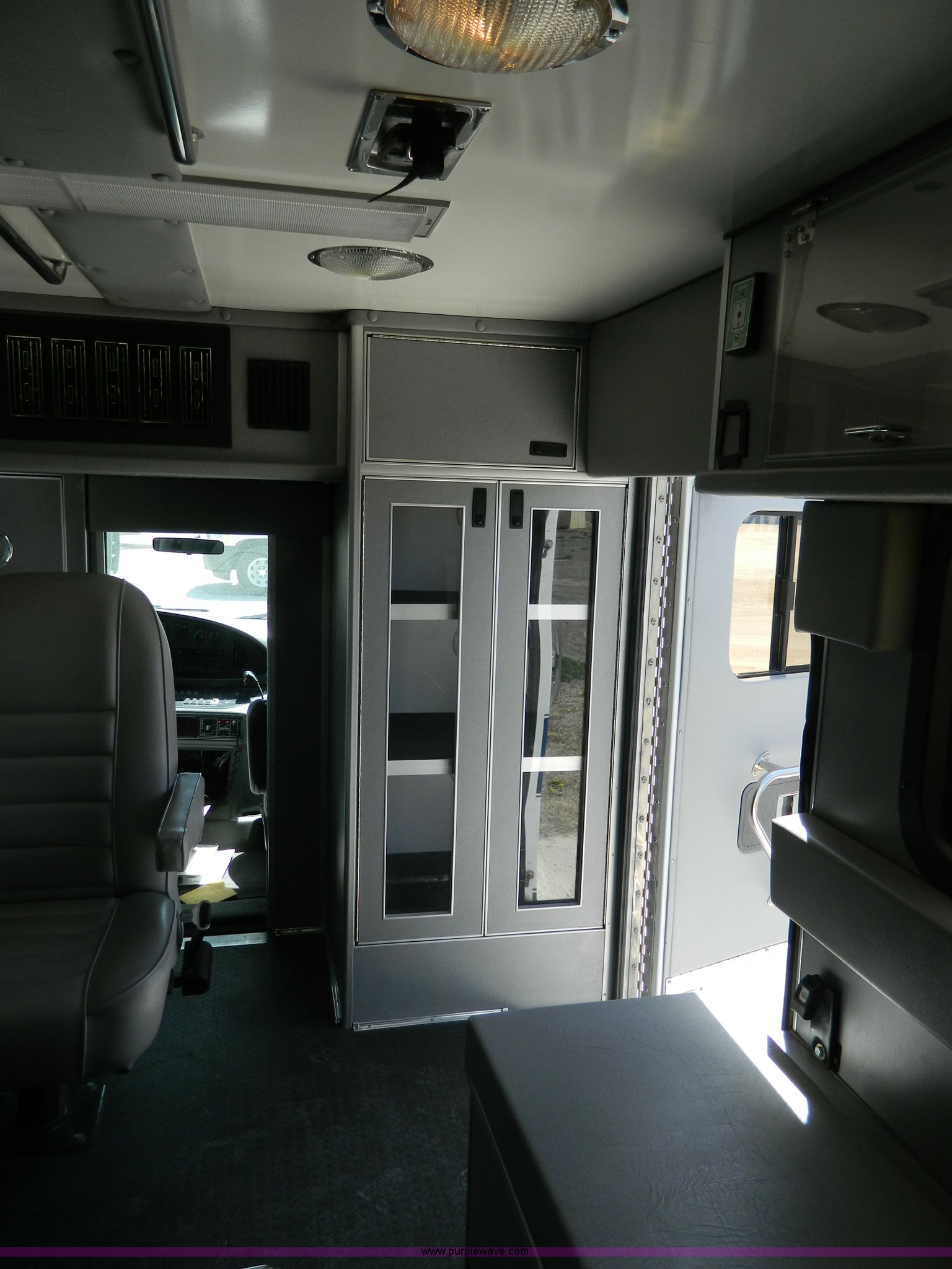 Purple Wave is selling a used Fire Truck or Emergency Vehicle in Kansas. This item is a 2002 Ford 801 ambulance with the following: 65,115 miles on odometer, 2,636 hours on meter, 7.3L V8 OHV 16V diesel engine, Automatic transmission, AC and heat, Tilt, Cruise, AM/FM/CD, Power windows and locks, Cloth interior, On-board power inverter, PA system, Siren, Light bar, Medec body, 225/75R16 tires, GVWR 14,050 lbs, Chipped windshield