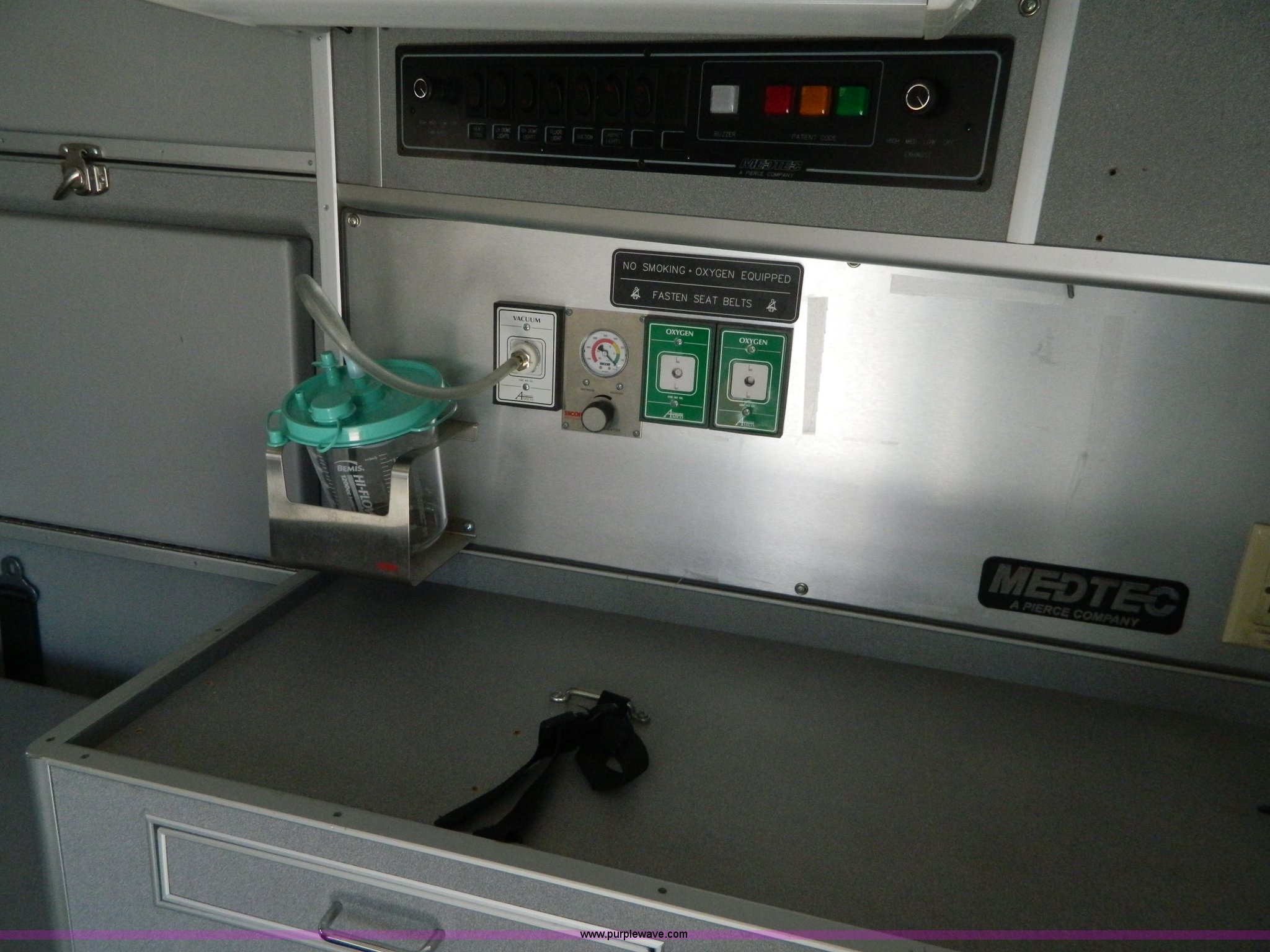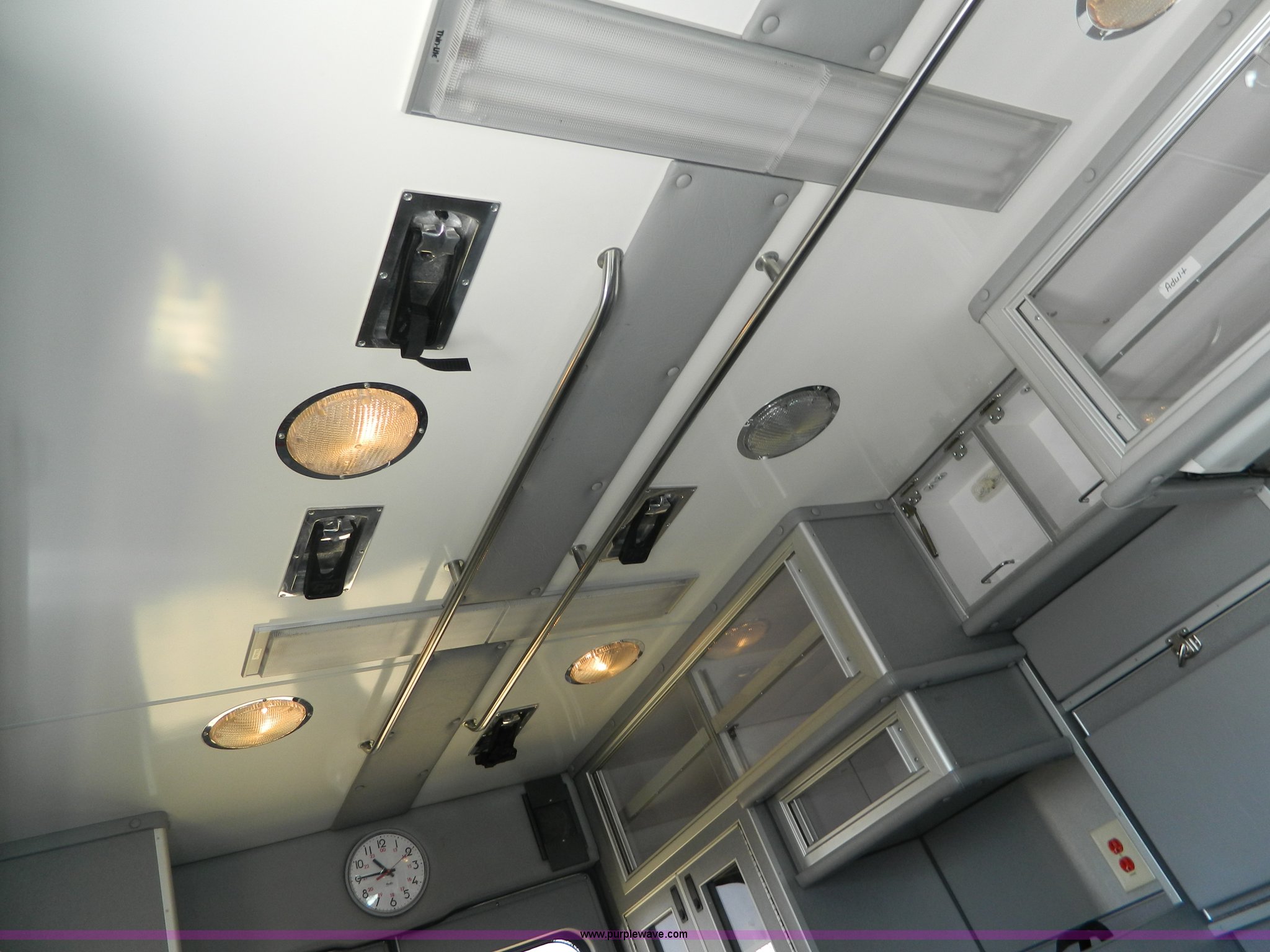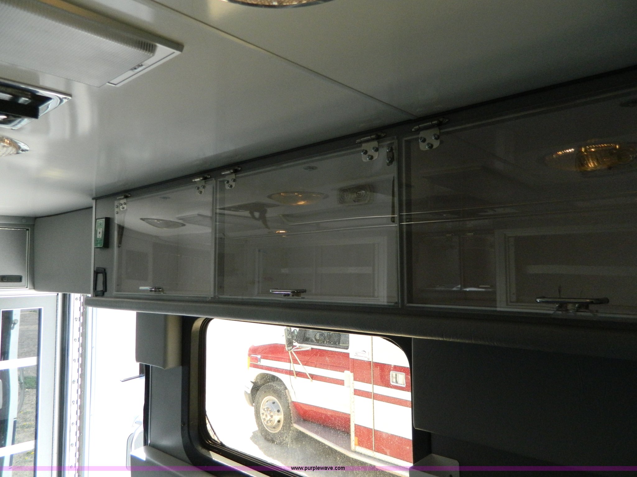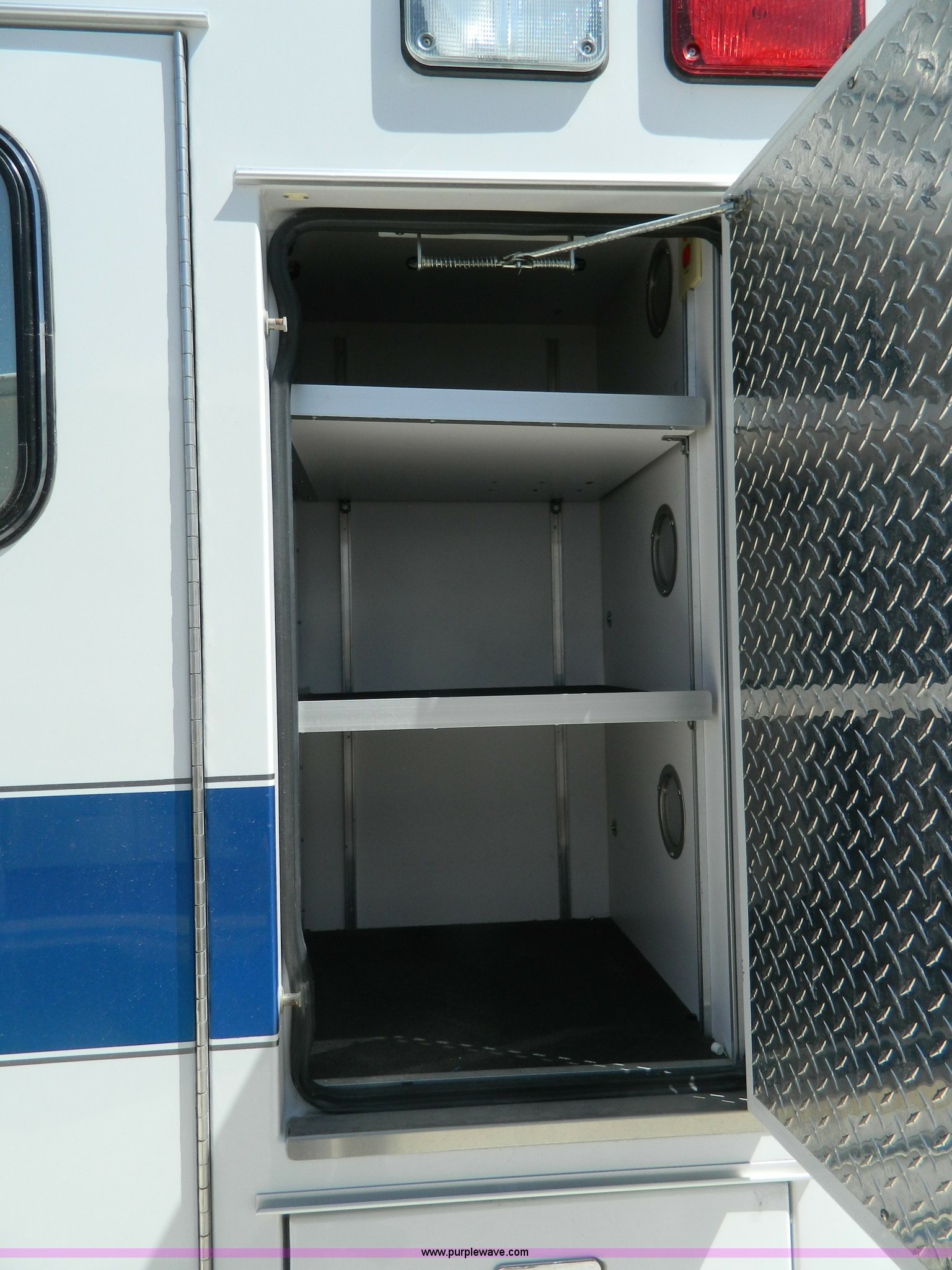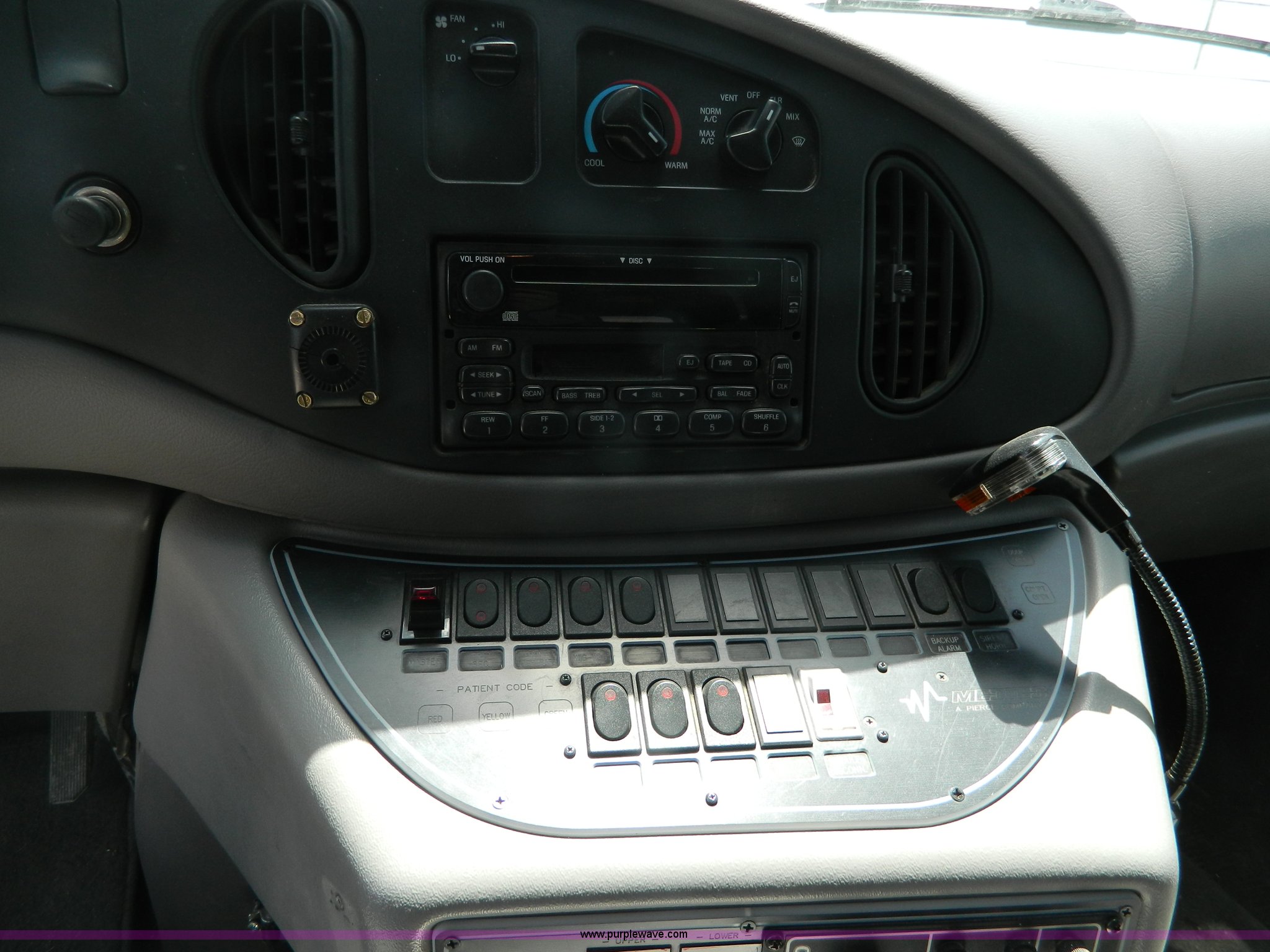 Purple Wave is selling a used Fire Truck or Emergency Vehicle in Kansas. This item is a 2002 Ford 801 ambulance with the following: 65,115 miles on odometer, 2,636 hours on meter, 7.3L V8 OHV 16V diesel engine, Automatic transmission, AC and heat, Tilt, Cruise, AM/FM/CD, Power windows and locks, Cloth interior, On-board power inverter, PA system, Siren, Light bar, Medec body, 225/75R16 tires, GVWR 14,050 lbs, Chipped windshield