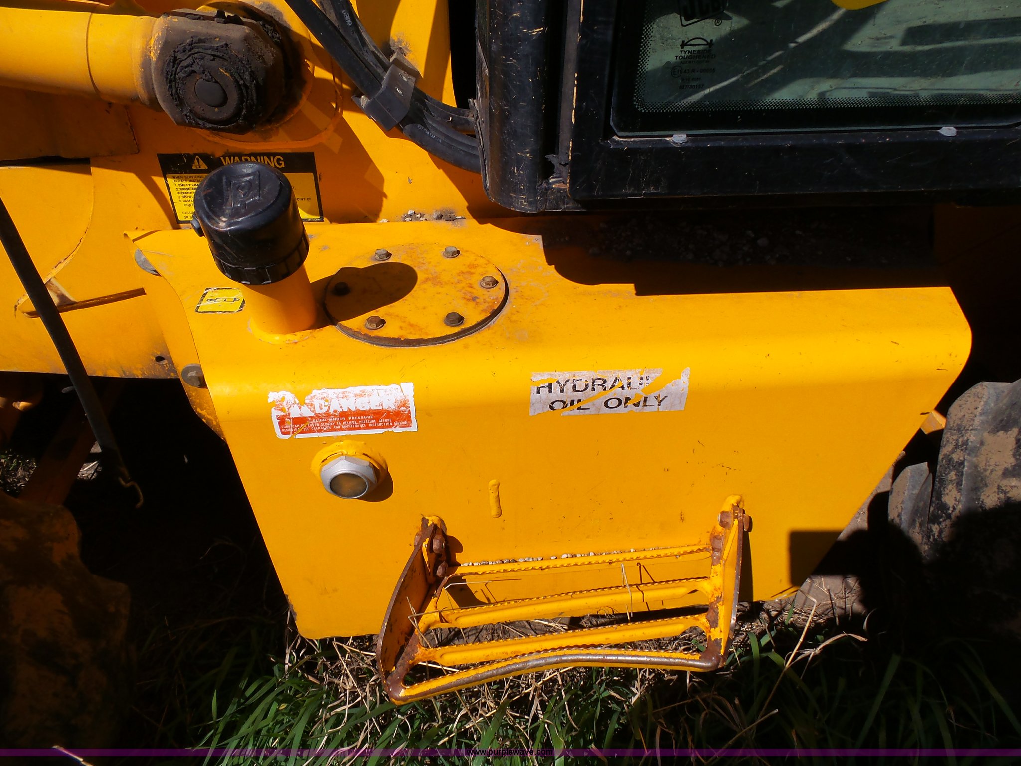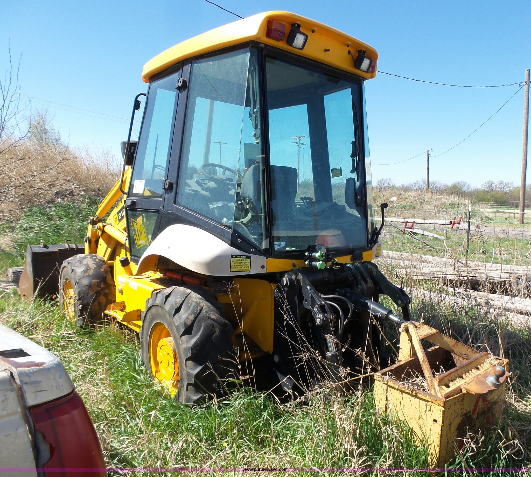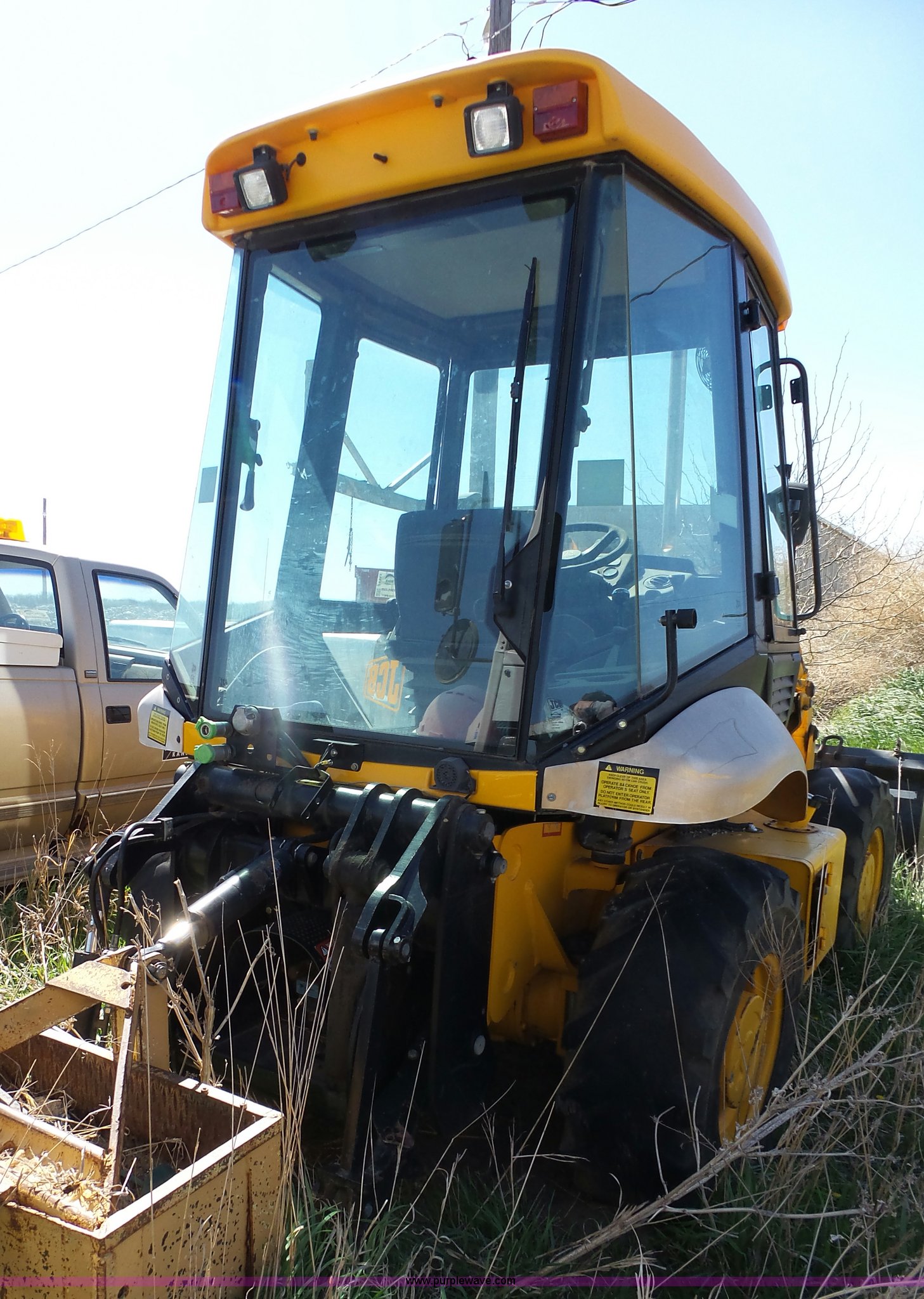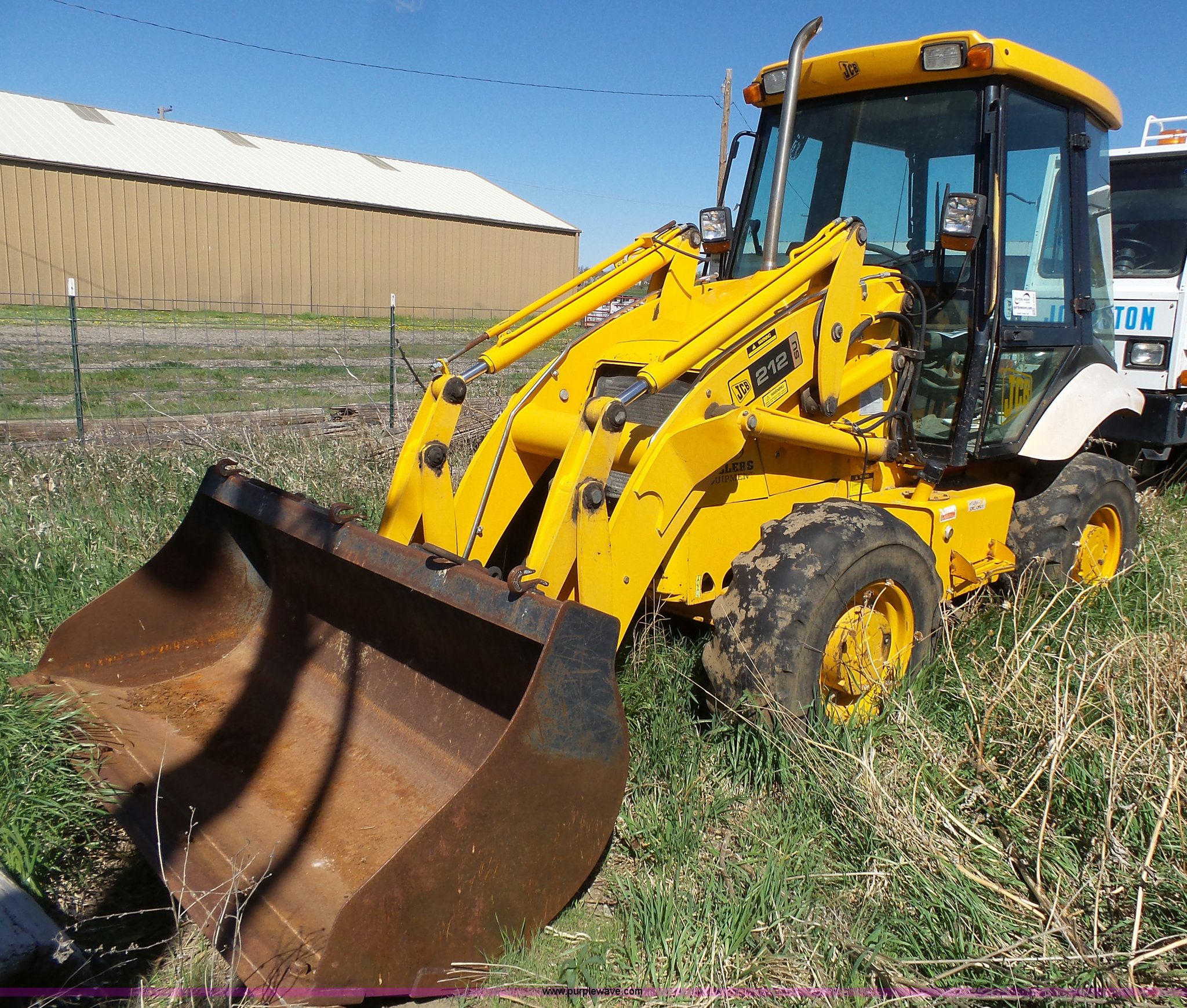 Purple Wave is selling a used Wheel Loader in Kansas. This item is a JCB 212SU wheel loader with the following: Diesel engine, Serial RE38082U133268L, Manual transmission, Enclosed cab, Front and rear work lights, Wipers, Two-lever controls, 76"W loader bucket, Bolt-on cutting edge, 0.7 cu. meter capacity, Rear auxiliary hydraulics, 540 PTO, Three point, Counterweight, Michelin 335/80R18 tires, Worn, Dead battery, Transmission issues, Driver side door will not latch, Last ran one year ago, PIN 0948205, Serial SLP212AU4E0948205, Unit# 10