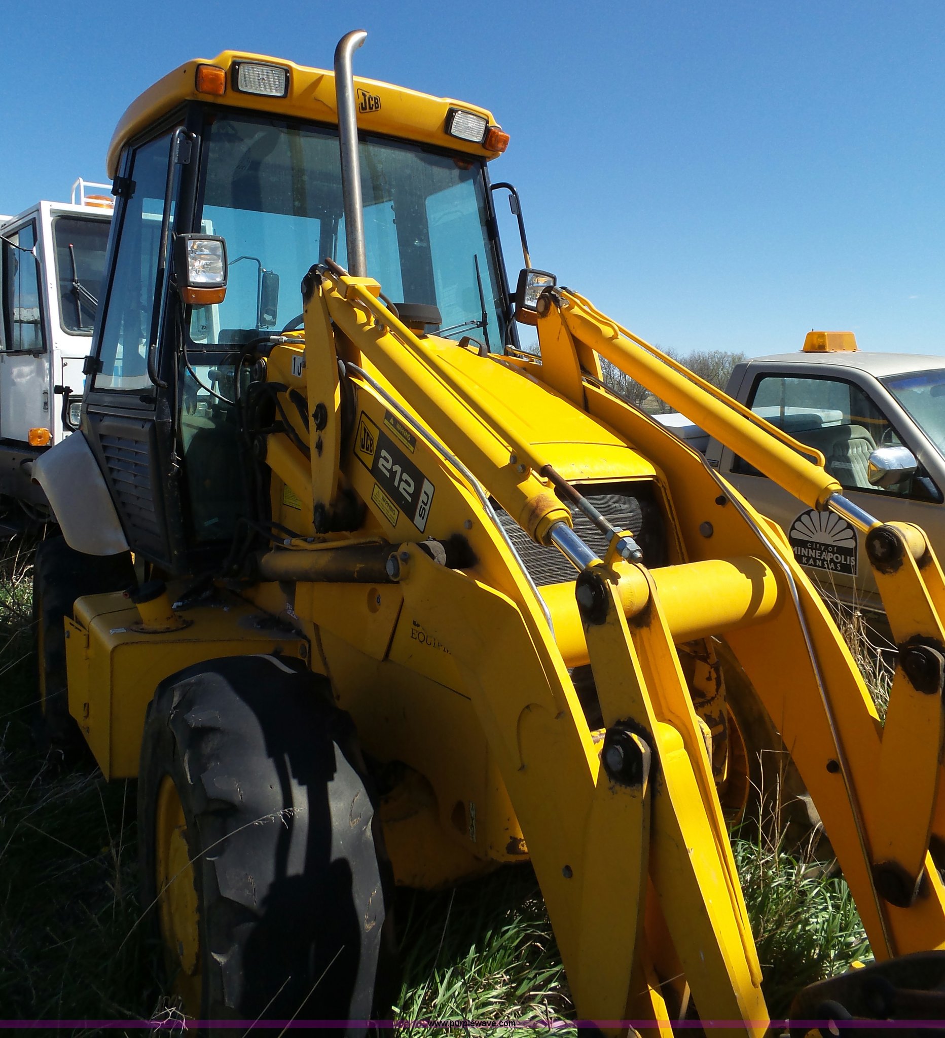 JCB 212SU wheel loader. Diesel engine Serial RE38082U133268L, Manual transmission, Enclosed cab, Front and rear work lights, Wipers, Two-lever controls, 76"W loader bucket Bolt-on cutting edge, 0.7 cu. meter capacity, Rear auxiliary hydraulics, 540 PTO, Three point, Counterweight, Michelin 335/80R18 tires Worn, Dead battery, Transmission issues, Driver side door will not latch, Last ran one year ago, PIN 0948205, Serial SLP212AU4E0948205, Unit# 10. Minneapolis, KS 67467