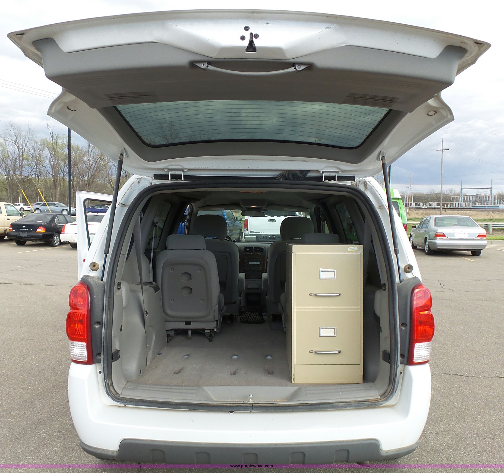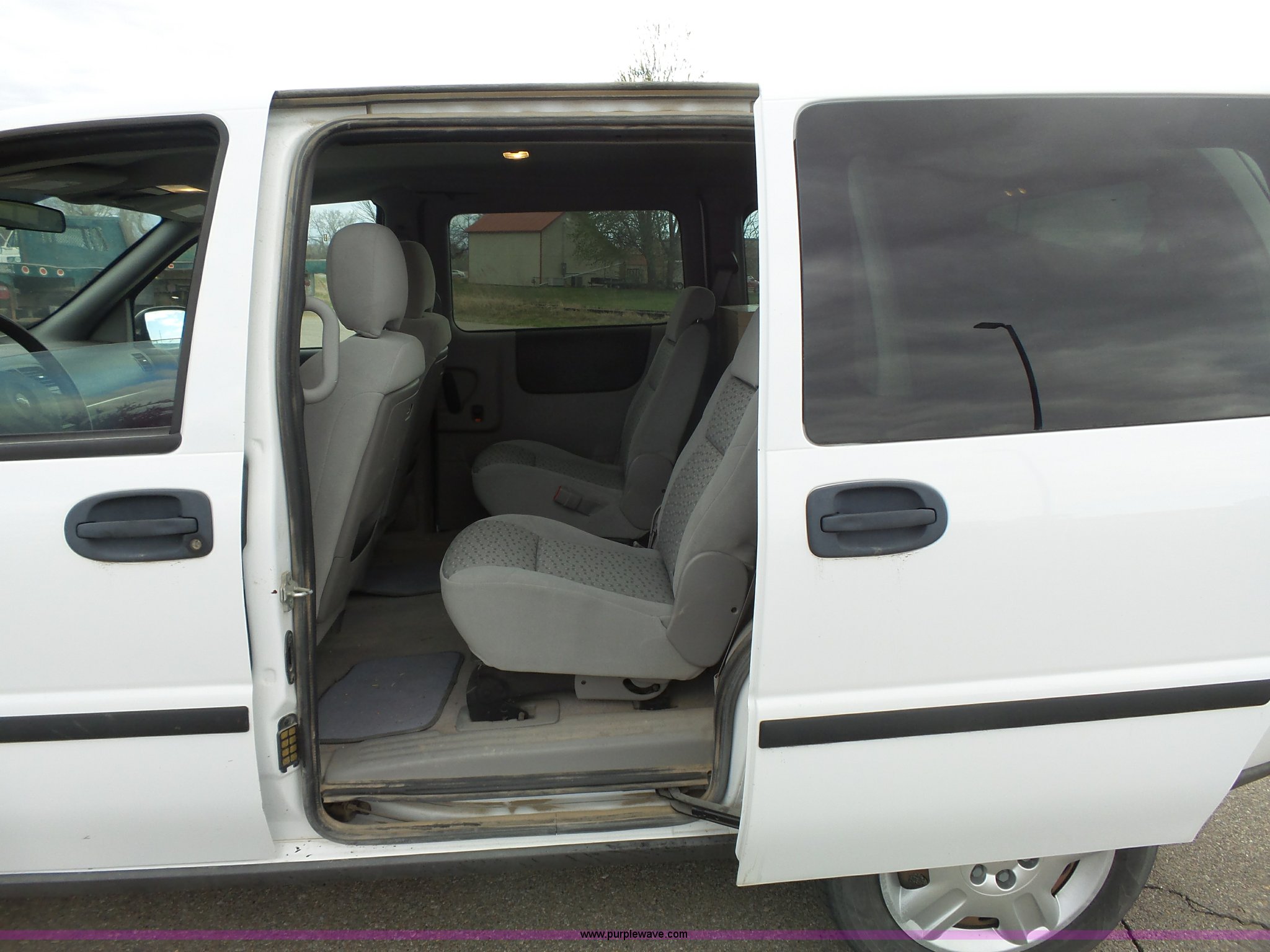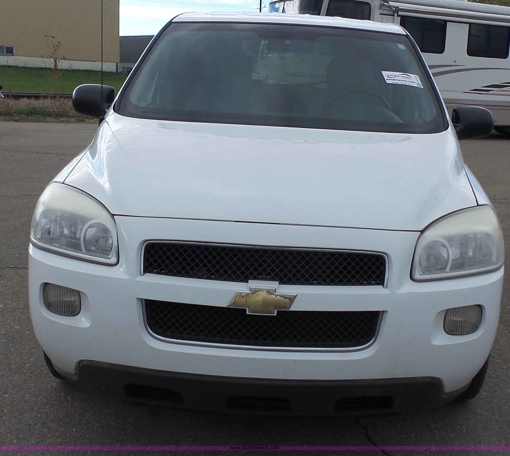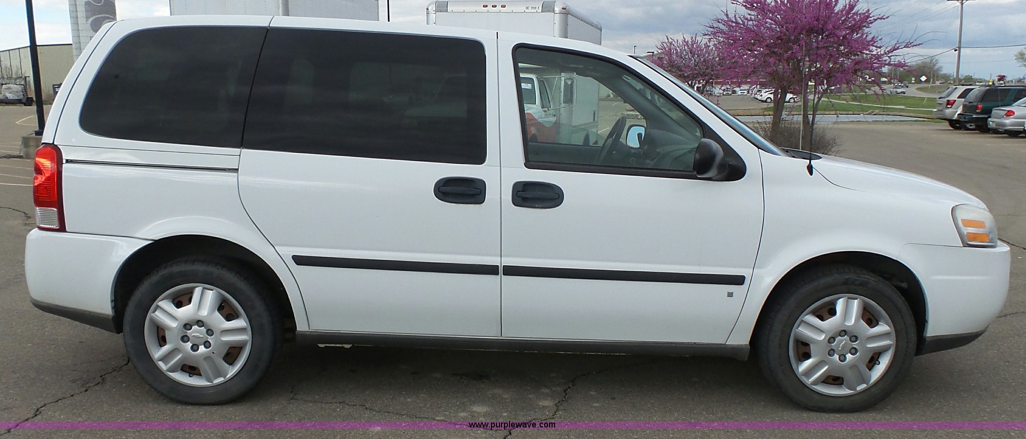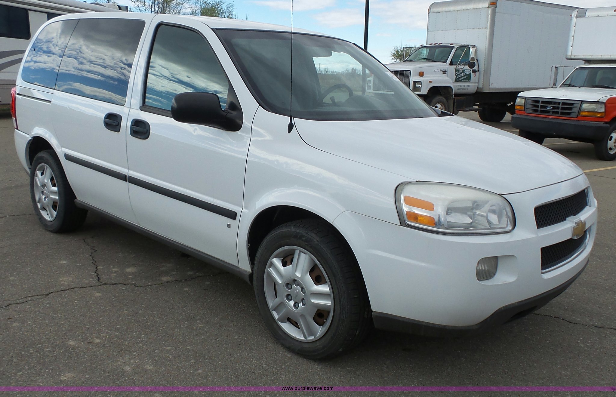 Purple Wave is selling a used Passenger Vehicle in Kansas. This item is a 2008 Chevrolet Uplander LS van with the following: 154,355 miles on odometer, 3.9L V6 OHV 12V FFV gas engine, Automatic transmission, AC and heat, Tilt, Cruise, AM/FM/CD, Power windows, locks, and mirrors, Cloth interior, Fog lights, Two drawer file cabinet, 225/60R17 tires, Third seat missing, Hail damage, Unit# 12838