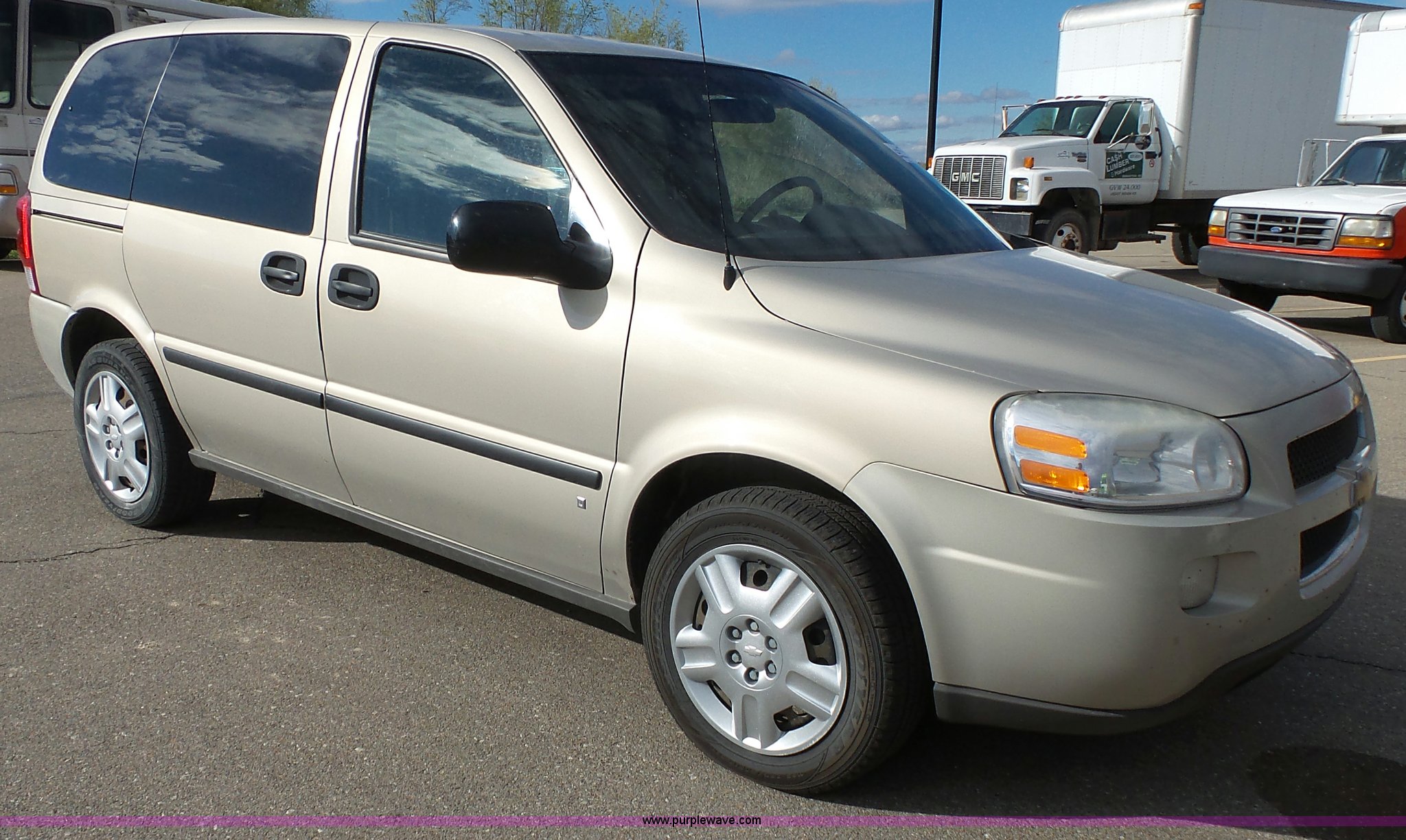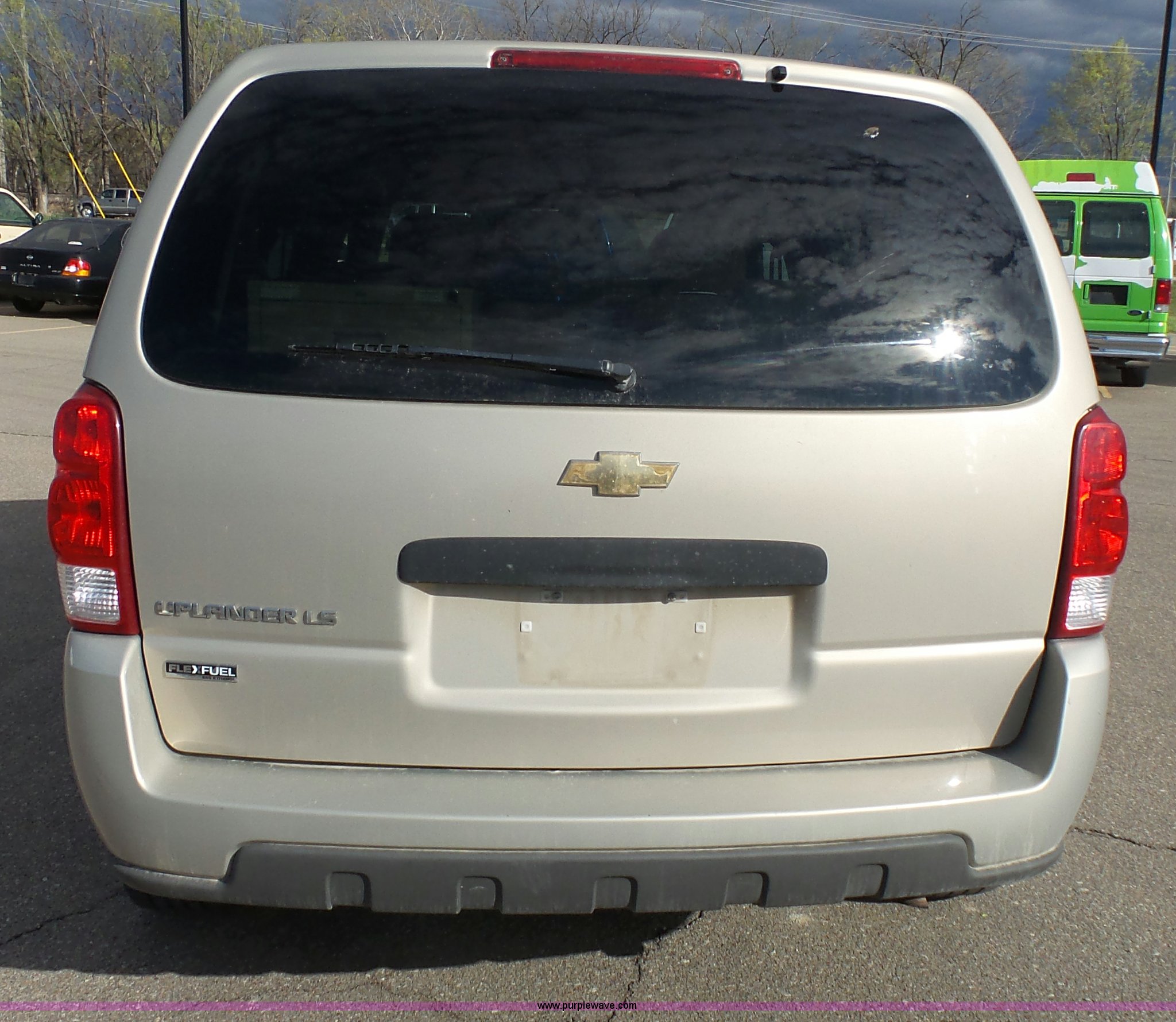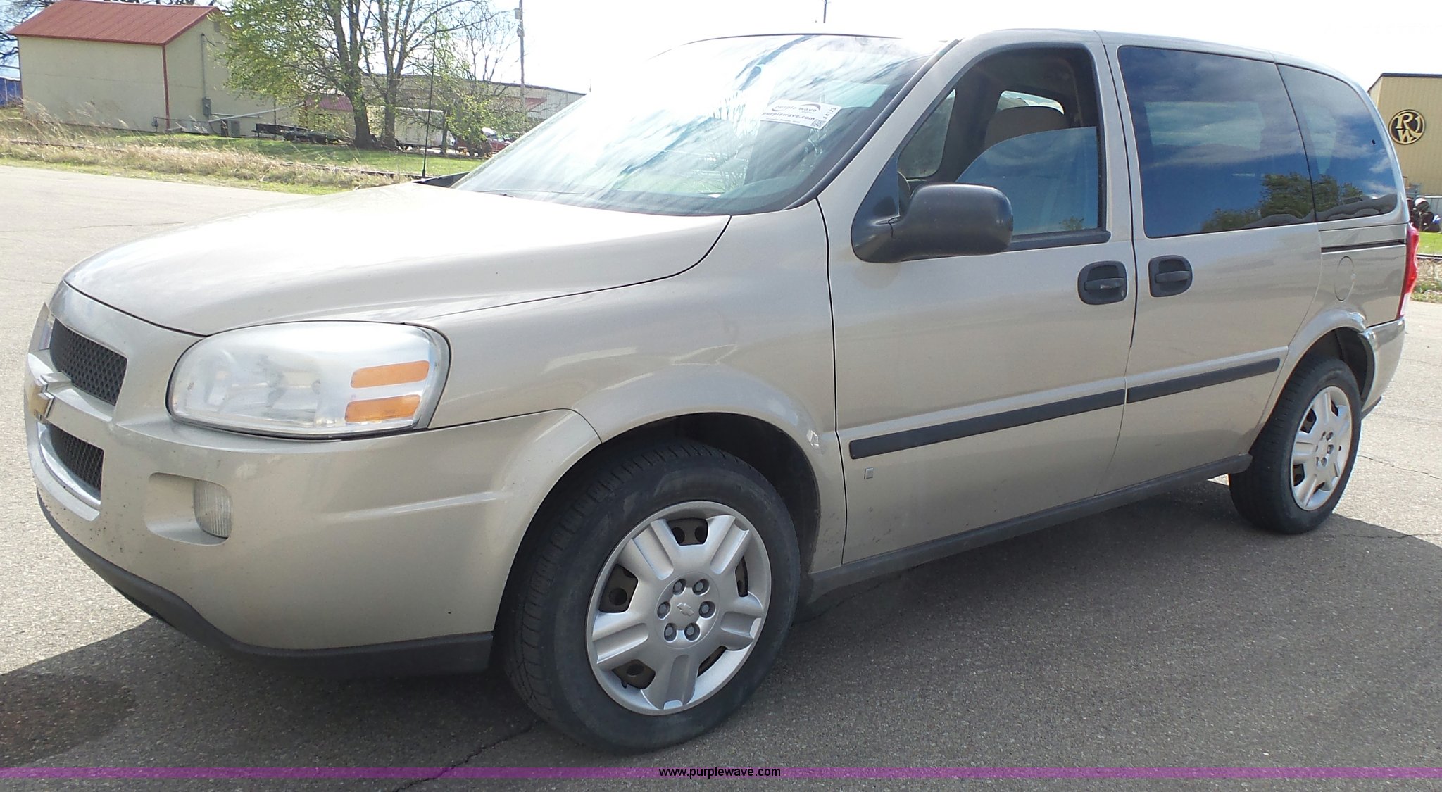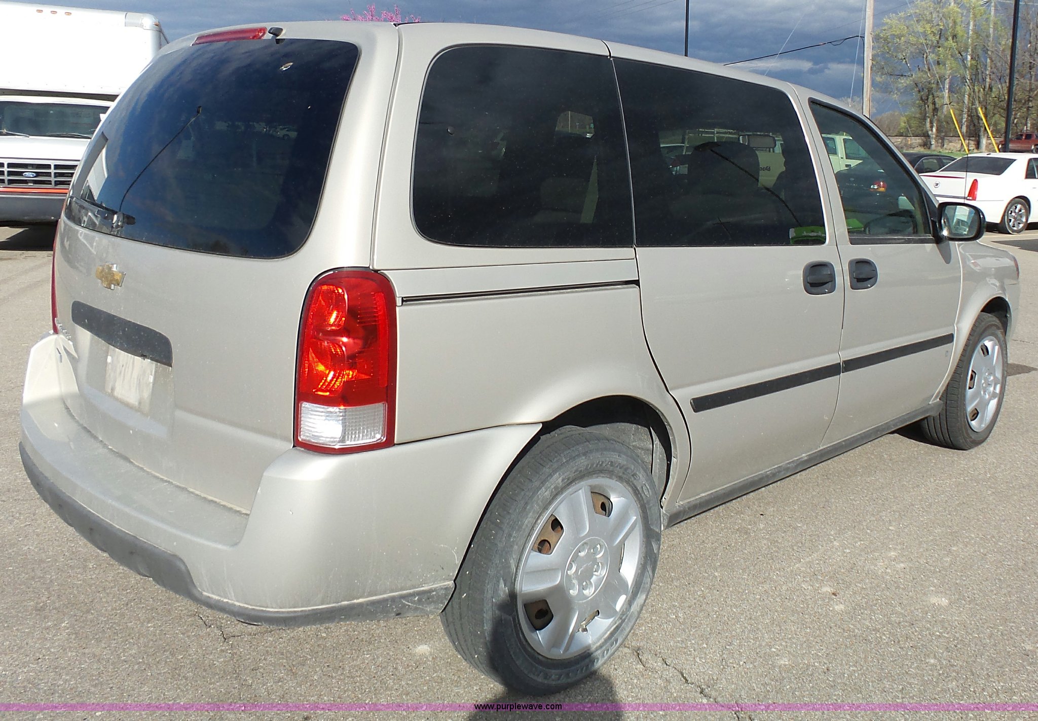 Purple Wave is selling a used Passenger Vehicle in Kansas. This item is a 2008 Chevrolet Uplander LS van with the following: 204,079 miles on odometer, 3.9L V6 OHV 12V FFV gas engine, Automatic transmission, AC and heat, Tilt, Cruise, AM/FM/CD, Power windows, locks, and mirrors, Cloth interior, Fog lights, Two drawer file cabinet, 225/60R17 tires, Third seat missing, Rust, Unit# 12663