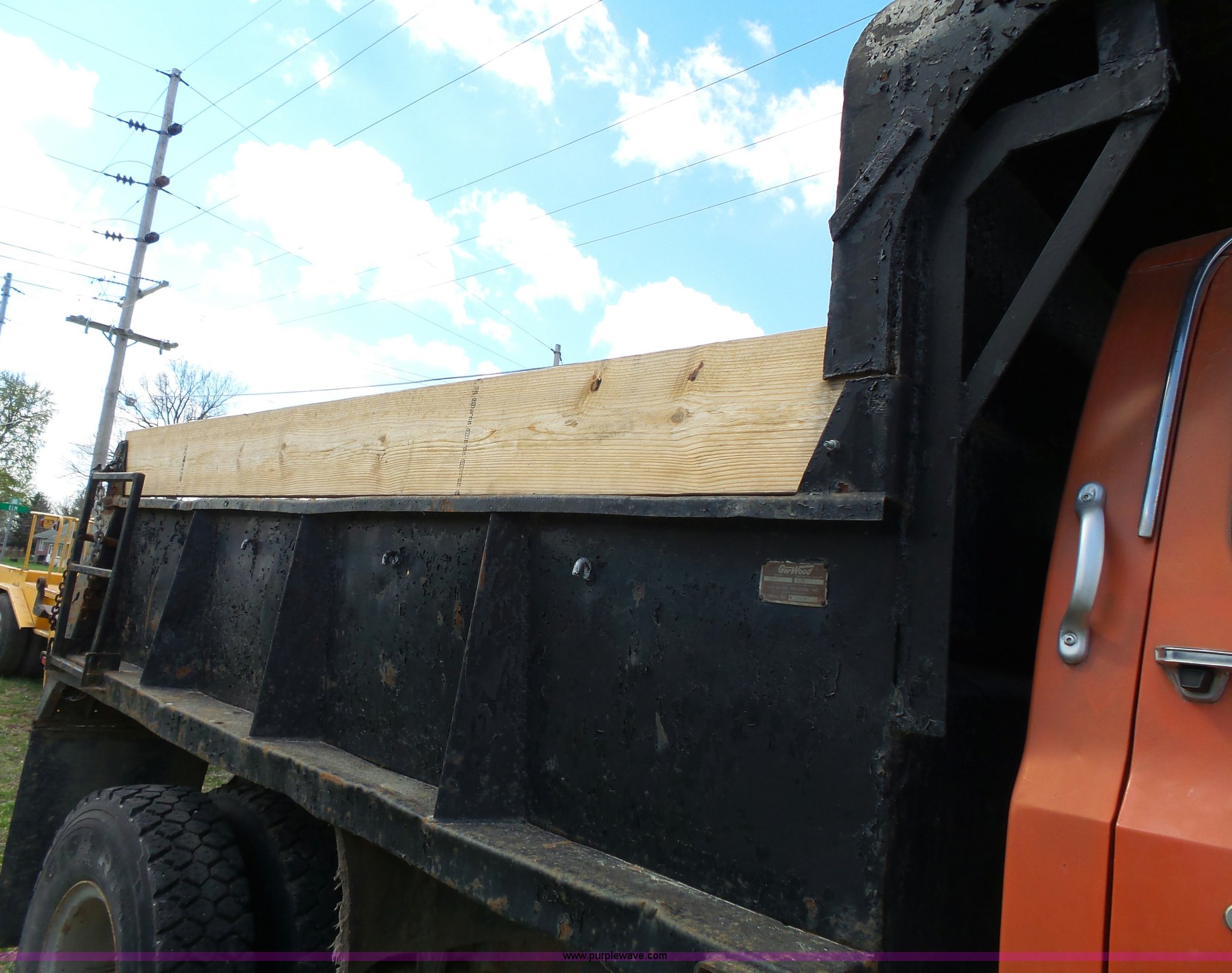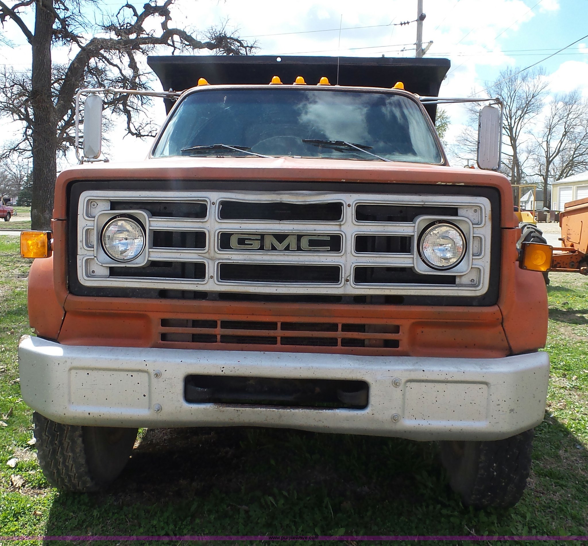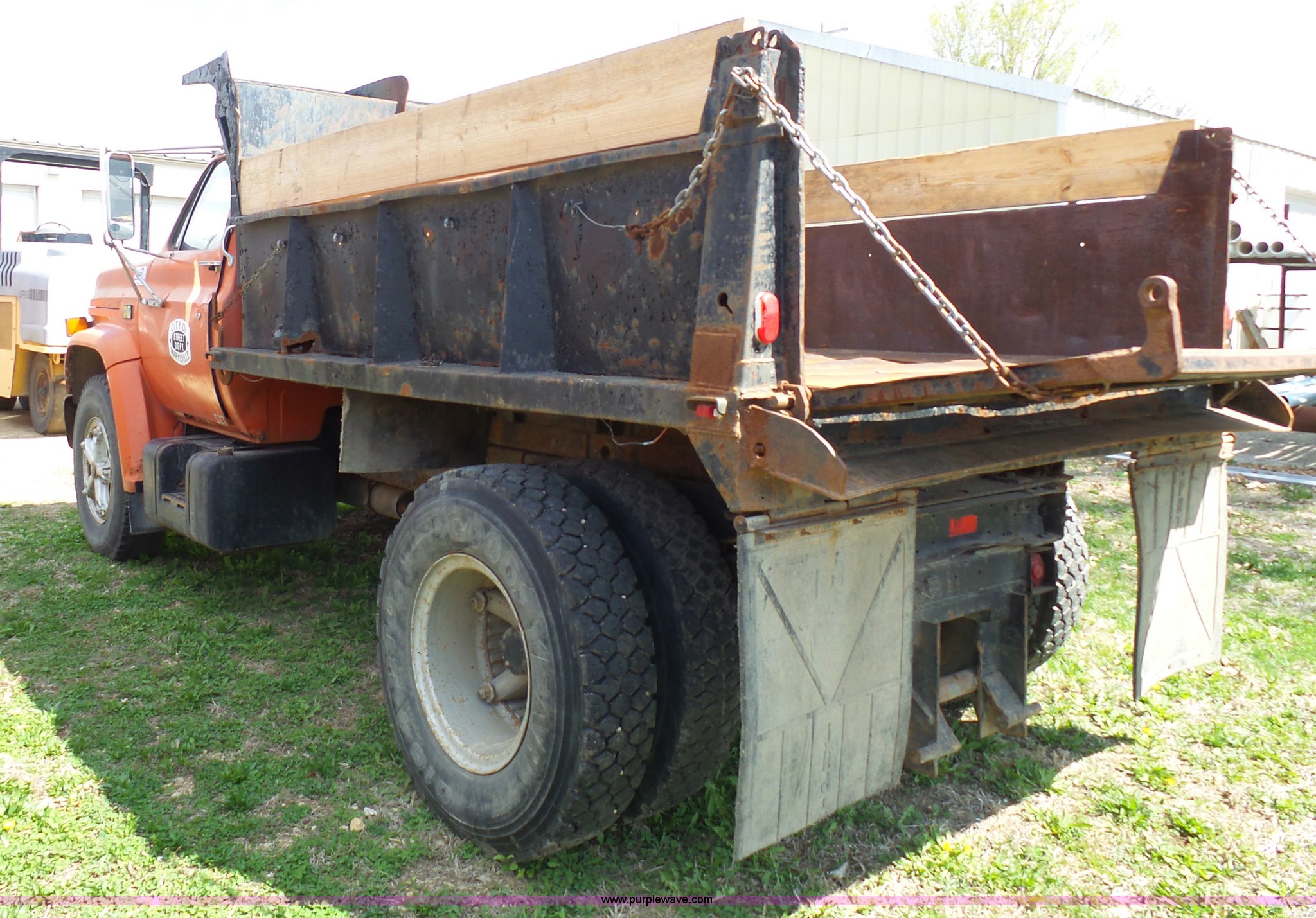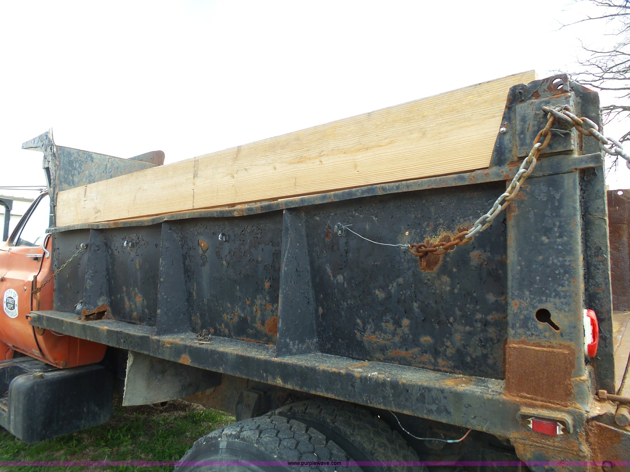 Purple Wave is selling a used Construction Dump Truck in Kansas. This item is a 1981 Chevrolet C60 dump truck with the following: 34,618 miles on odometer, Odometer inoperable, 5.7L V8 gas engine, Four speed manual transmission, Two speed rear end, Single axle, Heat, AM/FM/cassette, Front tow hooks, Chelsea PTO, Garwood GA-2 steel dump bed, 10'L x 7'W, 24" side height, 9" side board height, Four to five yard capacity, Manual end gate, Single ram hoist, Serial 0195047, Spring suspension, 151" wheelbase, 10.00R20 tires, GVWR 23,160 lbs, FAWR 7,000 lbs, RAWR 16,160 lbs, Interior/exterior cosmetic damage, Master cylinder/brake booster inoperable, Rust, Front leaf springs broken, Decals will be painted or removed, Exhaust leaks, Seat damage