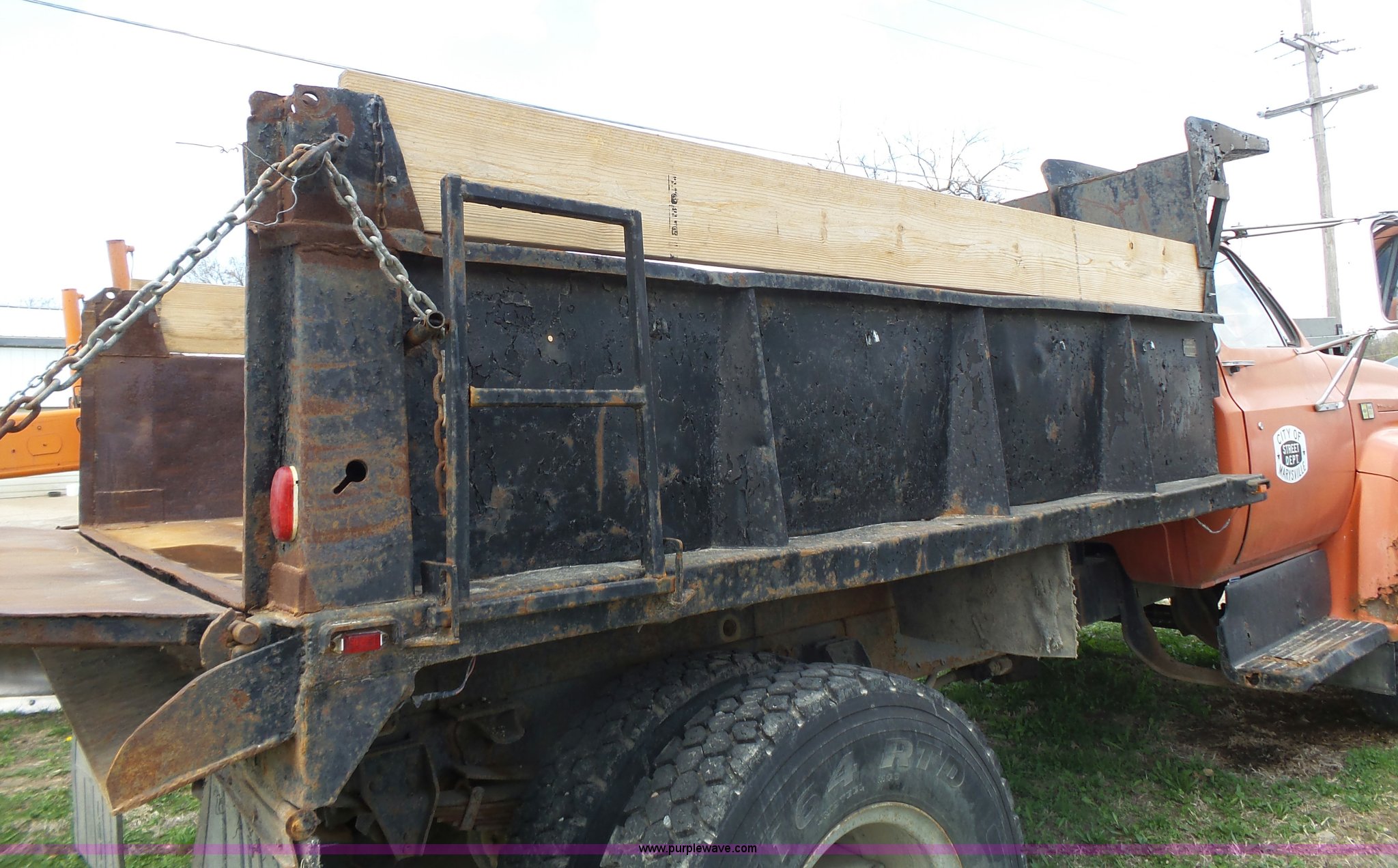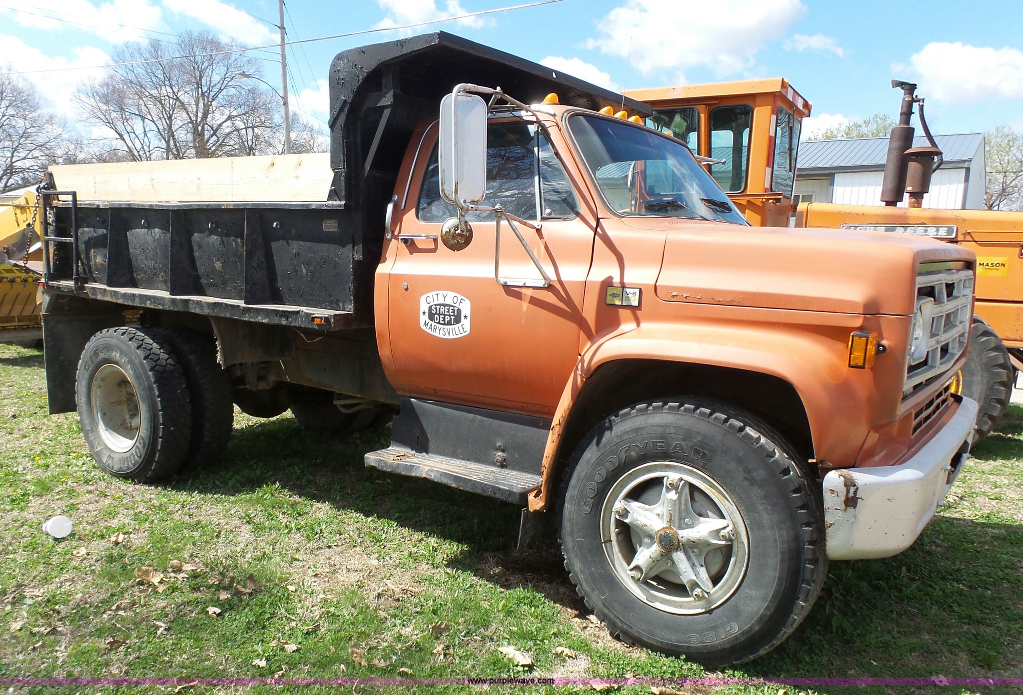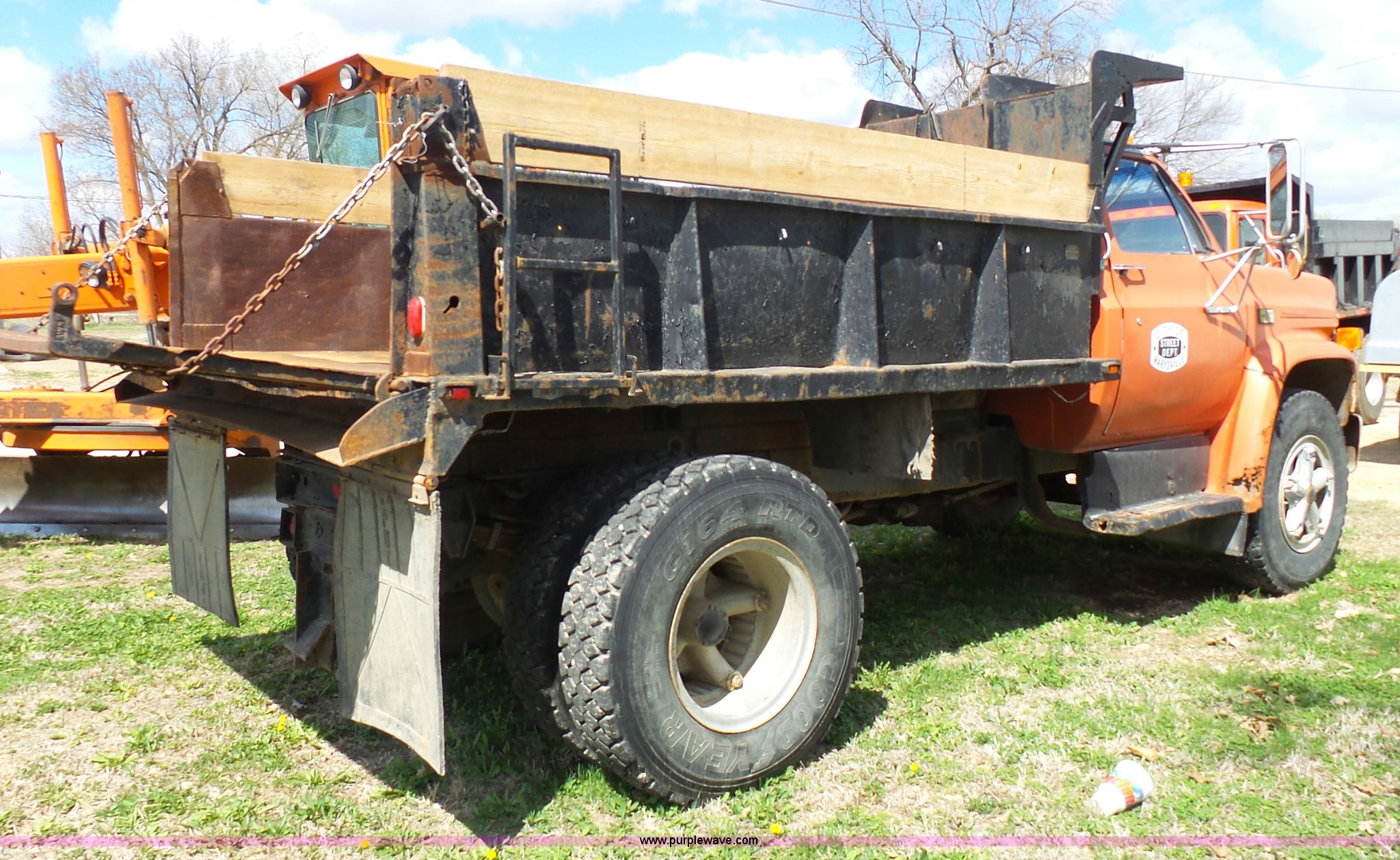 1981 Chevrolet C60 dump truck. 34,618 miles on odometer Odometer inoperable, 5.7L V8 gas engine, Four speed manual transmission, Two speed rear end, Single axle, Heat, AM/FM/cassette, Front tow hooks, Chelsea PTO, Garwood GA-2 steel dump bed 10'L x 7'W, 24" side height, 9" side board height, Four to five yard capacity, Manual end gate, Single ram hoist, Serial 0195047, Spring suspension, 151" wheelbase, 10.00R20 tires, GVWR 23,160 lbs, FAWR 7,000 lbs, RAWR 16,160 lbs, Interior/exterior cosmetic damage, Master cylinder/brake booster inoperable, Rust, Front leaf springs broken, Decals will be painted or removed, Exhaust leaks, Seat damage. Kansas title. 1GBG6D1A4BV102228. 209 N 8th St. Marysville, KS 66508