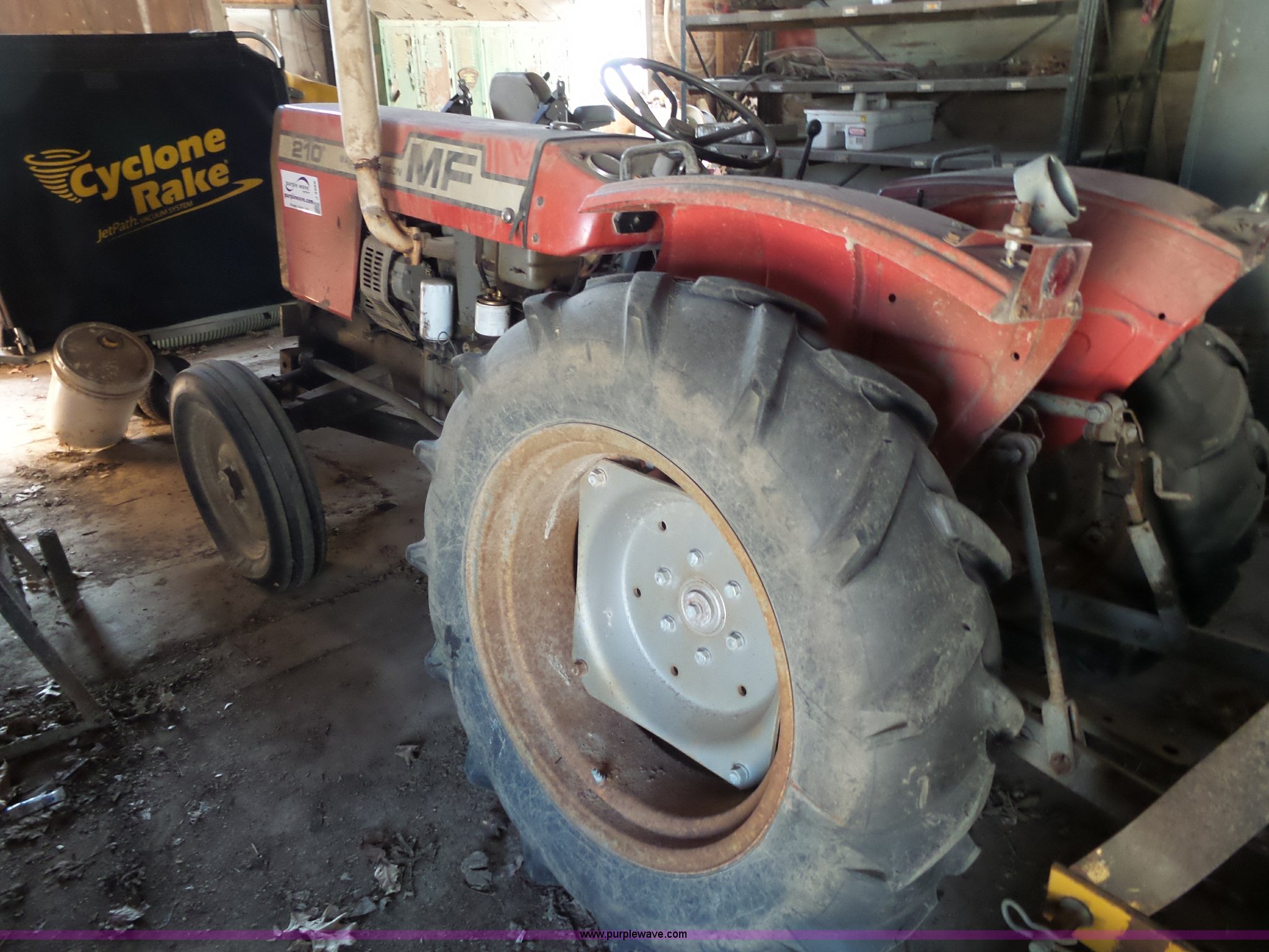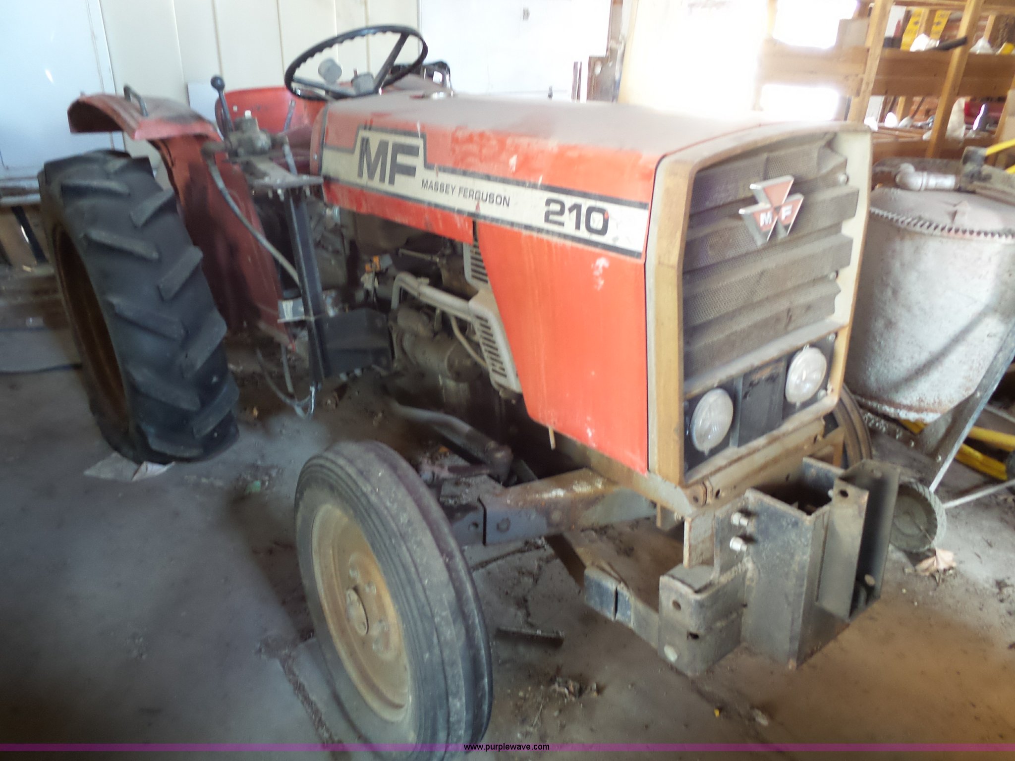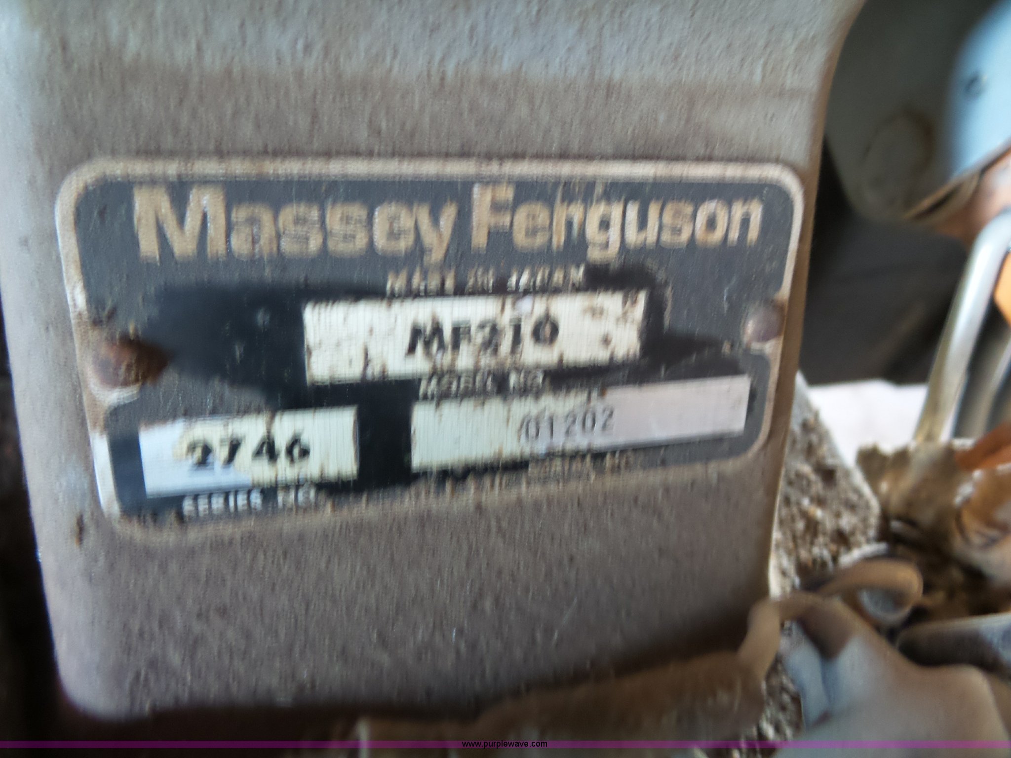 Purple Wave is selling a used Tractor in Kansas. This item is a Massey-Ferguson 210 Series 2746 tractor with the following: 3,530 hours on meter, Four cylinder diesel engine, Manual transmission, 5F-1R gears, Front work lights, Three point, 540 PTO, Draw bar, Titan 5.00-15 front tires, Bridgestone 11.2/10-24 rear tires, One tire flat, Wheel rusted, Seat cushion missing, Dead battery, Last used in fall 2015, Serial 01202