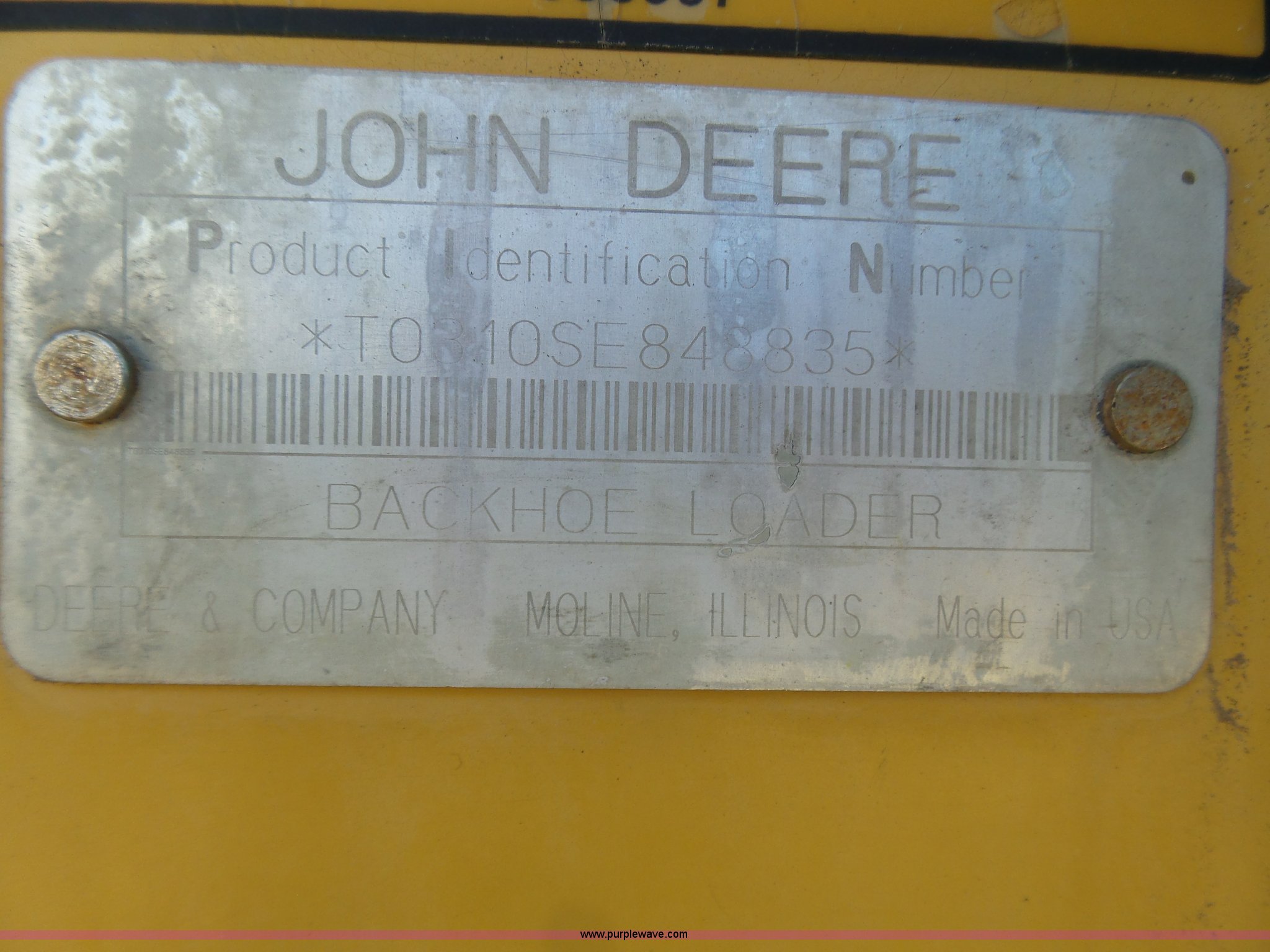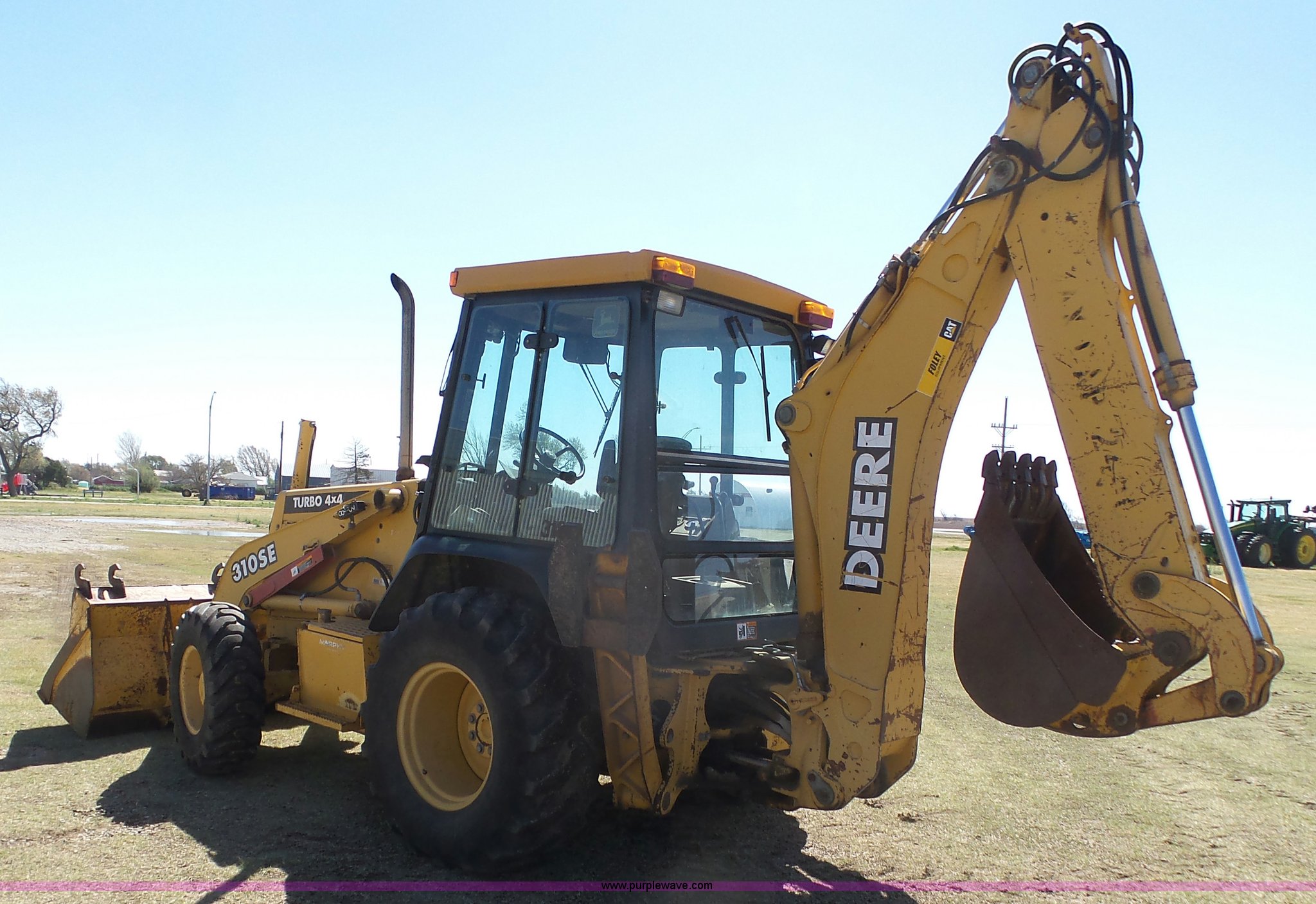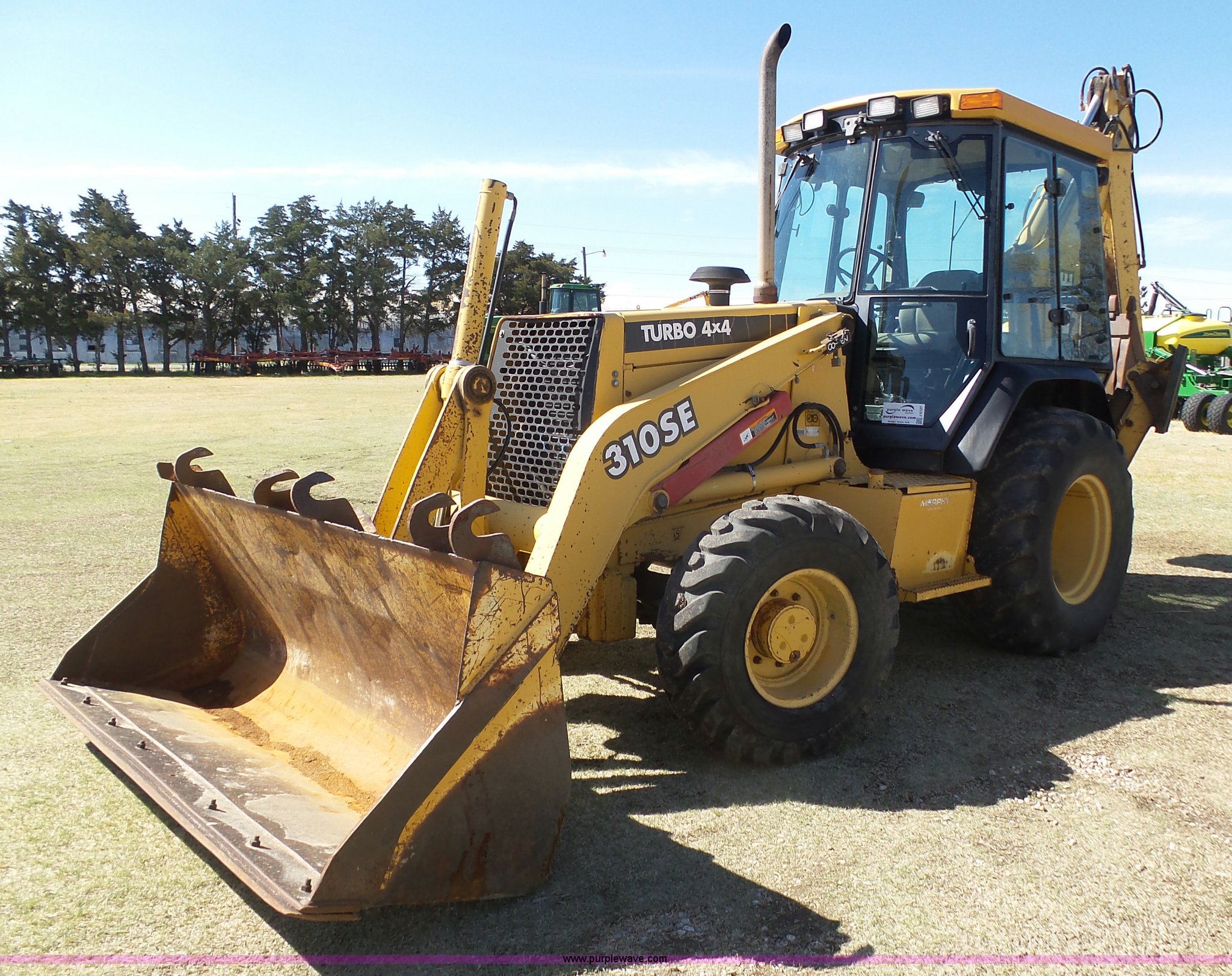 Purple Wave is selling a used Tractor Loader Backhoe in Kansas. This item is a 1998 John Deere 310SE backhoe with the following: 8,234 hours on meter, John Deere 4045TT050 4.5L four cylinder turbo diesel engine, Serial T04045T772646, Shuttle shift transmission, 4F-4R gears, Four wheel drive, EROPS, AC and heat, AM/FM, Suspension seat, Wobble stick backhoe controls, Front work lights, Wipers, John Deere AT174225 loader bucket, 92"W, Bolt-on cutting edge, 1.3 cu. yd. capacity, E-stick, John Deere backhoe bucket, 24"W, Weld-on cutting edge, (5) teeth, 7.5 cu. ft. capacity, Front couterweights, 12.5/80-18 front tires, 19.5L-24 rear tires, 14,790 lbs. base operating weight, Interior/exterior cosmetic damage, Oil leaks, Serial T0310SE848835