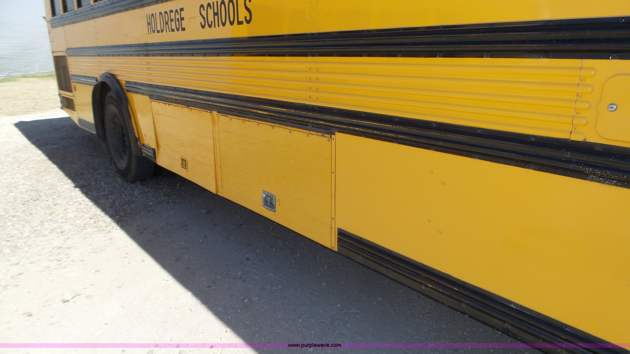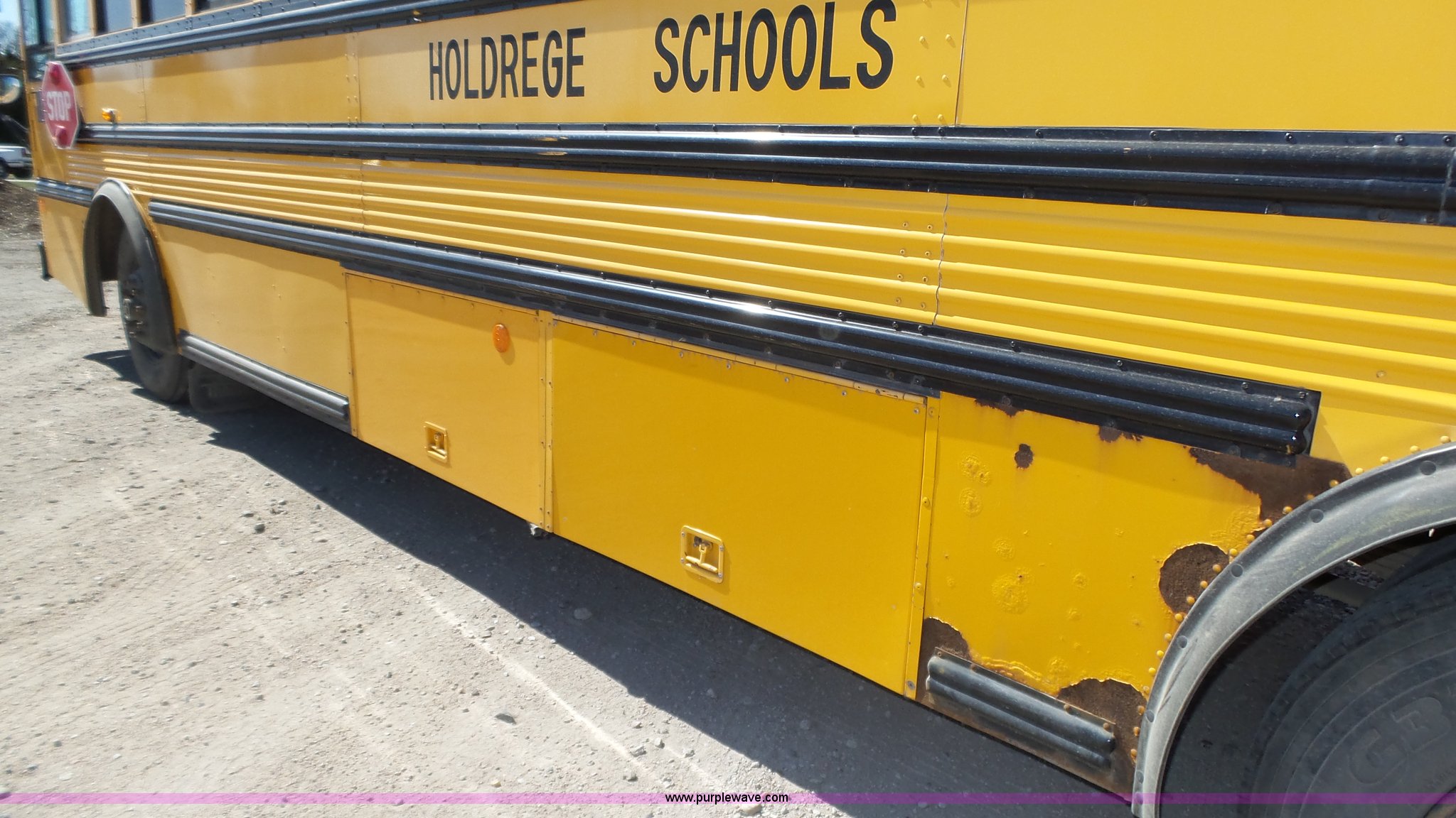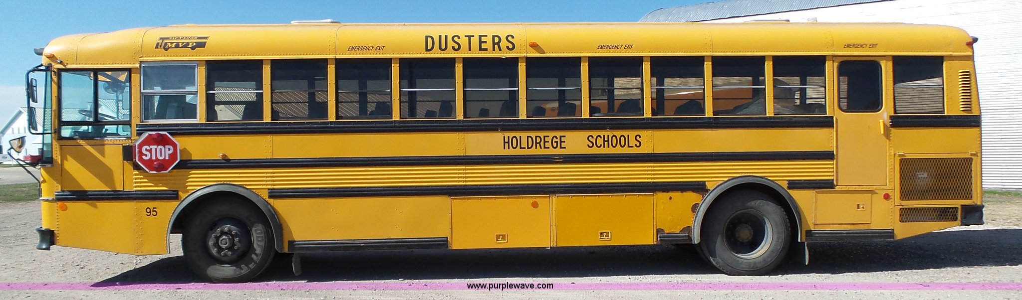 1995 Thomas Built Saf-T-Liner MVP school bus. 259,716 miles on odometer 9,020 hours on meter, Miles and hours may vary, sill in use, Caterpillar 6BTA-210 six cylinder turbo diesel engine, Automatic transmission Model MT643, Single axle, Heat, AM/FM/cassette, Heated mirrors, Air suspension seat, Overhead storage, 66 passenger capacity, Ceiling, rear, and side emergency egress, Beacon light, Stop sign, Radio Engineering Industries radio, microphone, and speakers, Block heater, First aid kits, Eaton body Serial 24769-9408777-ER-1309S, Underside luggage storage, Air brakes, Goodyear 11R22.5 tires, GVWR 30,000 lbs, FAWR 12,000 lbs, RAWR 20,000 lbs, Chassis# 81913, Unit# 95. Nebraska title. 1T79R4B29S1124769. Holdrege Community Schools. 505 14th Ave. Holdrege, NE 68949