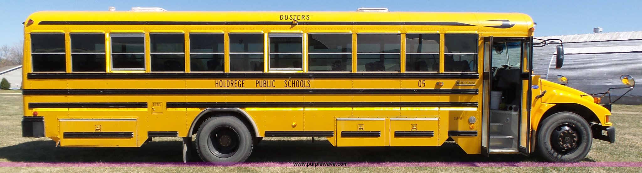 Purple Wave is selling a used Bus in Nebraska. This item is a 2005 Blue Bird Vision school bus with the following: 143,538 miles on odometer, Miles may vary, still in use, Caterpillar C7 Acert 7.2L L6 turbo diesel engine, 230 HP, Serial KAL65516, Automatic transmission, Single axle, Heat, Cruise, AM/FM/CD, Air suspension seat, Front shade, 59 passenger capacity, Ceiling, front, rear, and side emergency egress, Underside luggage storage, Block heater, Mud flaps, Spring suspension, Air brakes, 5:29 gear ratio, Goodyear 11R22.5 tires, GVWR 33,000 lbs, FAWR 10,000 lbs, RAWR 21,000 lbs, Engine quits intermittently during operation, Computer replaced in 2015, Batteries replaced in April 2016, Contents not included, Unit# 05