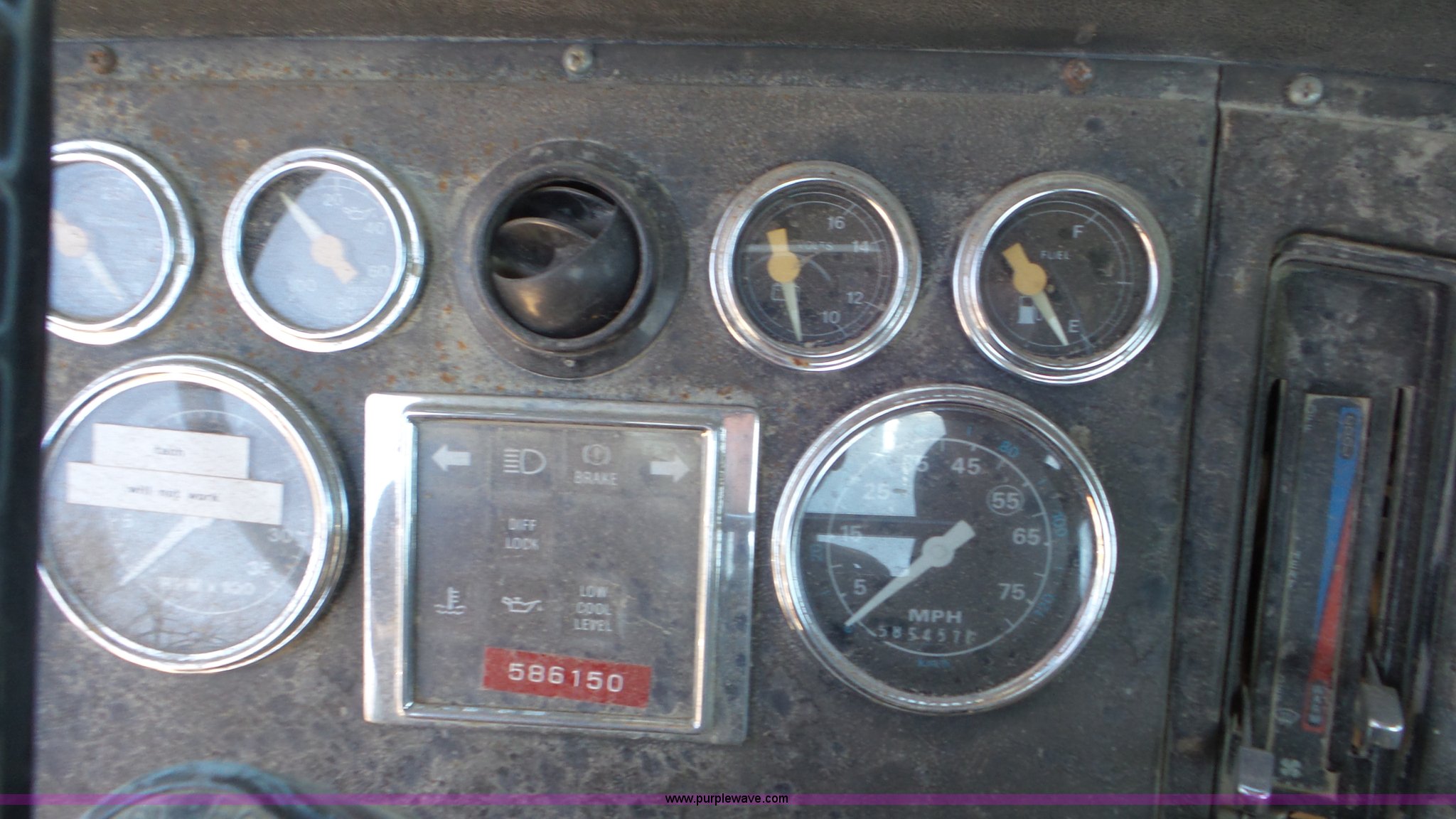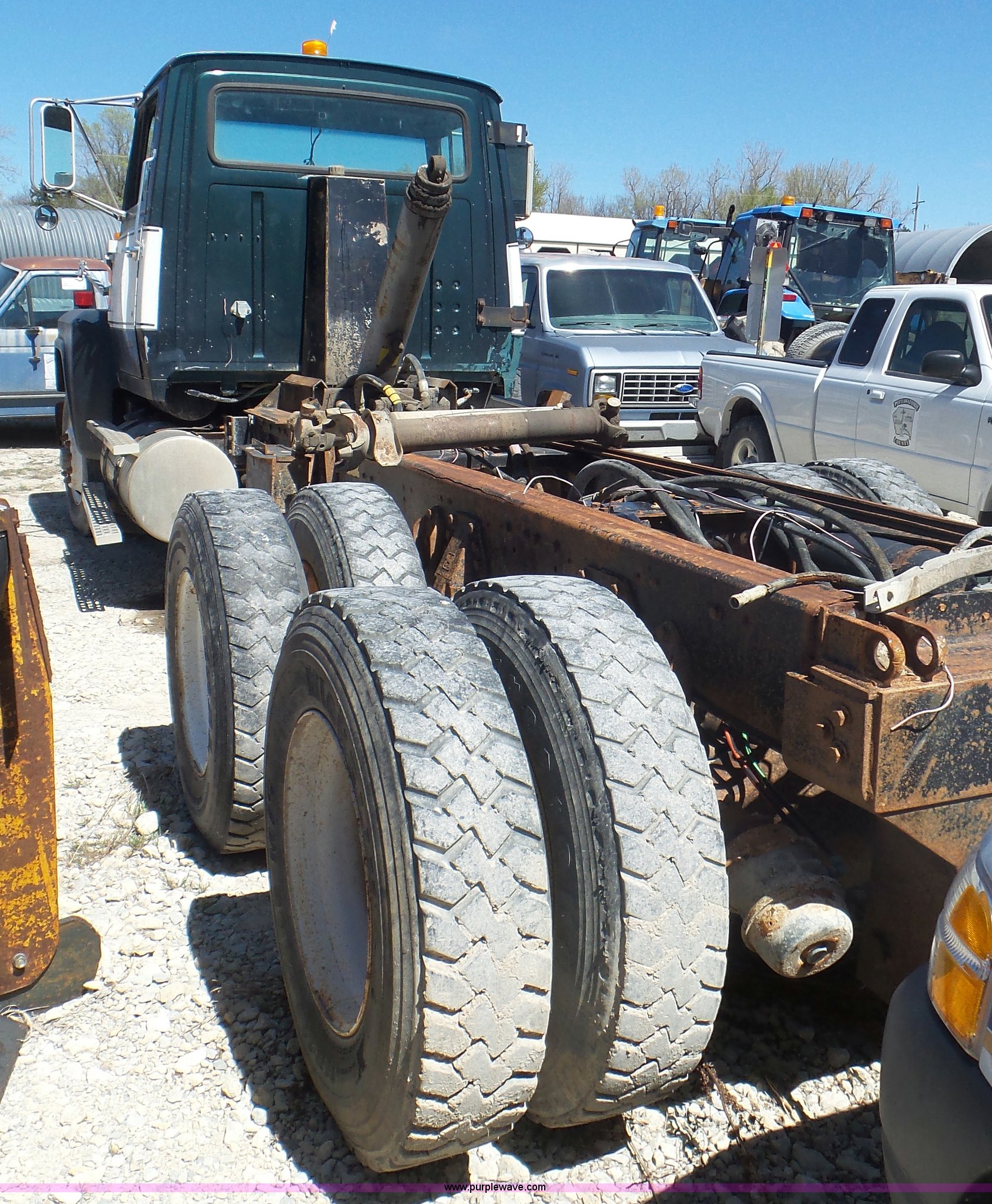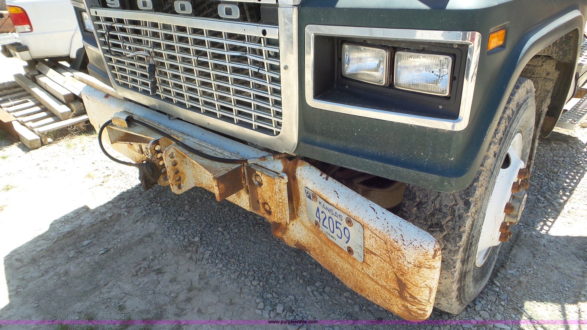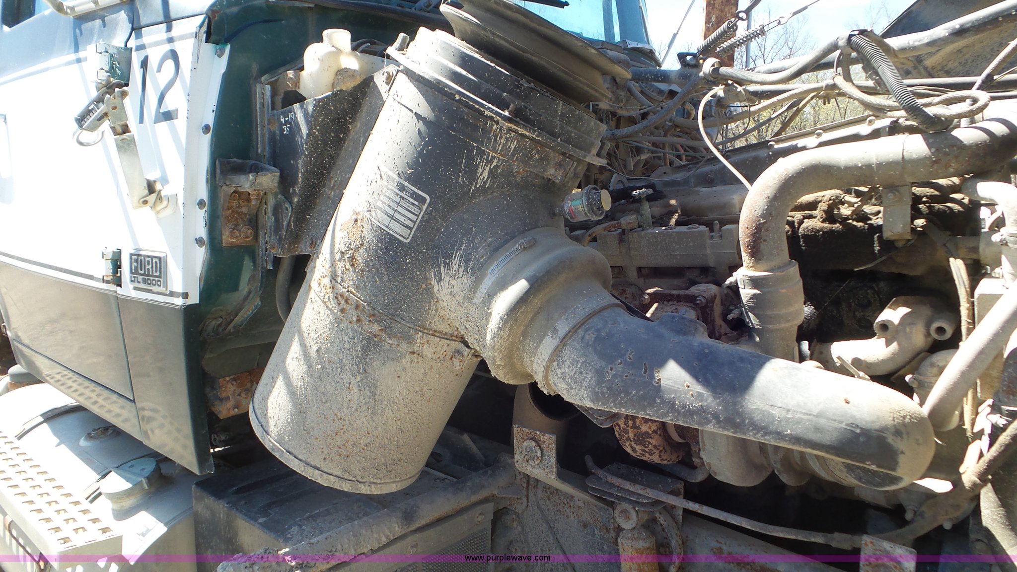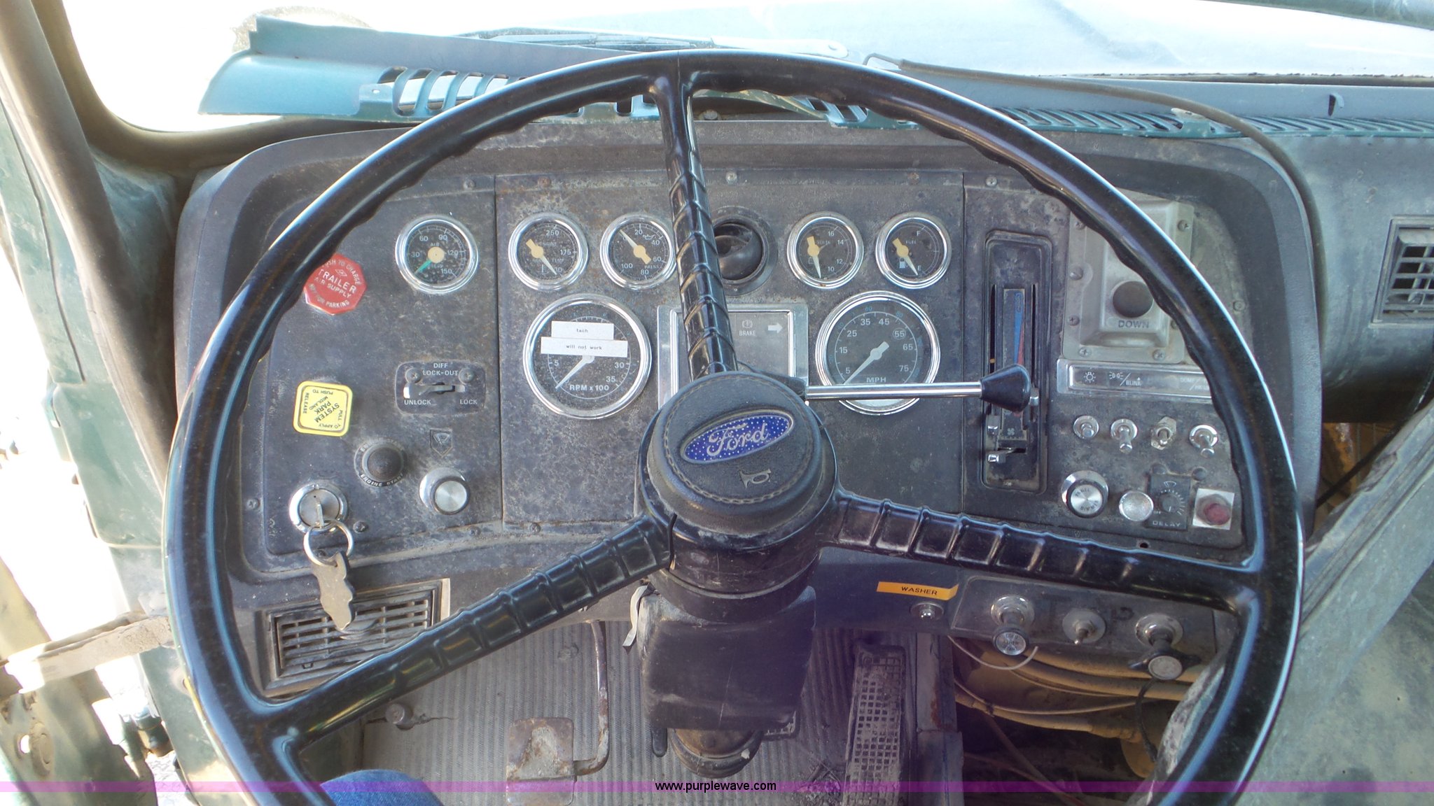 Purple Wave is selling a used Truck Chassis in Kansas. This item is a 1989 Ford LTL9000 truck cab and chassis with the following: 585,457 miles on odometer, Cummins NCT-315 six cylinder diesel engine, Eaton Fuller 13 speed manual transmission, Tandem axle, Heat, Air suspension seat, PTO, Exterior visor, Single exhaust stack, Single ram hoist, Dual fuel tanks, Spring over walking beam suspension, Air brakes, 214" wheelbase, 11R22.5 tires, GVWR 53,100 lbs, Transmission housing cracked, Frame cracked