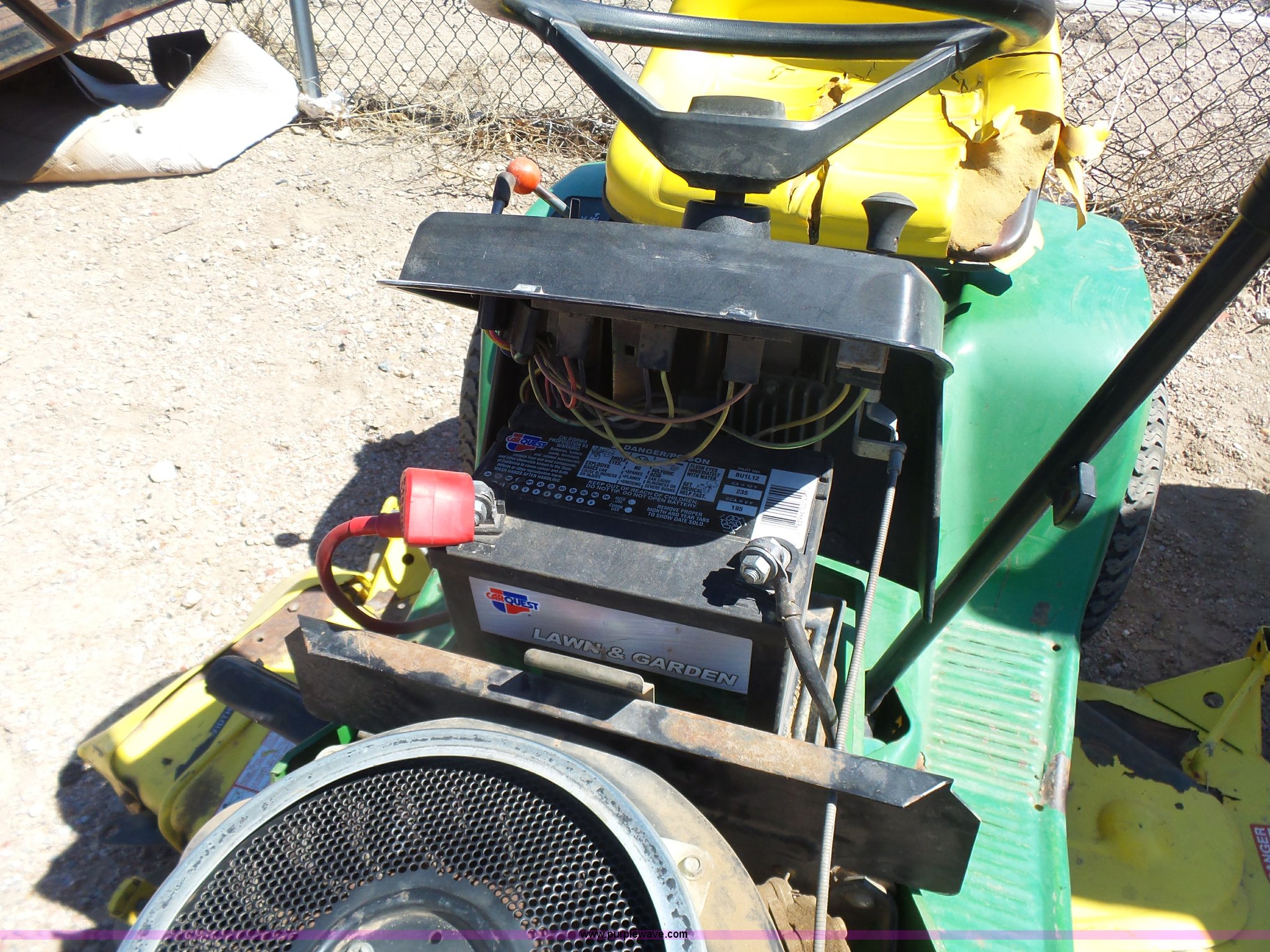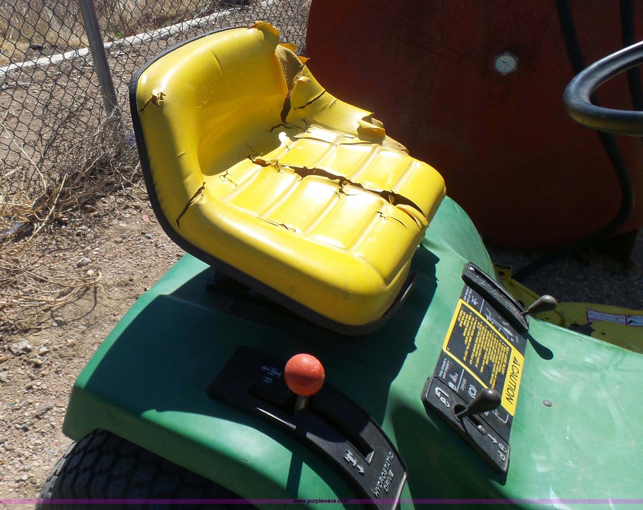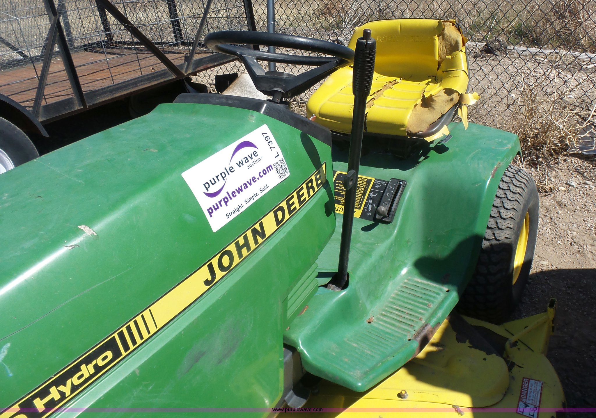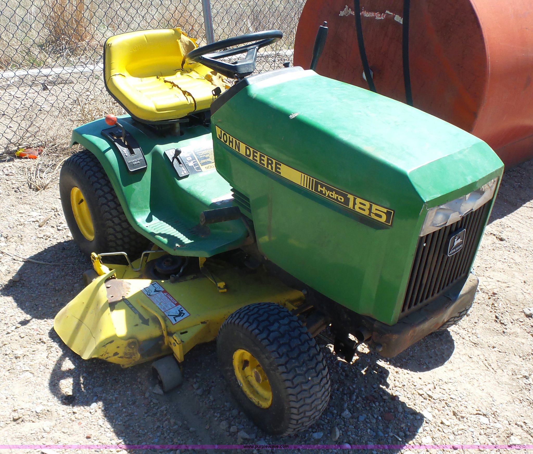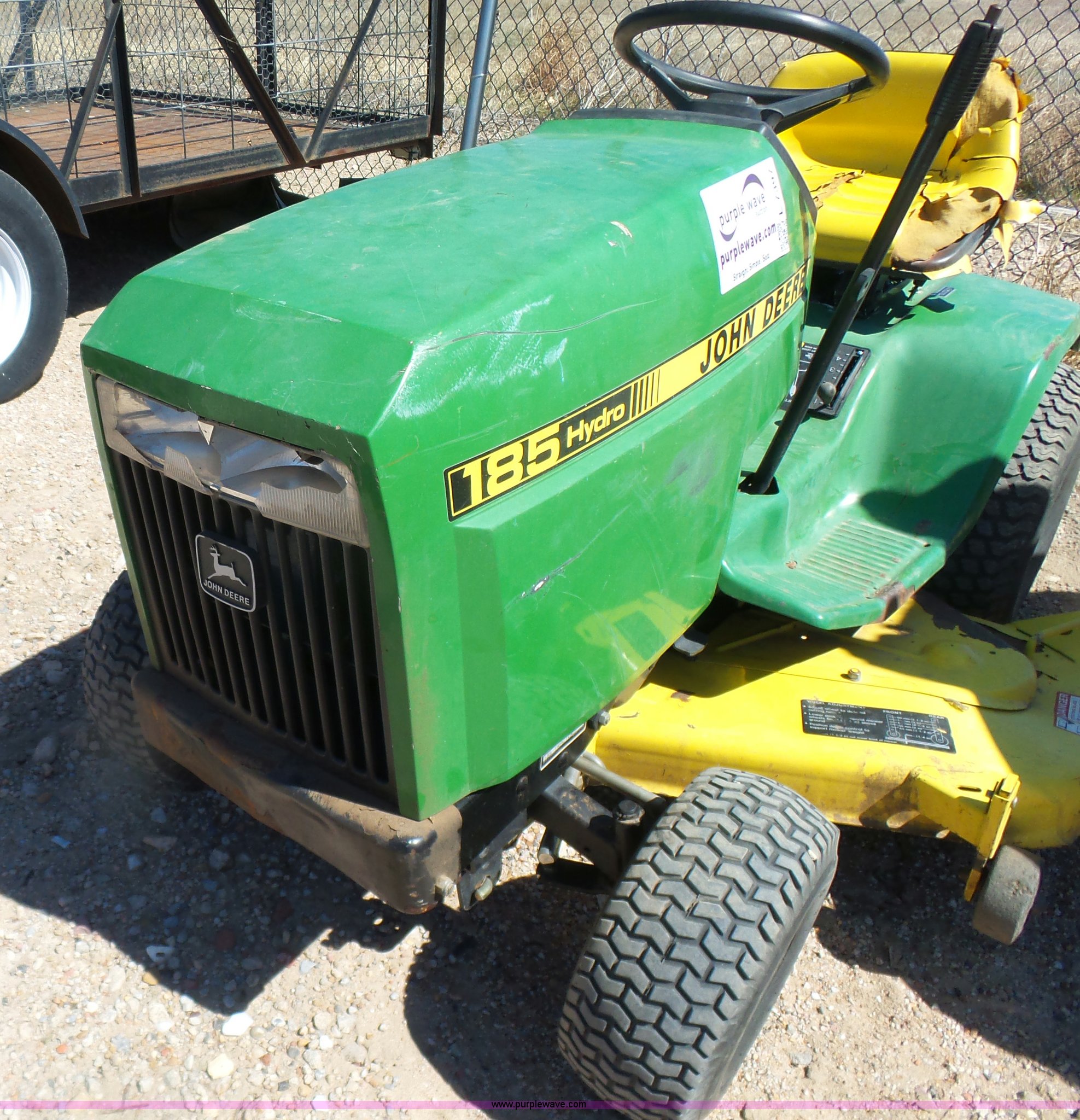 Purple Wave is selling a used Lawn Mower in Kansas. This item is a John Deere 185 Hydro lawn mower with the following: 42" cut, Gas engine, Model FC540V, Hydrostatic transmission, 16x6.00-6 front tires, 20x10.00-8 rear tires, Dead battery, Serial M00185B025759