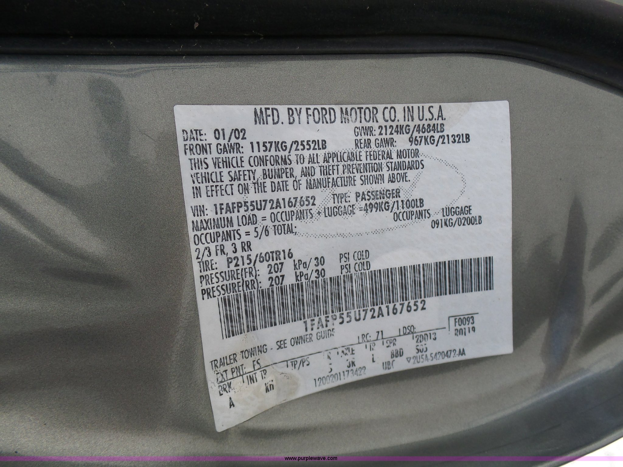 Purple Wave is selling a used Passenger Vehicle in Missouri. This item is a 2002 Ford Taurus SES with the following: 127,566 miles on odometer, 3.0L V6 OHV 12V gas engine, Automatic transmission, AC and heat, Tilt, Cruise, AM/FM/CD, Power windows, locks, mirrors, and seat, Cloth interior, Aluminum wheels, 215/60R16 tires, Unit# 2460