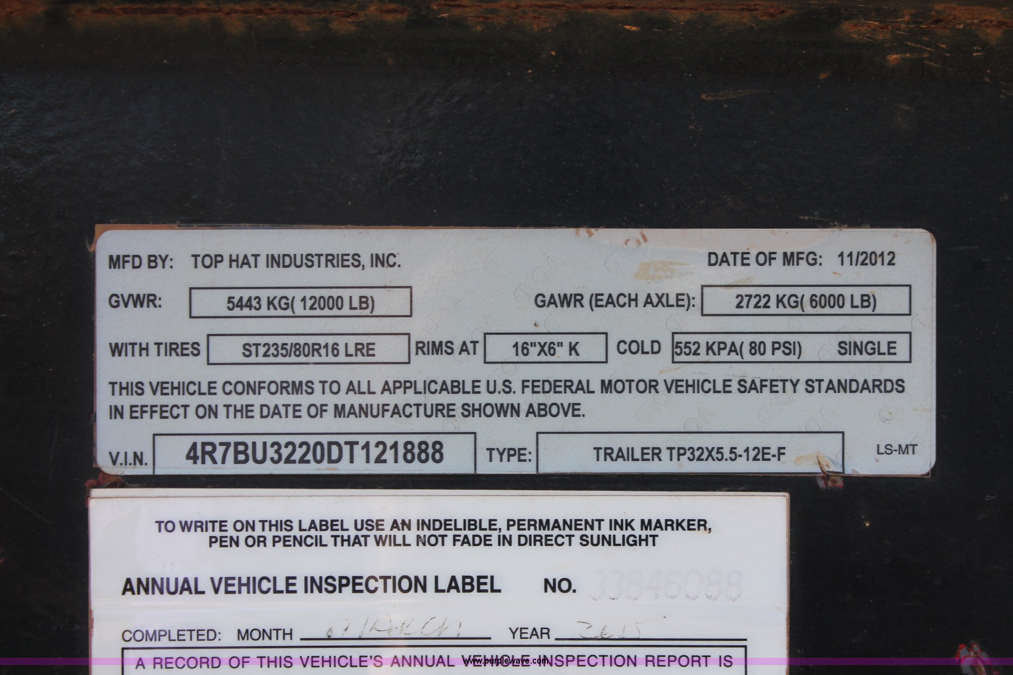 Purple Wave is selling a used Trailer Other in Oklahoma. This item is a 2013 Top Hat pipe trailer with the following: 36'L x 70"W, 32'L main deck, (3) 4'W ratchet winch straps, 2 5/16" ball hitch, Single leg landing gear, Spring suspension, Electric brakes, Tandem axle, Steel wheels, ST235/80R16 tires, GVWR 12,000 lbs, GAWR 6,000 lbs