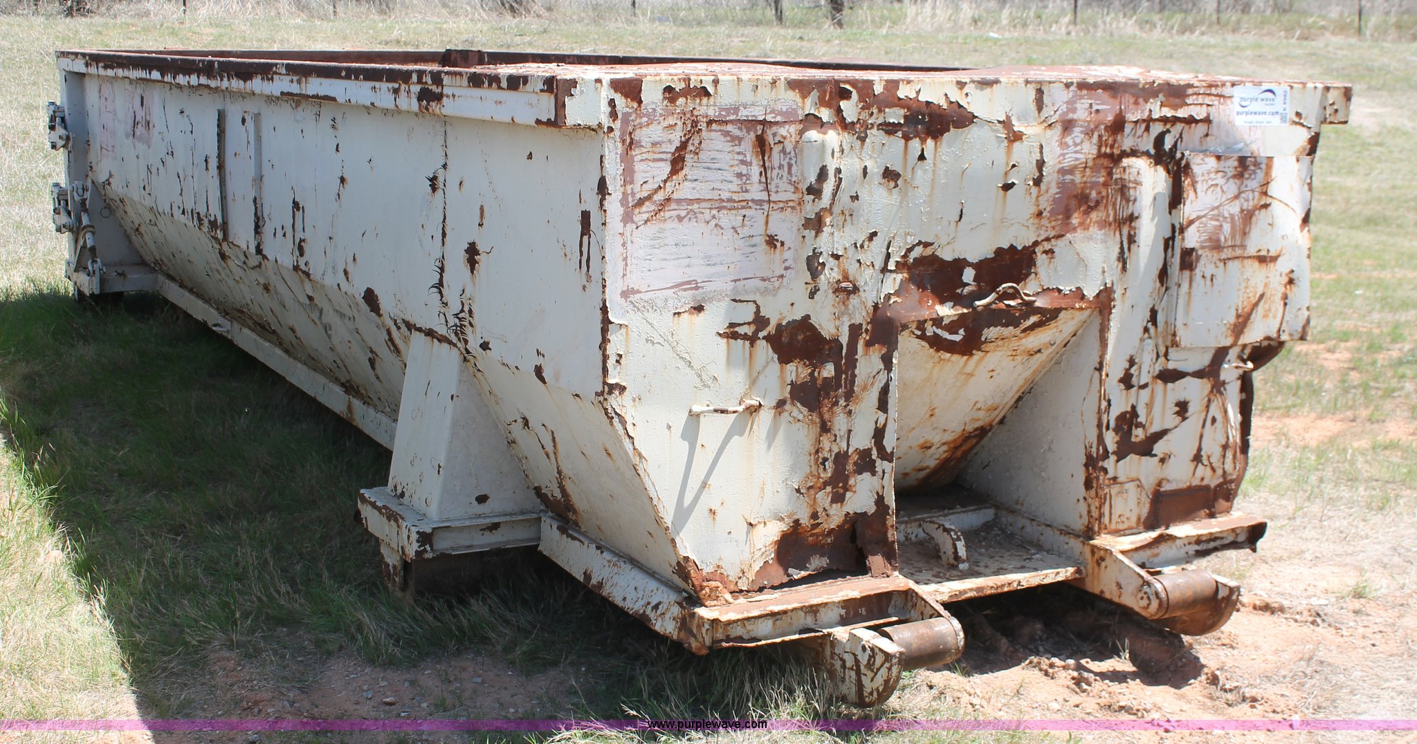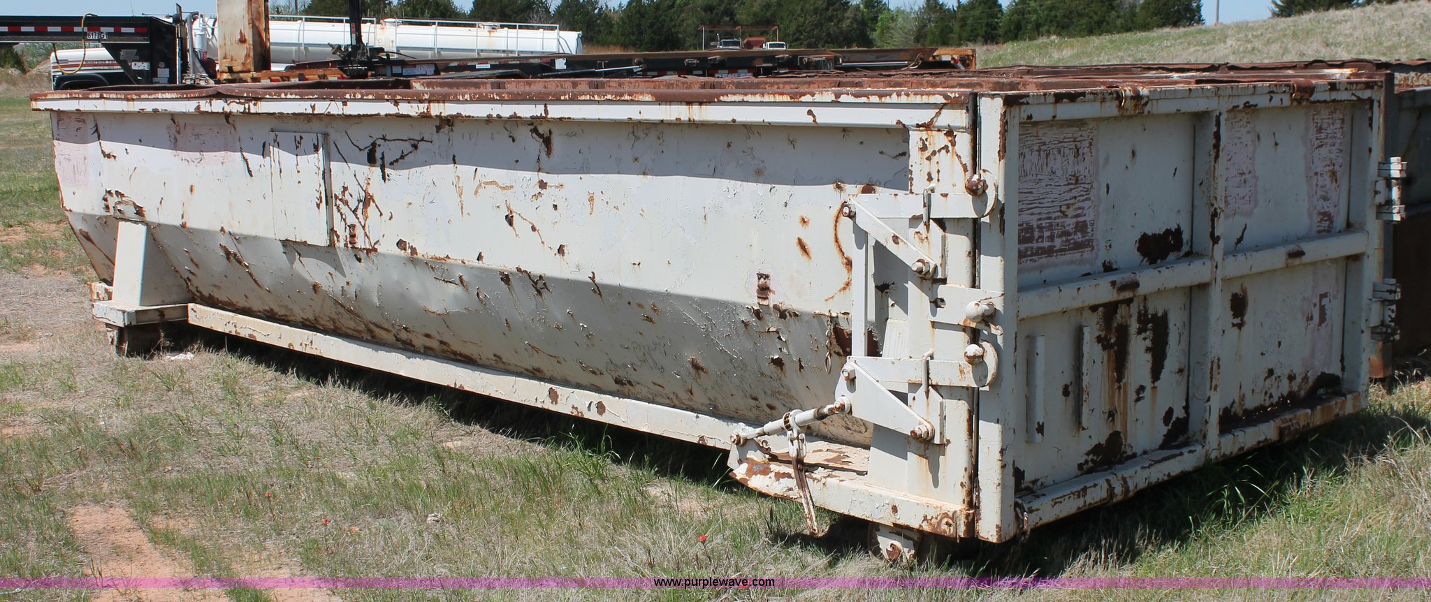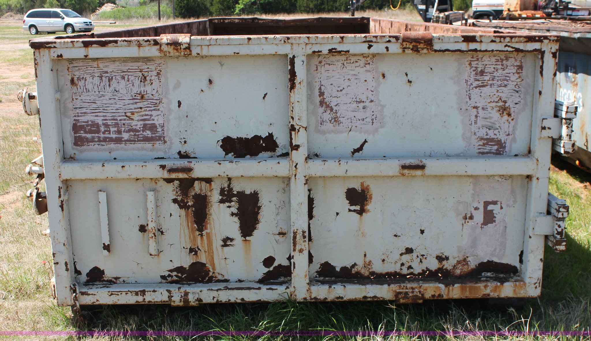 Purple Wave is selling a used Refuse or Compaction Equip. in Oklahoma. This item is a Roll off container with the following: 11'L x 90"W overall, 20'L x 80"W interior, 56"H side walls, 20 cu. yd. capacity, Rear discharge door, Steel construction, Steel caster rollers, Contents will be removed