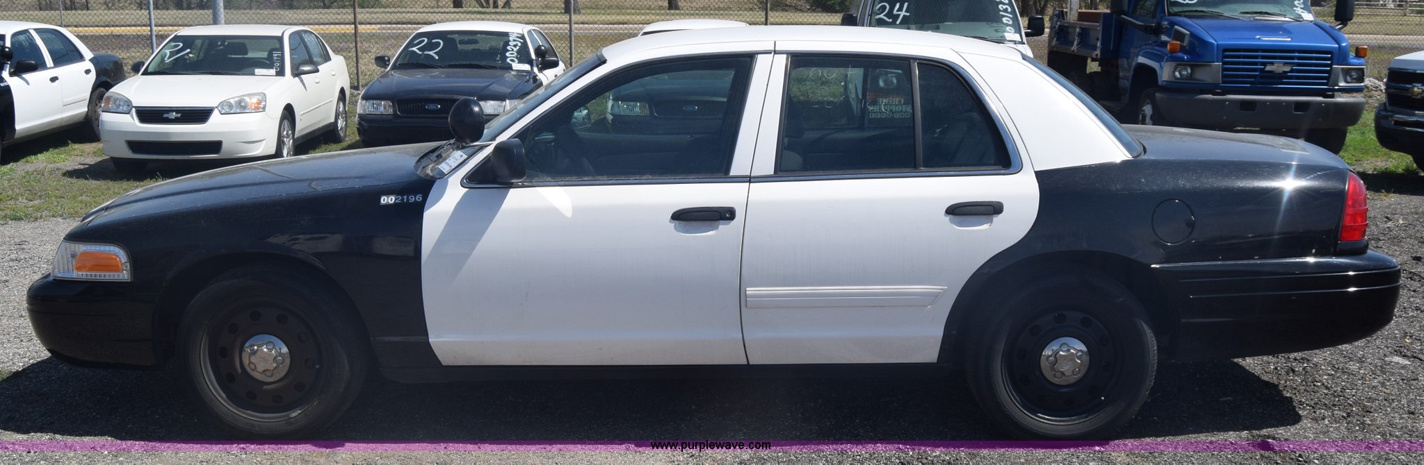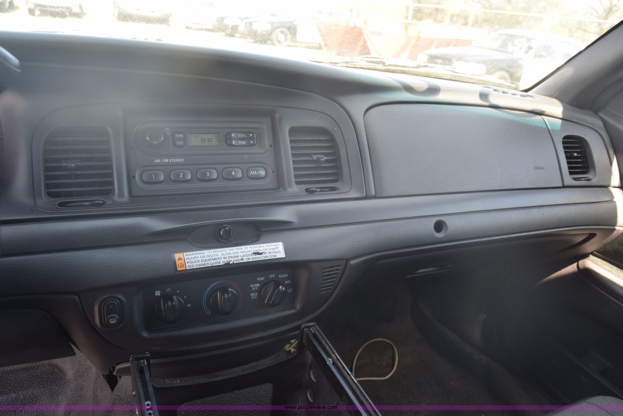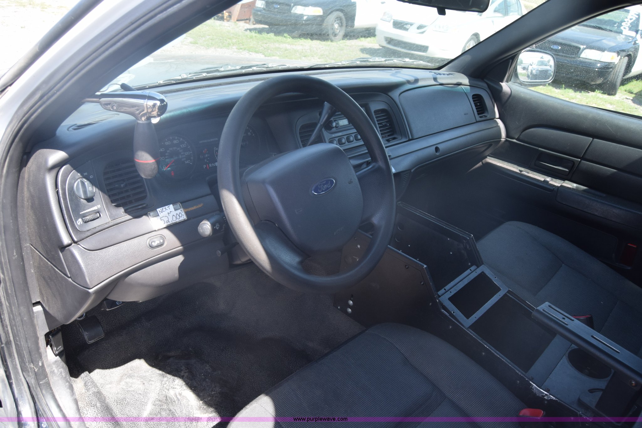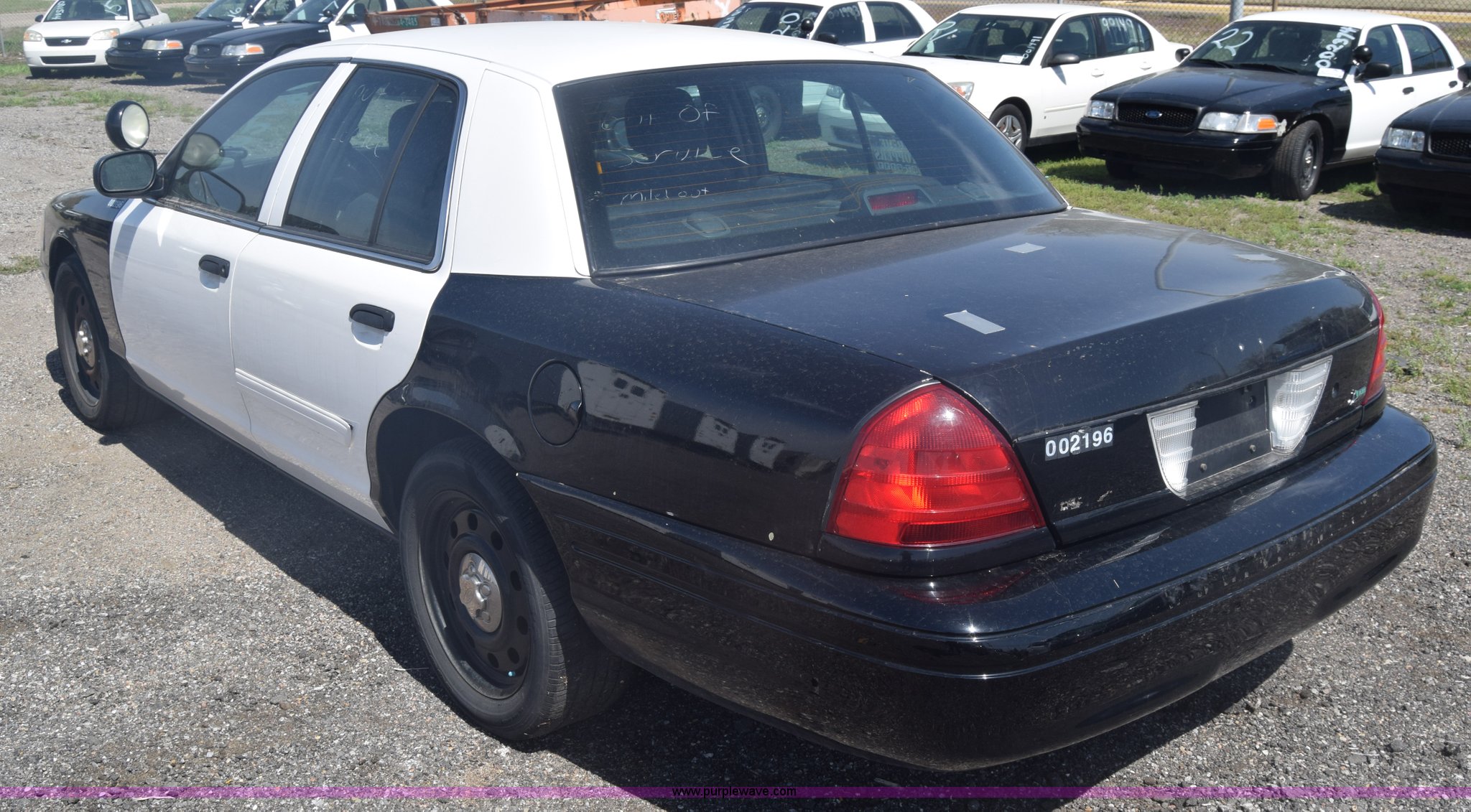 Purple Wave is selling a used Passenger Vehicle in Kansas. This item is a 2010 Ford Crown Victoria Police Interceptor with the following: 150,684 miles on odometer, 4.6L V8 SOHC 16V FFV gas engine, Automatic transmission, AC and heat, Tilt, AM/FM, Power windows, locks, and mirrors, Cloth front interior, Vinyl rear interior, Spotlight, P235/55R17 tires, Interior/exterior cosmetic damage, Weak battery, Port holes in roof and trunk, Scratches, Dents, Unit# 002196