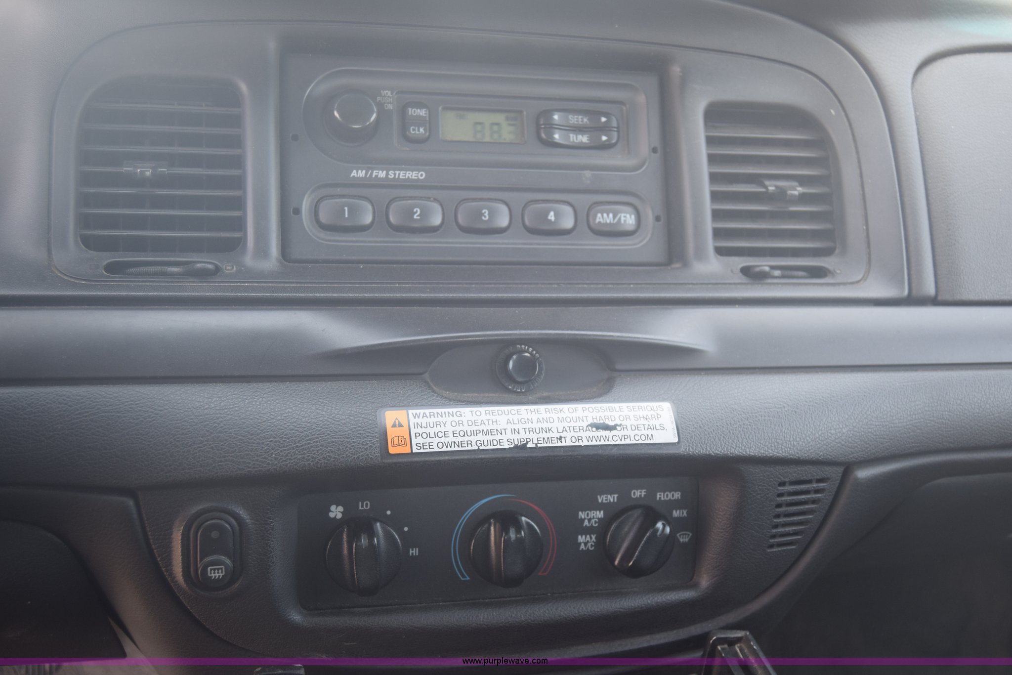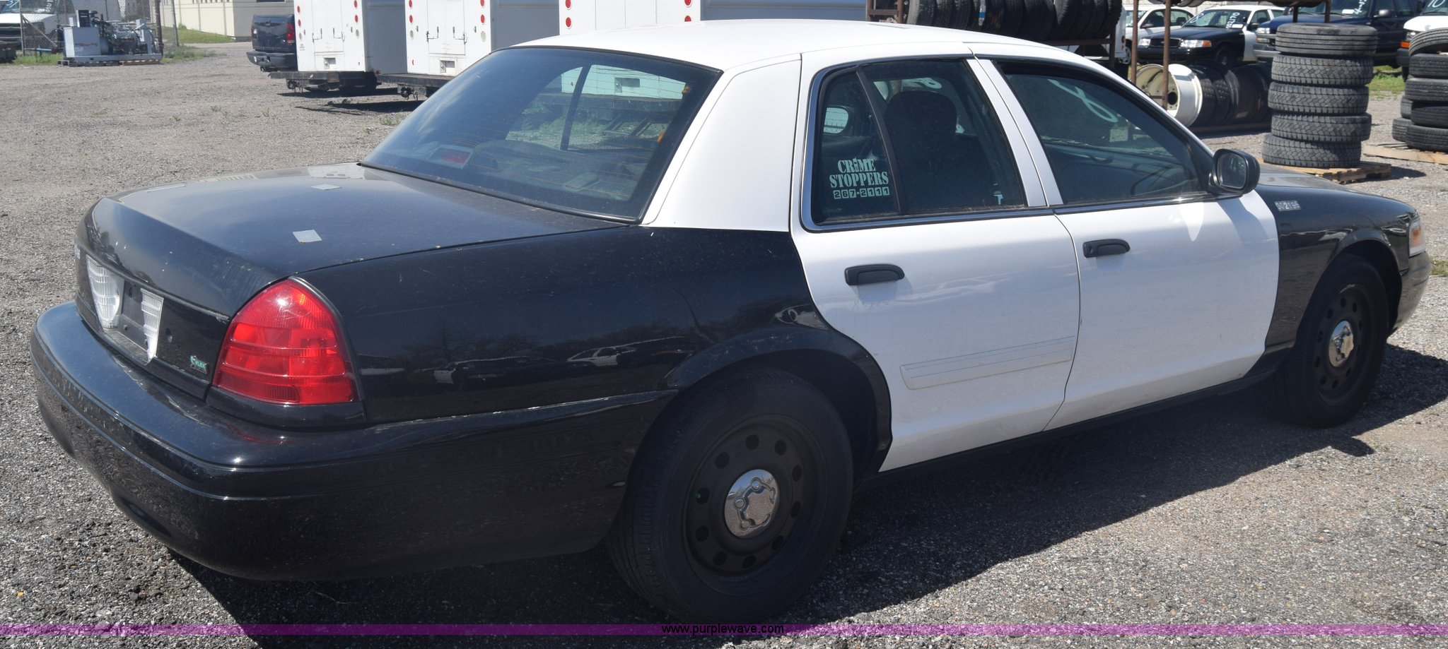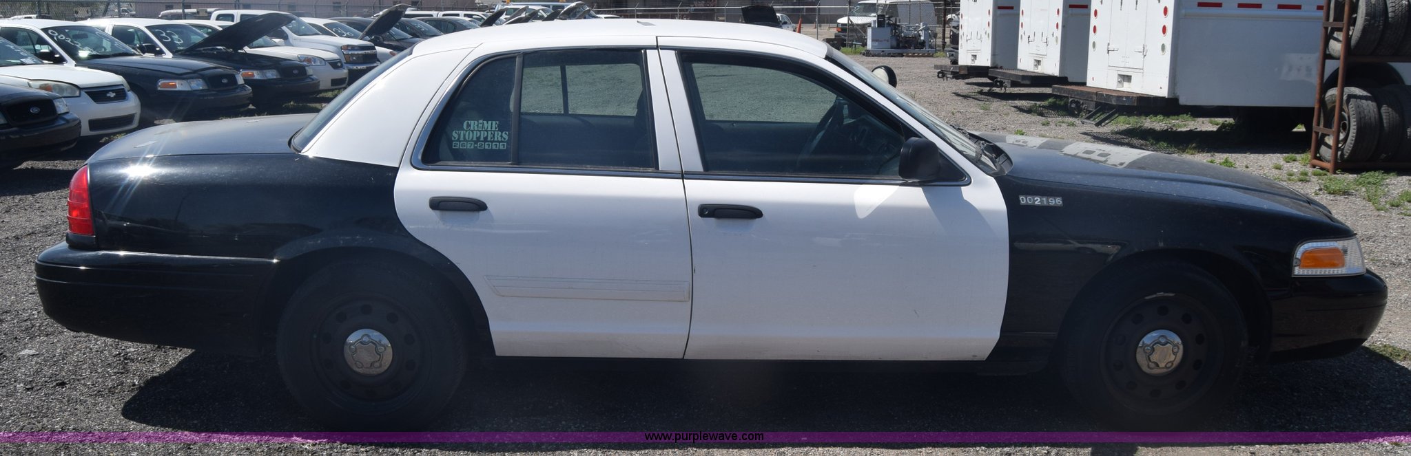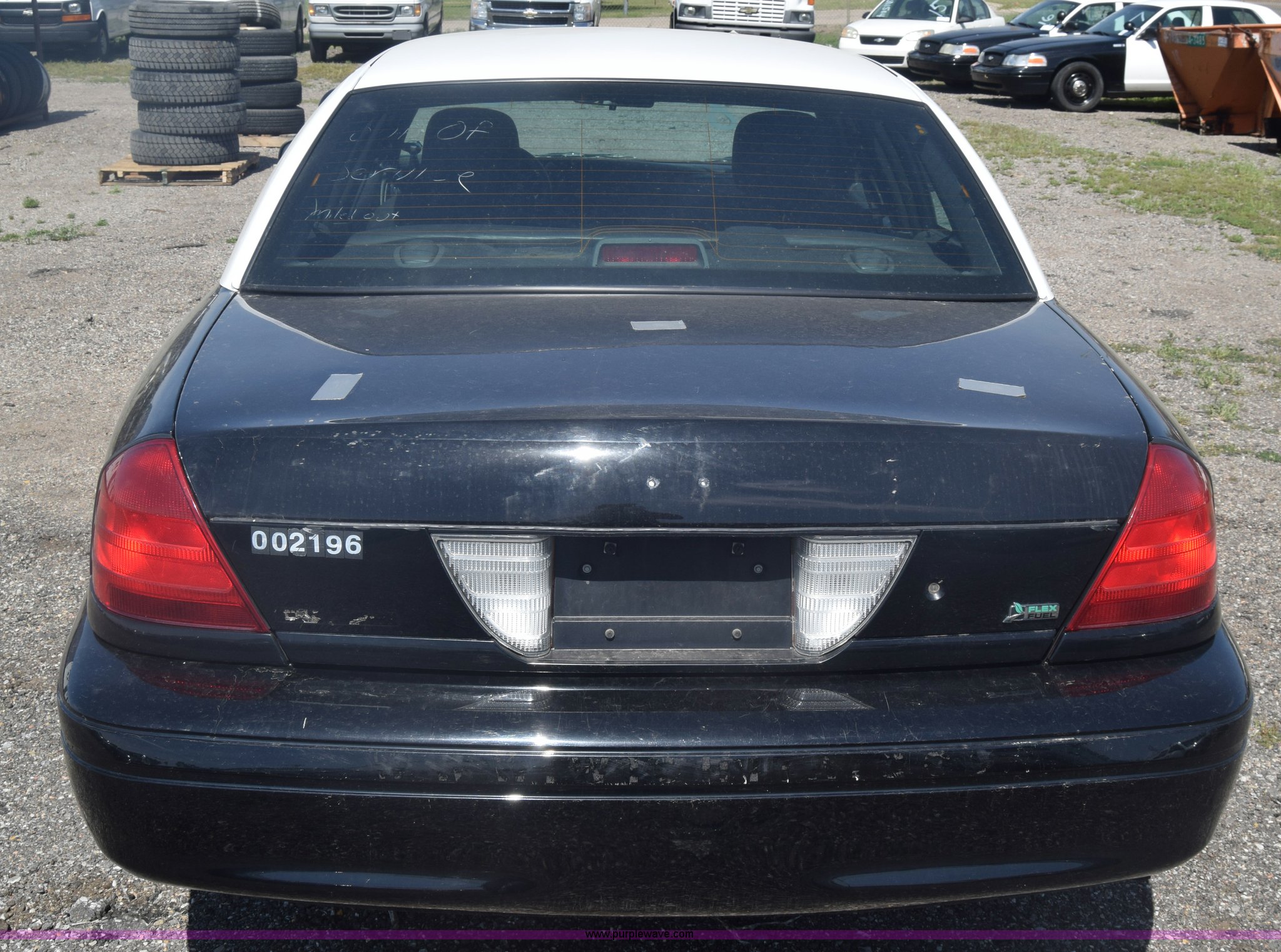 Purple Wave is selling a used Passenger Vehicle in Kansas. This item is a 2010 Ford Crown Victoria Police Interceptor with the following: 150,684 miles on odometer, 4.6L V8 SOHC 16V FFV gas engine, Automatic transmission, AC and heat, Tilt, AM/FM, Power windows, locks, and mirrors, Cloth front interior, Vinyl rear interior, Spotlight, P235/55R17 tires, Interior/exterior cosmetic damage, Weak battery, Port holes in roof and trunk, Scratches, Dents, Unit# 002196