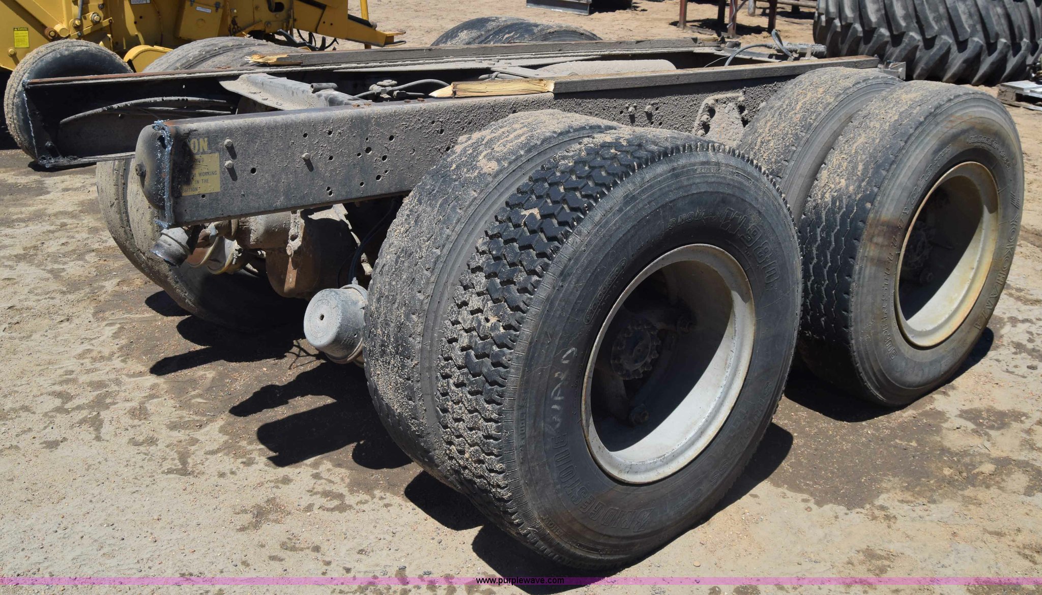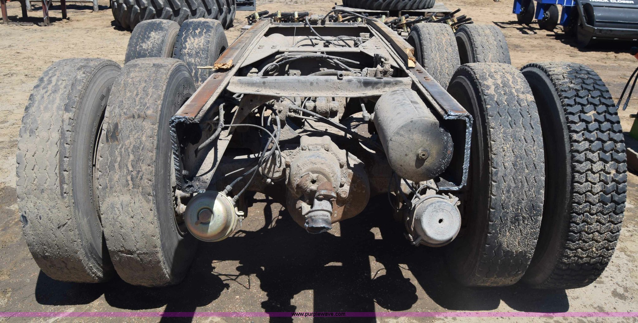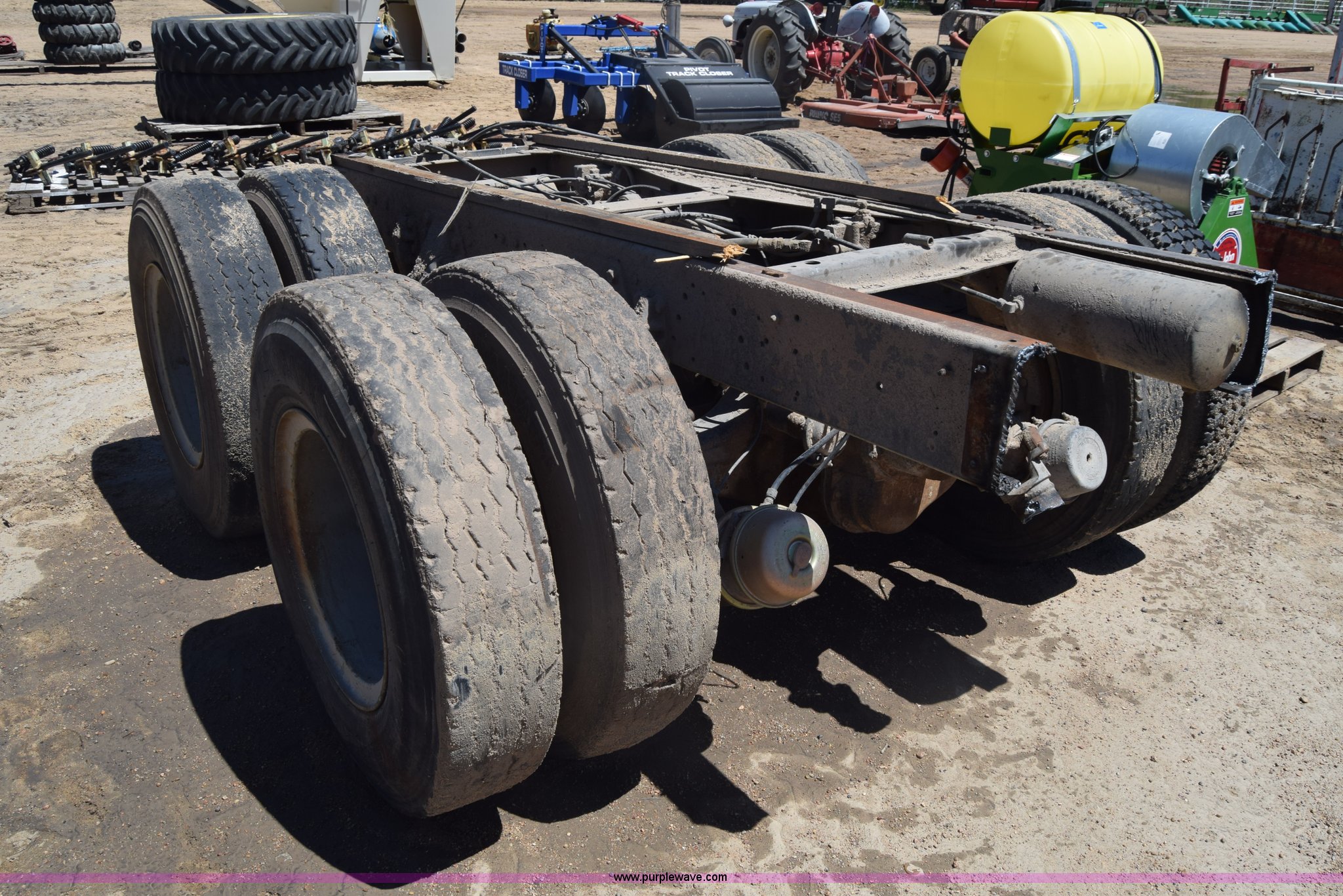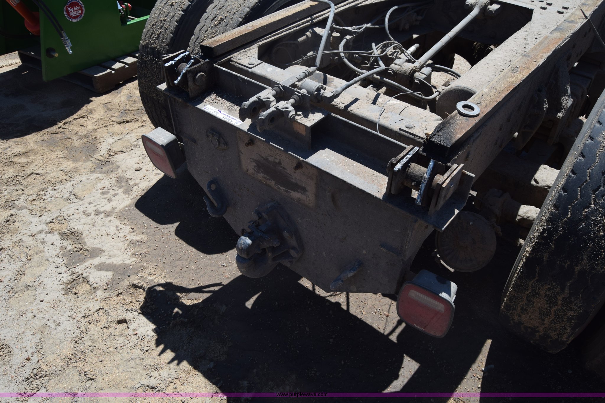 Purple Wave is selling a used Truck Part and Attach. in Kansas. This item is a Semi truck rear end with the following: Lights, Pintle hitch, Spring suspension, Air brakes, Tandem axle, 10.00R20 tires
