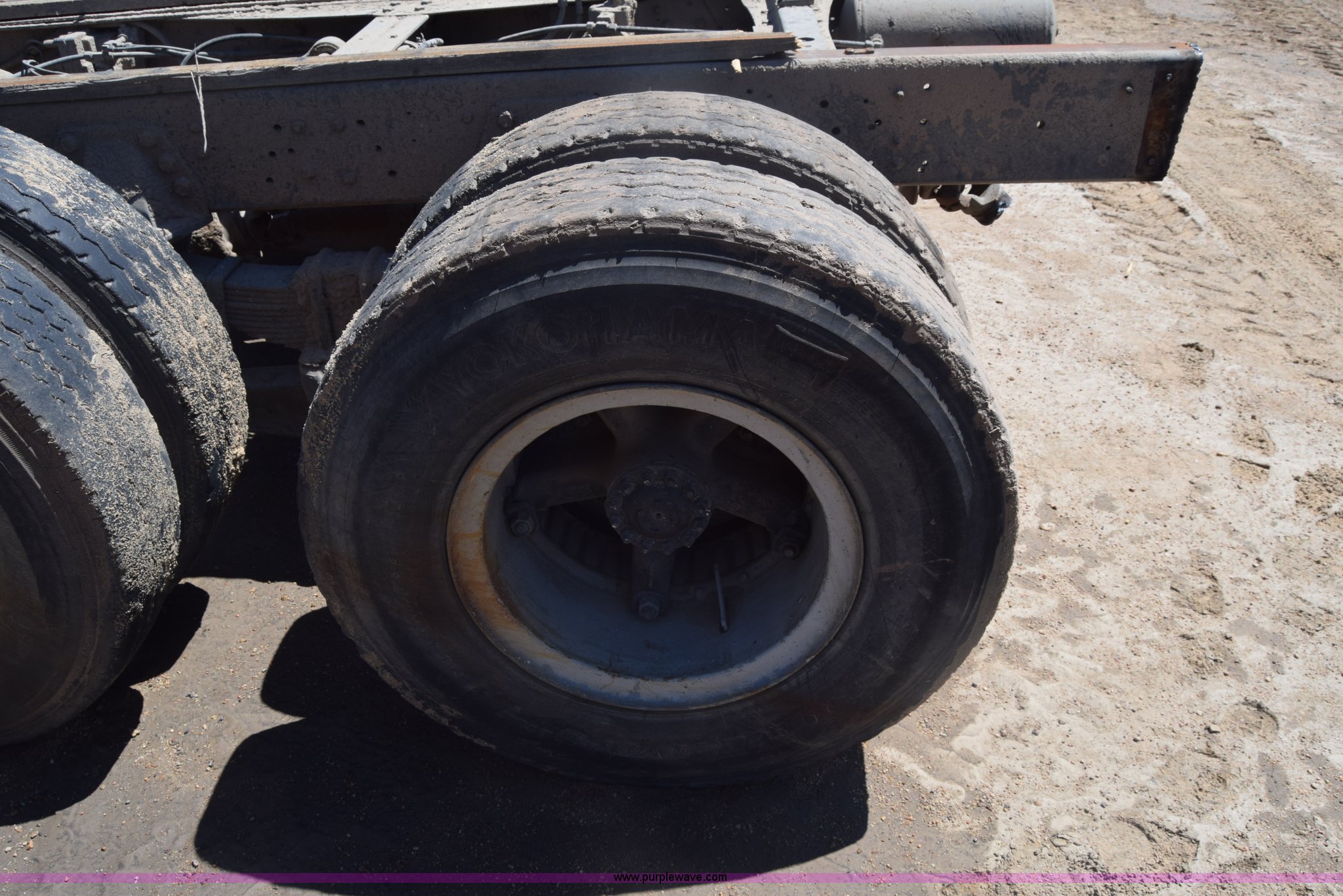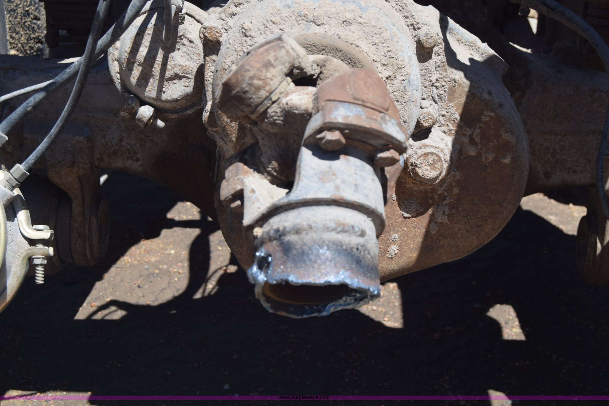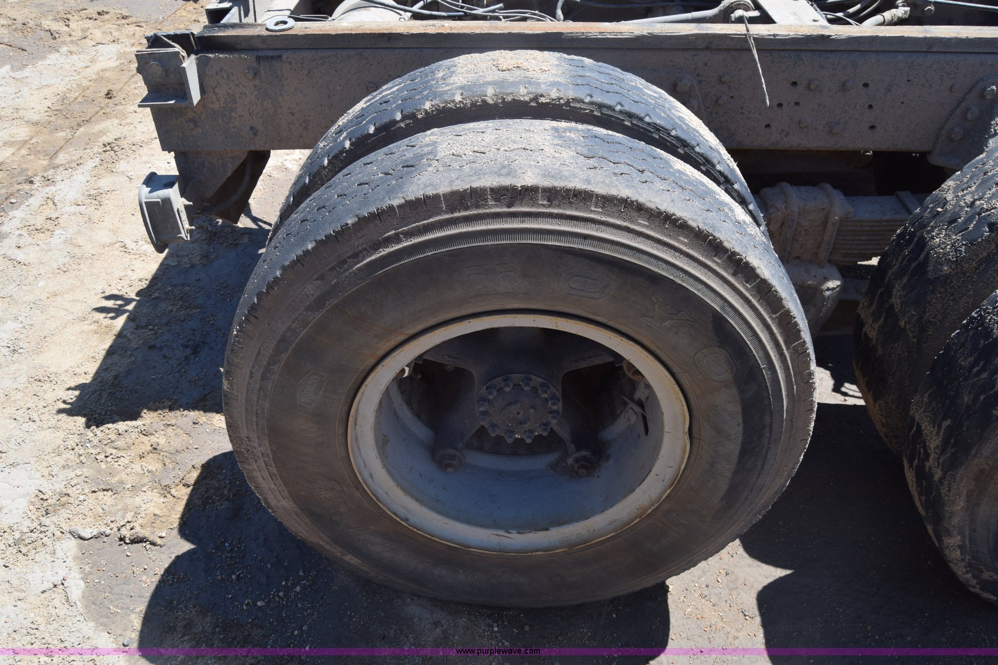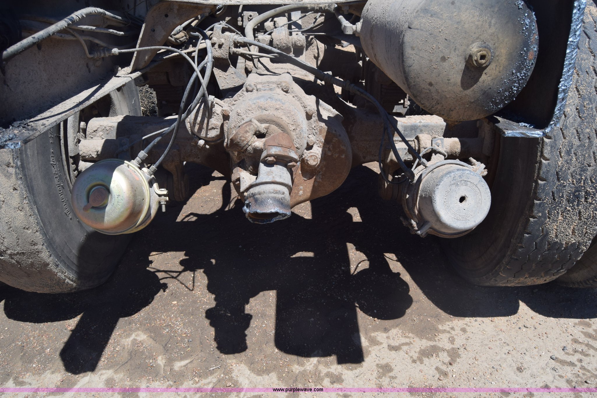 Purple Wave is selling a used Truck Part and Attach. in Kansas. This item is a Semi truck rear end with the following: Lights, Pintle hitch, Spring suspension, Air brakes, Tandem axle, 10.00R20 tires