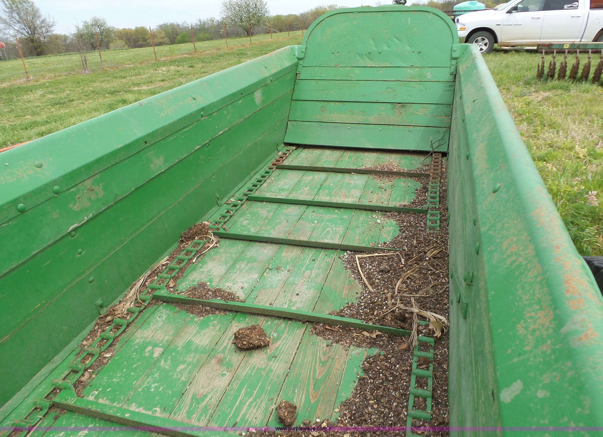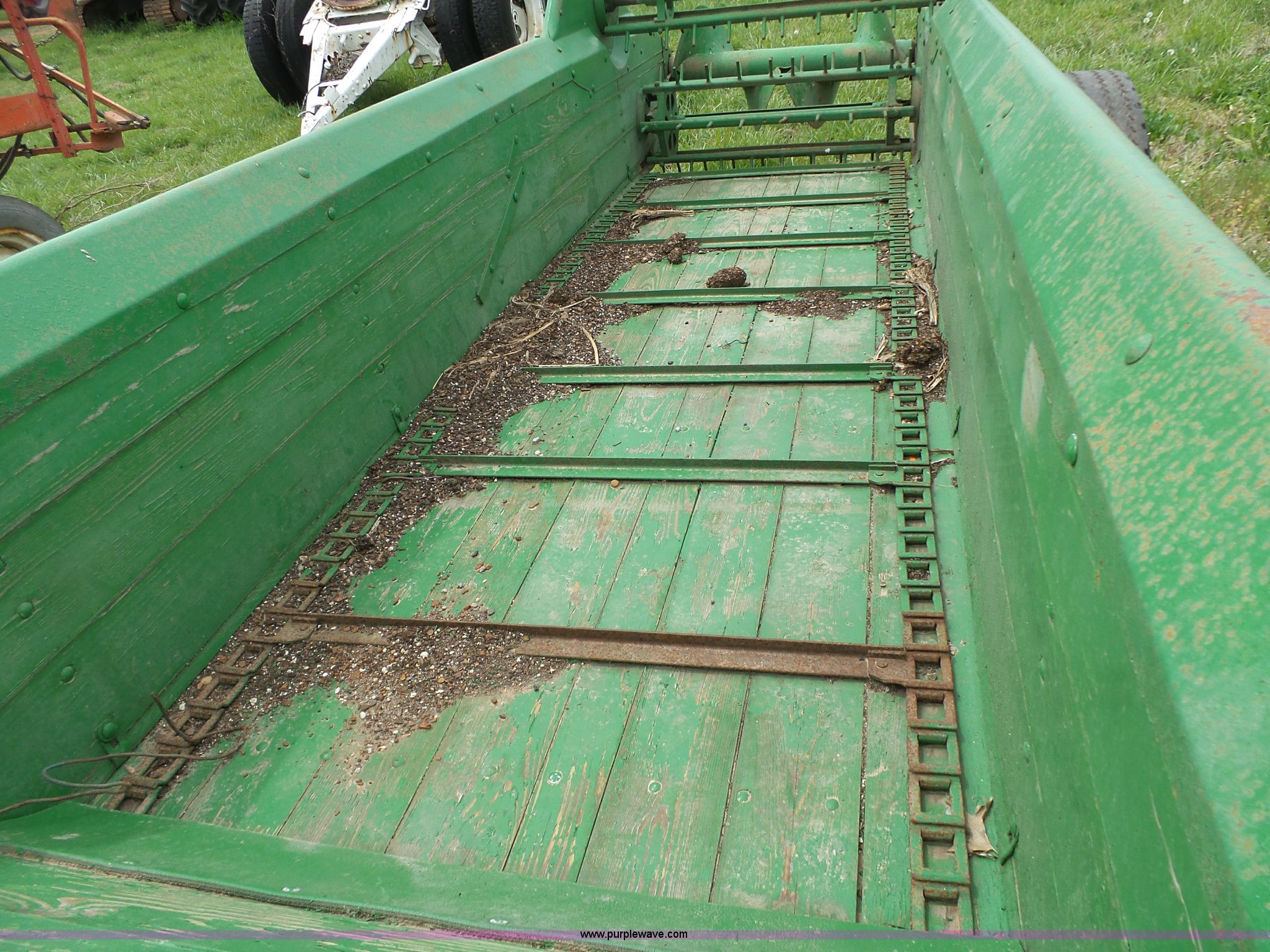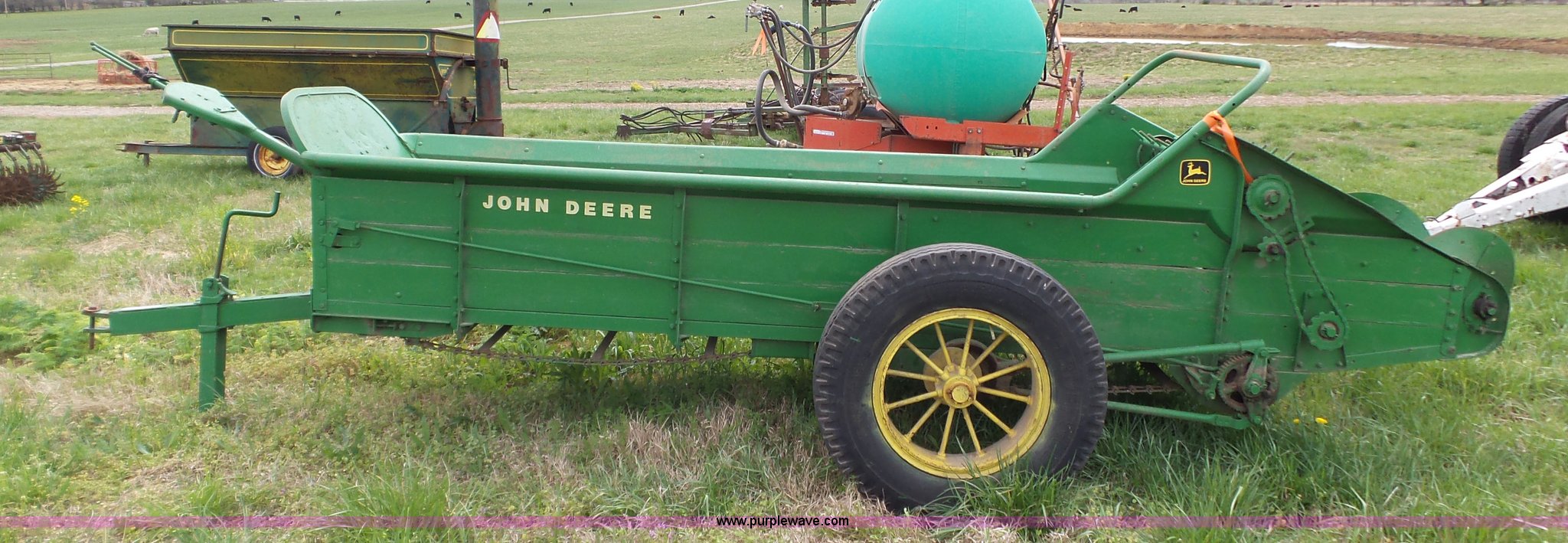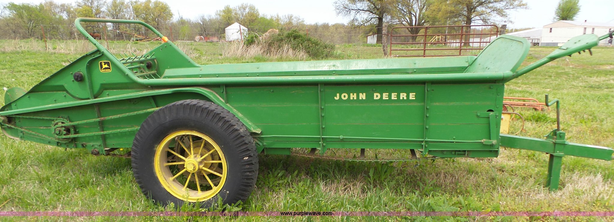 Purple Wave is selling a used Manure Spreader in Missouri. This item is a John Deere R manure spreader with the following: 10'L x 40"W, Ground drive, Pin hitch, 8.25-20 tires