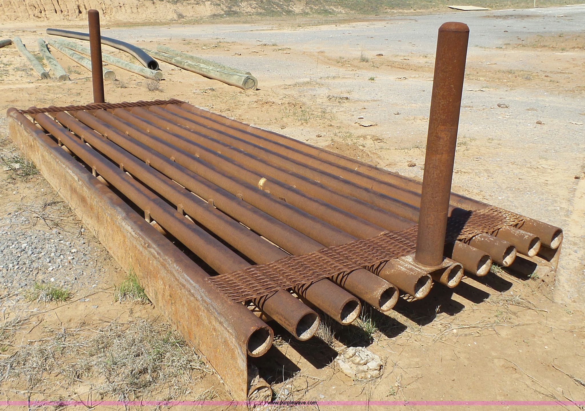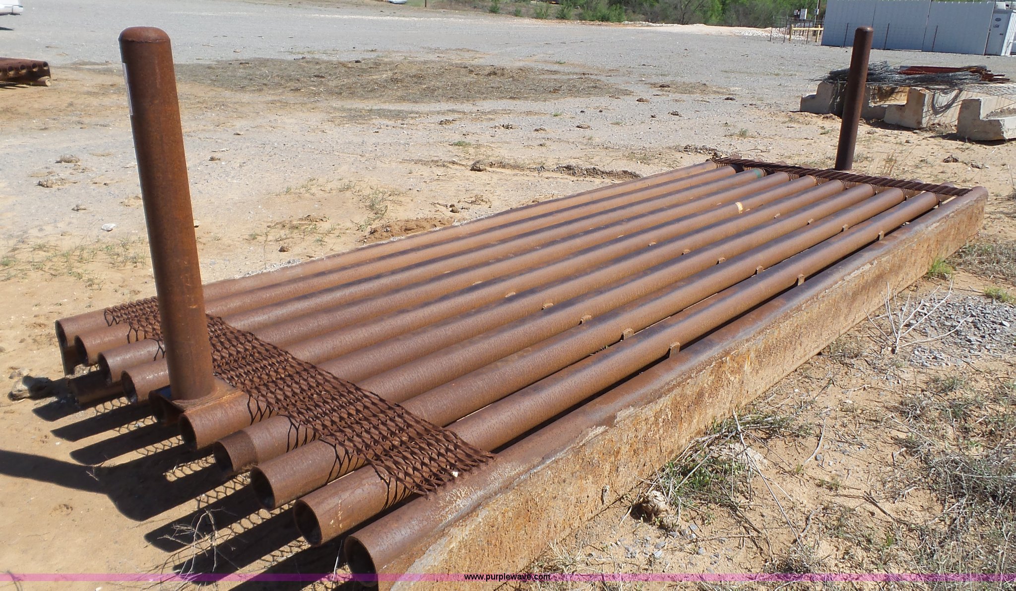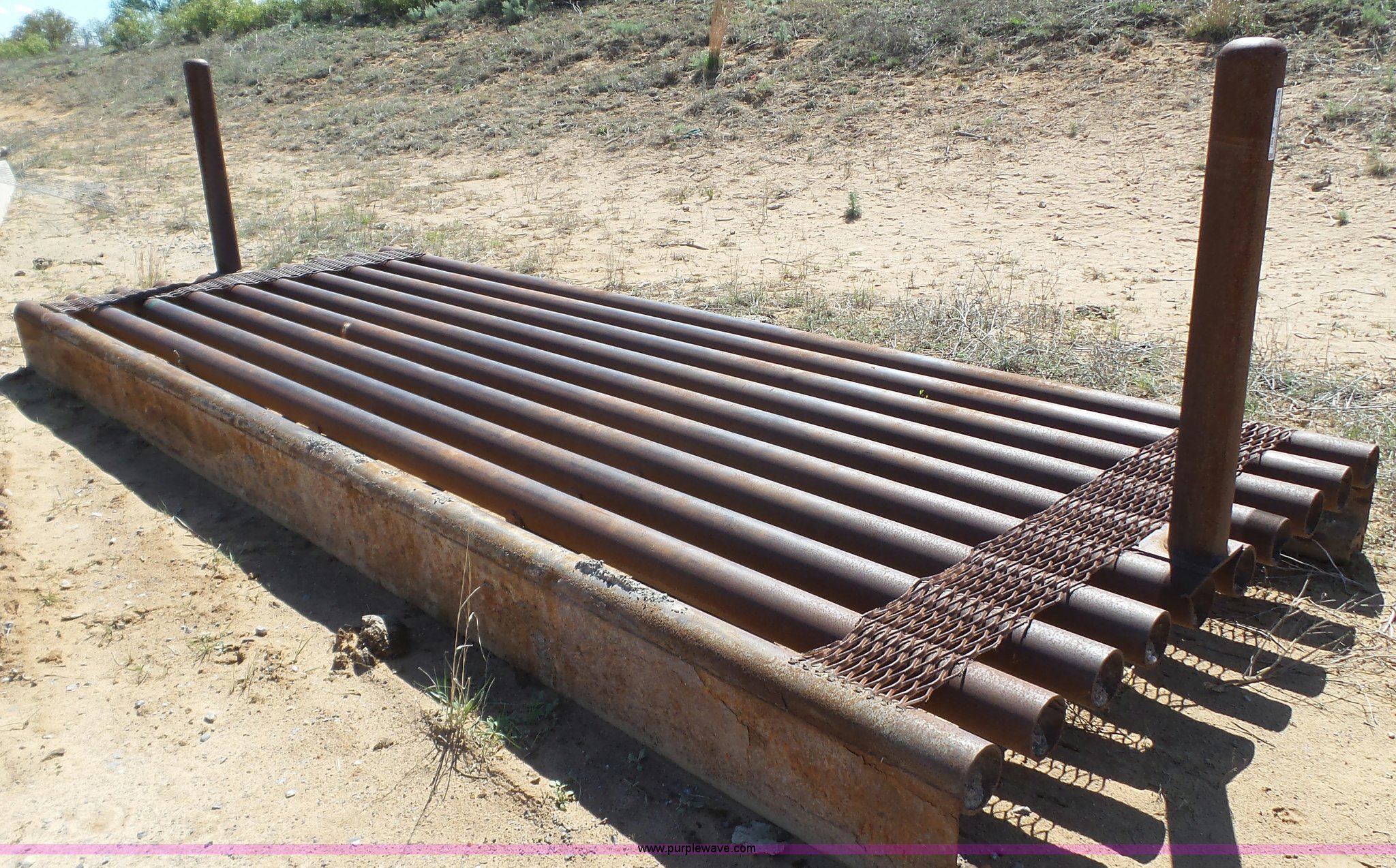 Purple Wave is selling a used Livestock Equip. in Texas. This item is a Cattle guard with the following: 20' x 8', 4" pipe construction, Concrete pillars