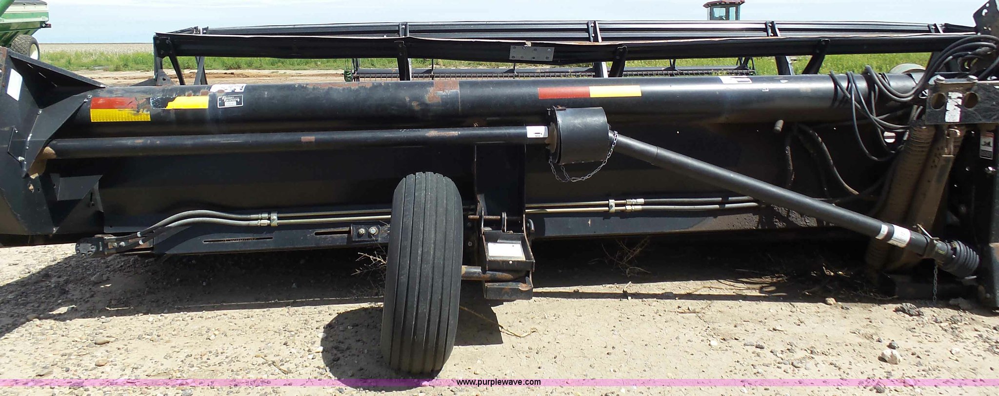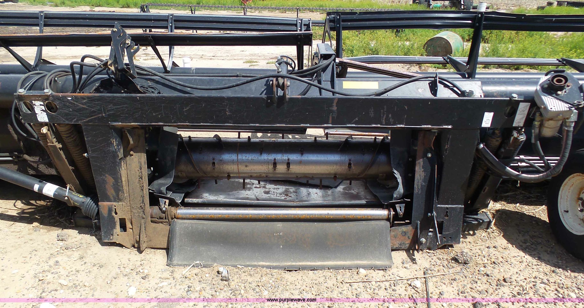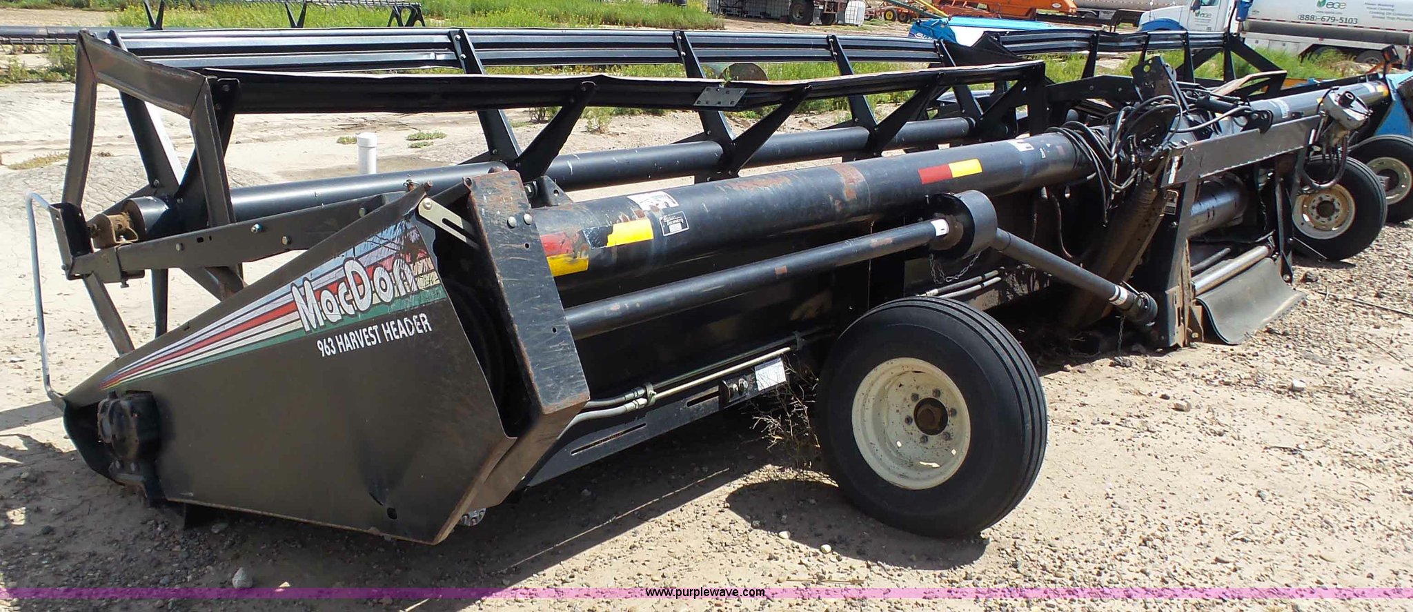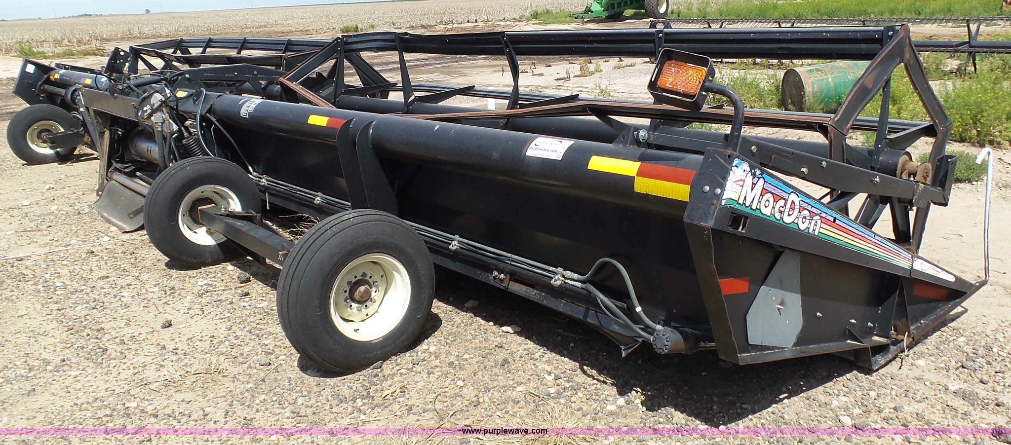 Purple Wave is selling a used Platform or Stripper Head in Kansas. This item is a 2005 MacDon 963 draper head with the following: 36'W, Two section bat reel, Hydraulic reel height adjust, Single driveline, Transport package, 9.5L-14SL tires, John Deere 80 series set up, Cosmetic damage, Roller belt assembly will be installed prior to auction, Welds, Serial 163594
