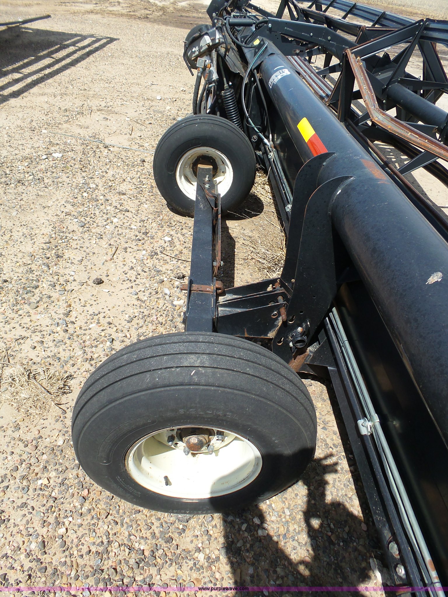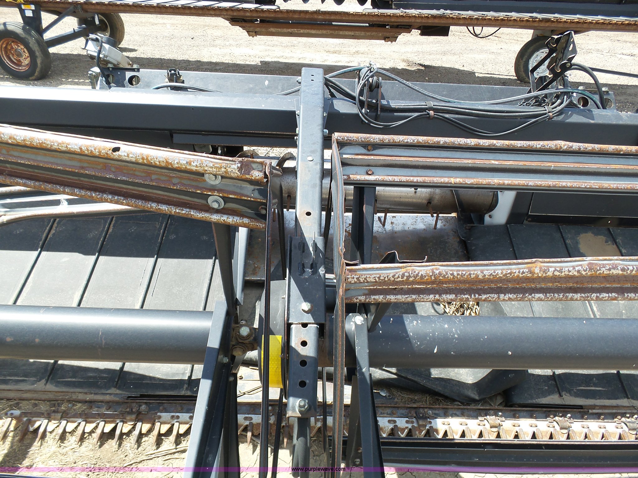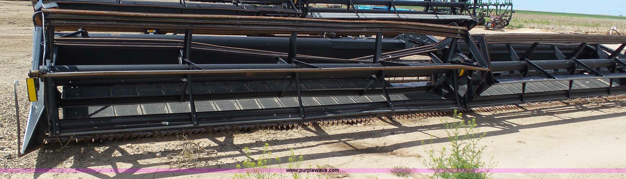 Purple Wave is selling a used Platform or Stripper Head in Kansas. This item is a 2005 MacDon 963 draper head with the following: 36'W, Two section bat reel, Hydraulic reel height adjust, Single driveline, Transport package, 9.5L-14SL tires, John Deere 80 series set up, Cosmetic damage, Roller belt assembly will be installed prior to auction, Welds, Serial 163594