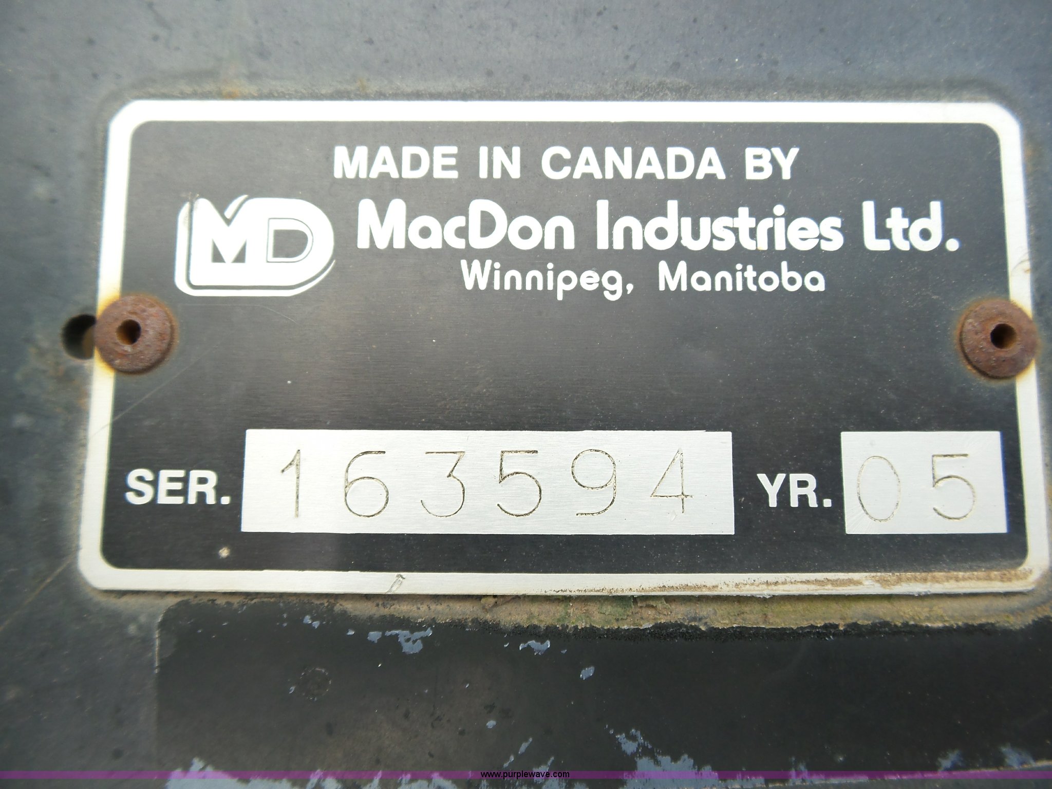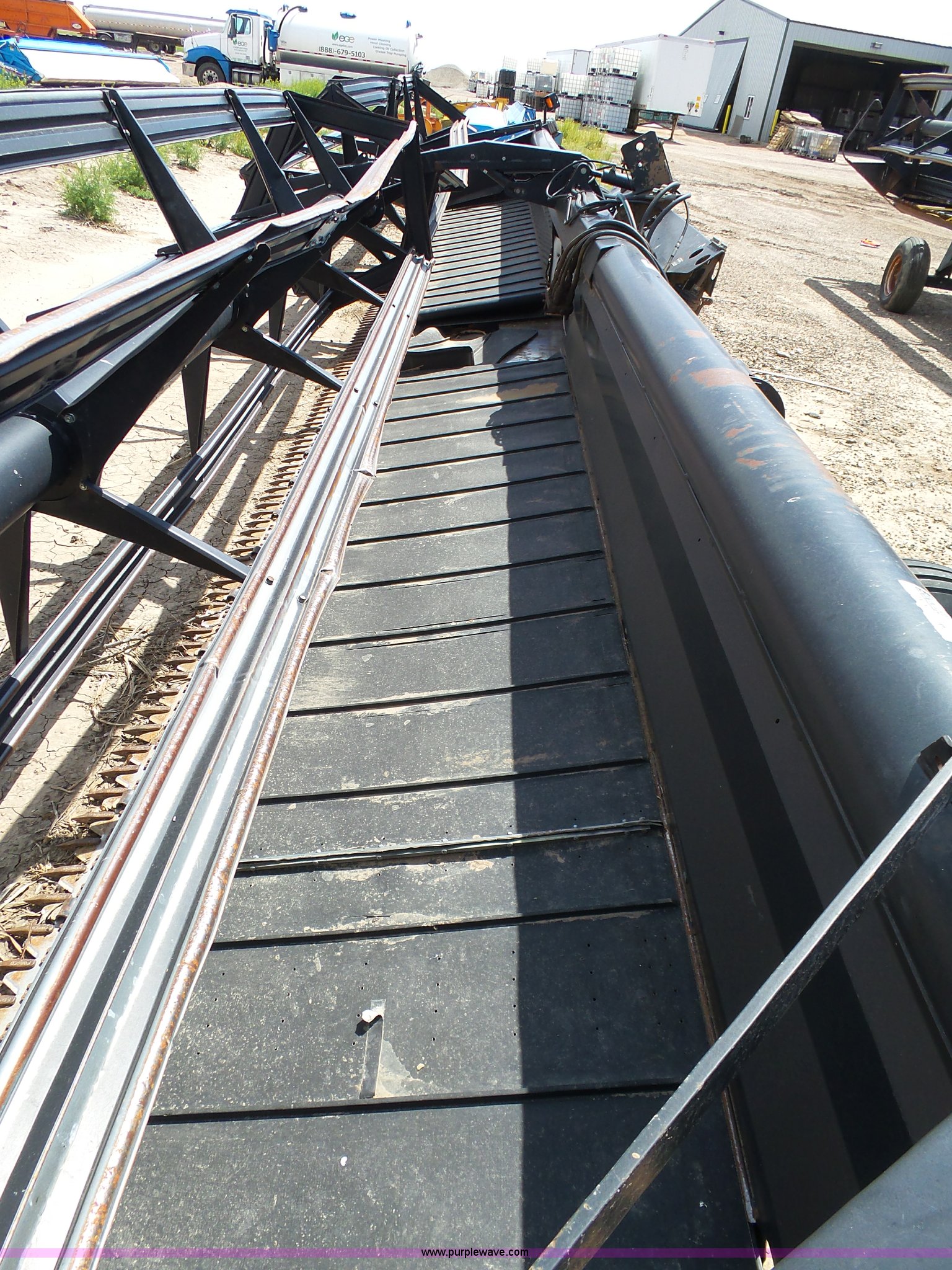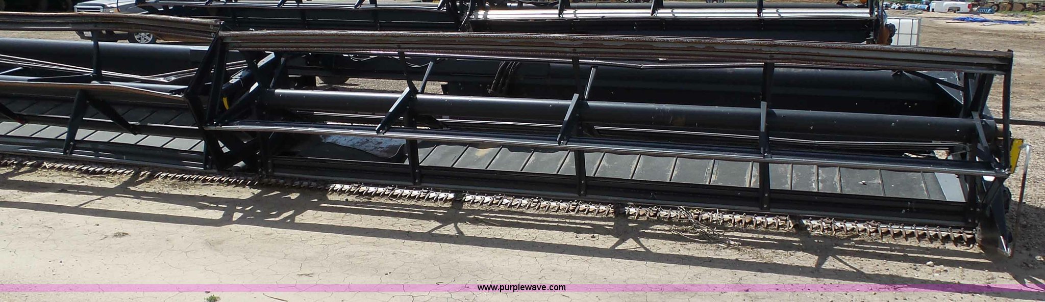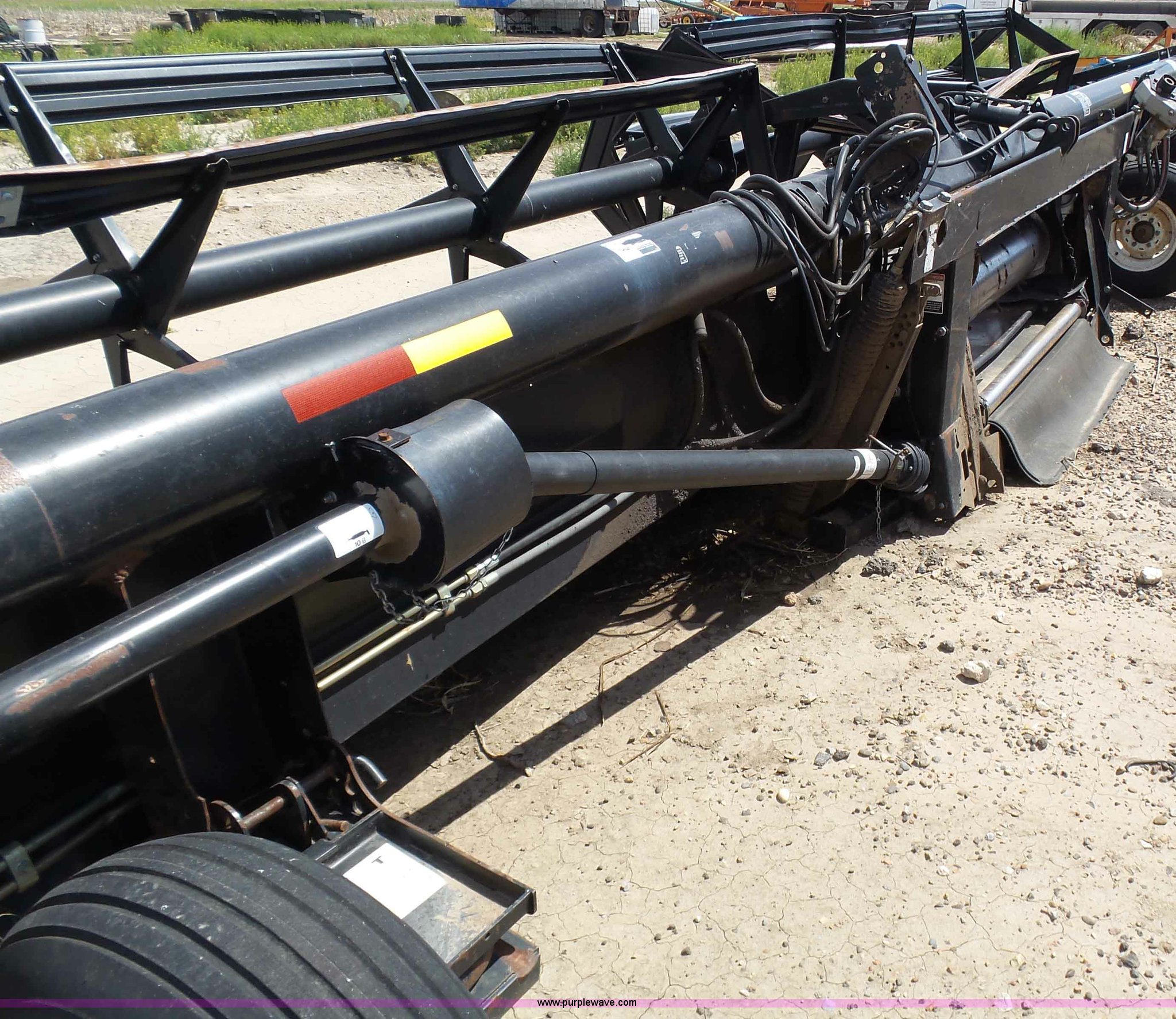 Purple Wave is selling a used Platform or Stripper Head in Kansas. This item is a 2005 MacDon 963 draper head with the following: 36'W, Two section bat reel, Hydraulic reel height adjust, Single driveline, Transport package, 9.5L-14SL tires, John Deere 80 series set up, Cosmetic damage, Roller belt assembly will be installed prior to auction, Welds, Serial 163594