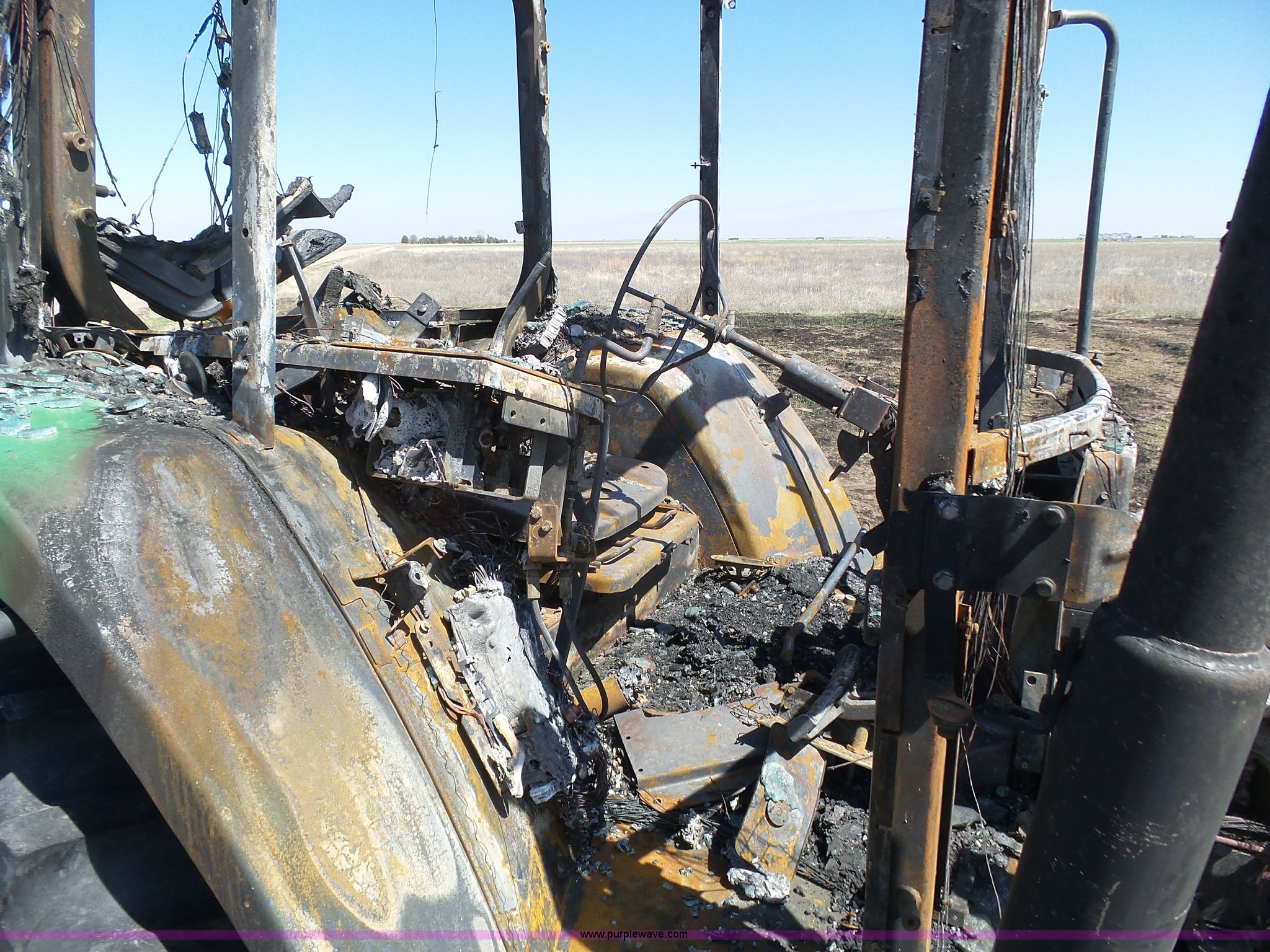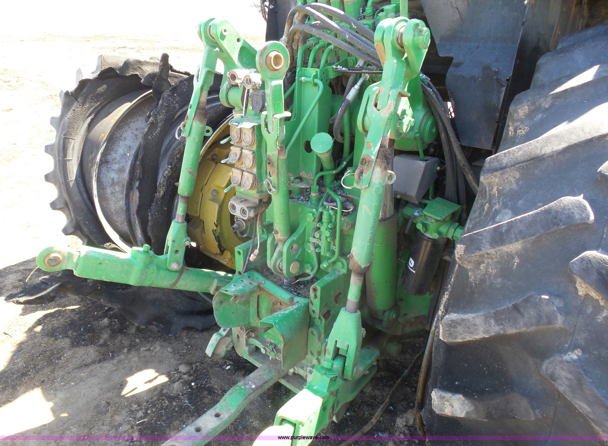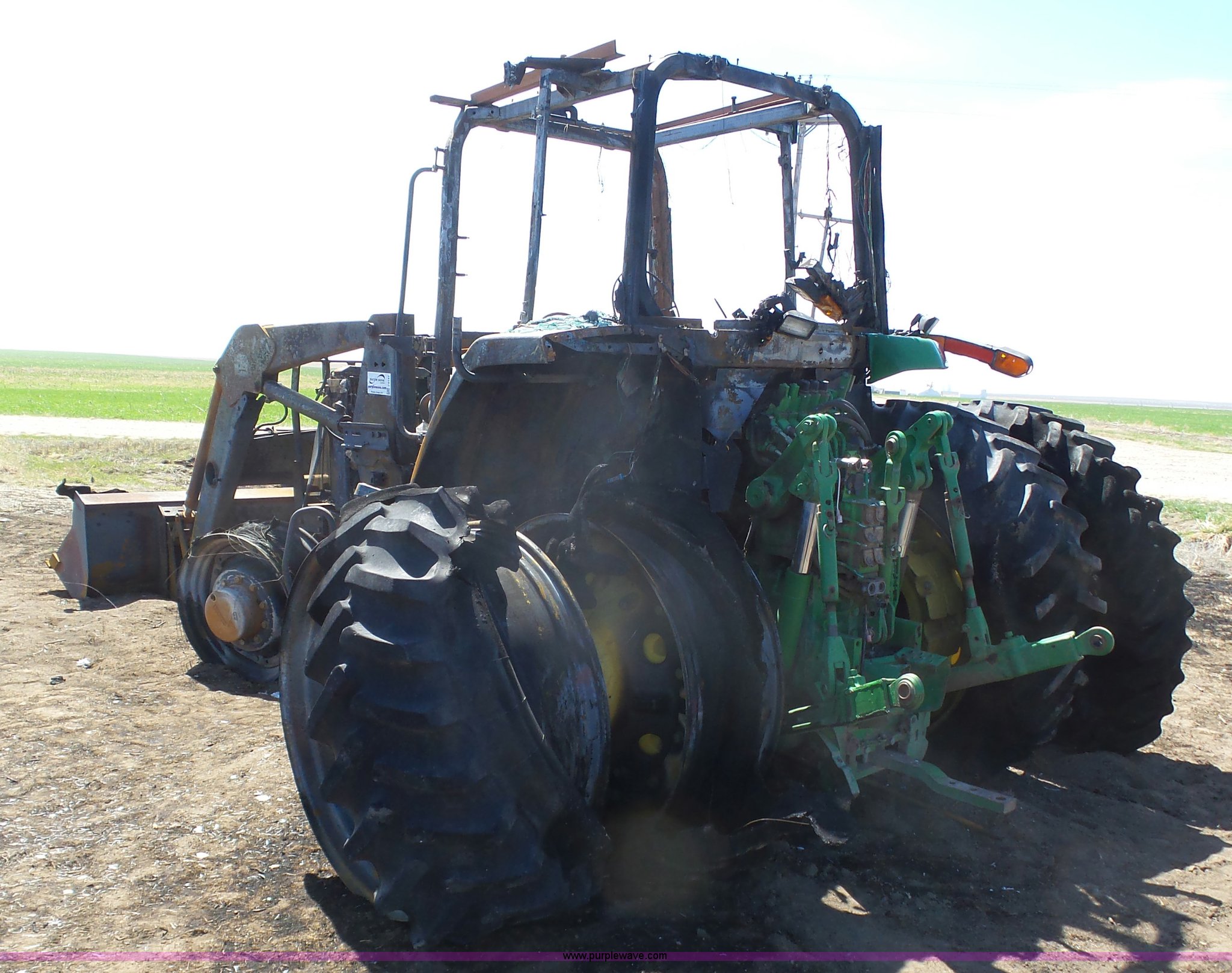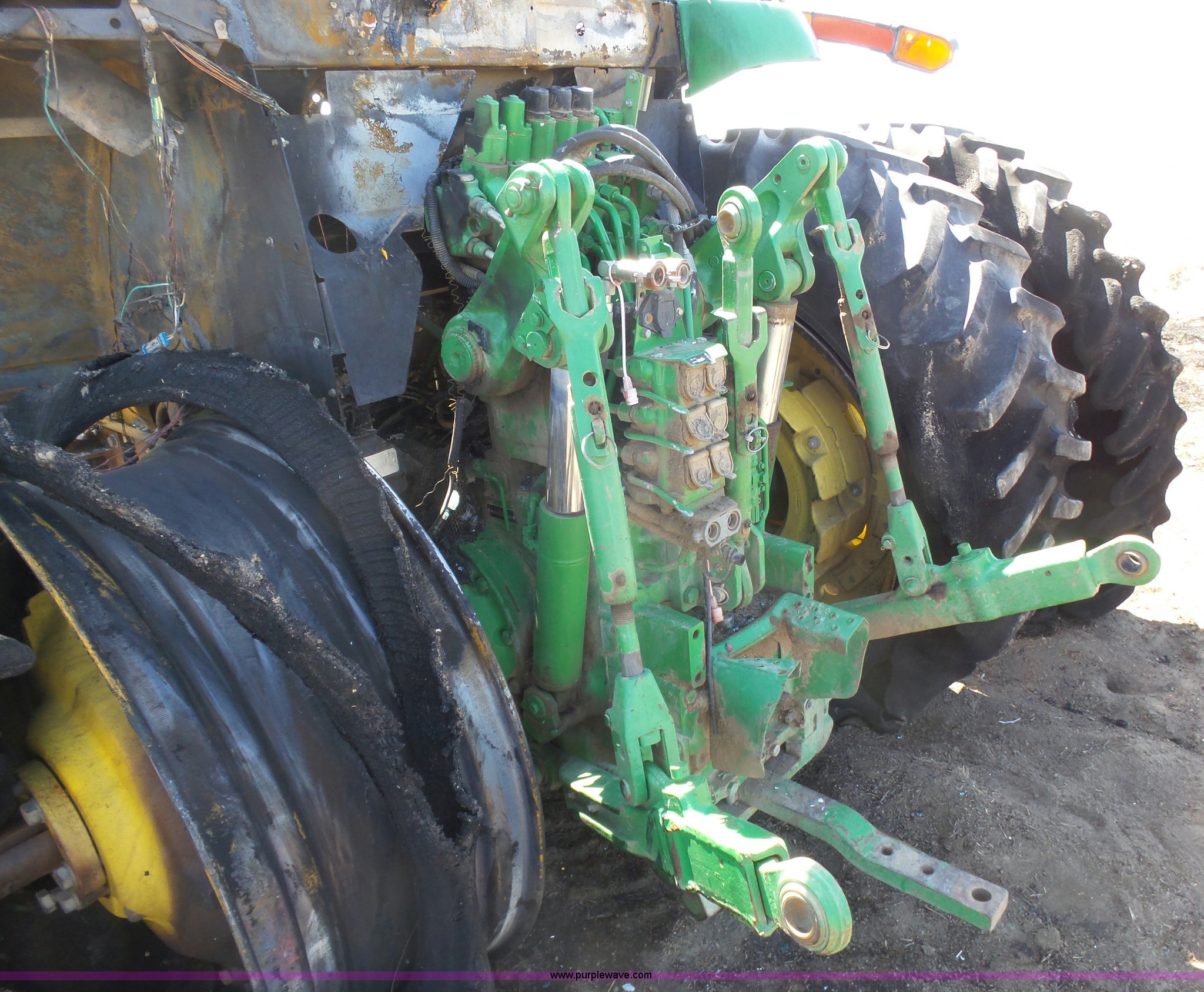 Purple Wave is selling a used Tractor in Kansas. This item is a 2002 John Deere 7810 MFWD tractor with the following: Unknown hours on meter, John Deere 6081TRW10 8.1L six cylinder turbo diesel engine, Serial RG6081T149061, Powershift transmission, 16F-16R gears, Suspension seat, John Deere loader, 85"W bucket, Quick attach, Three point, Seven pin outlet, 1000 PTO, Rear hydraulic remote sets, 18.4R42 dual rear tires, Non-operational unit, Fire damage, Serial 7810072634