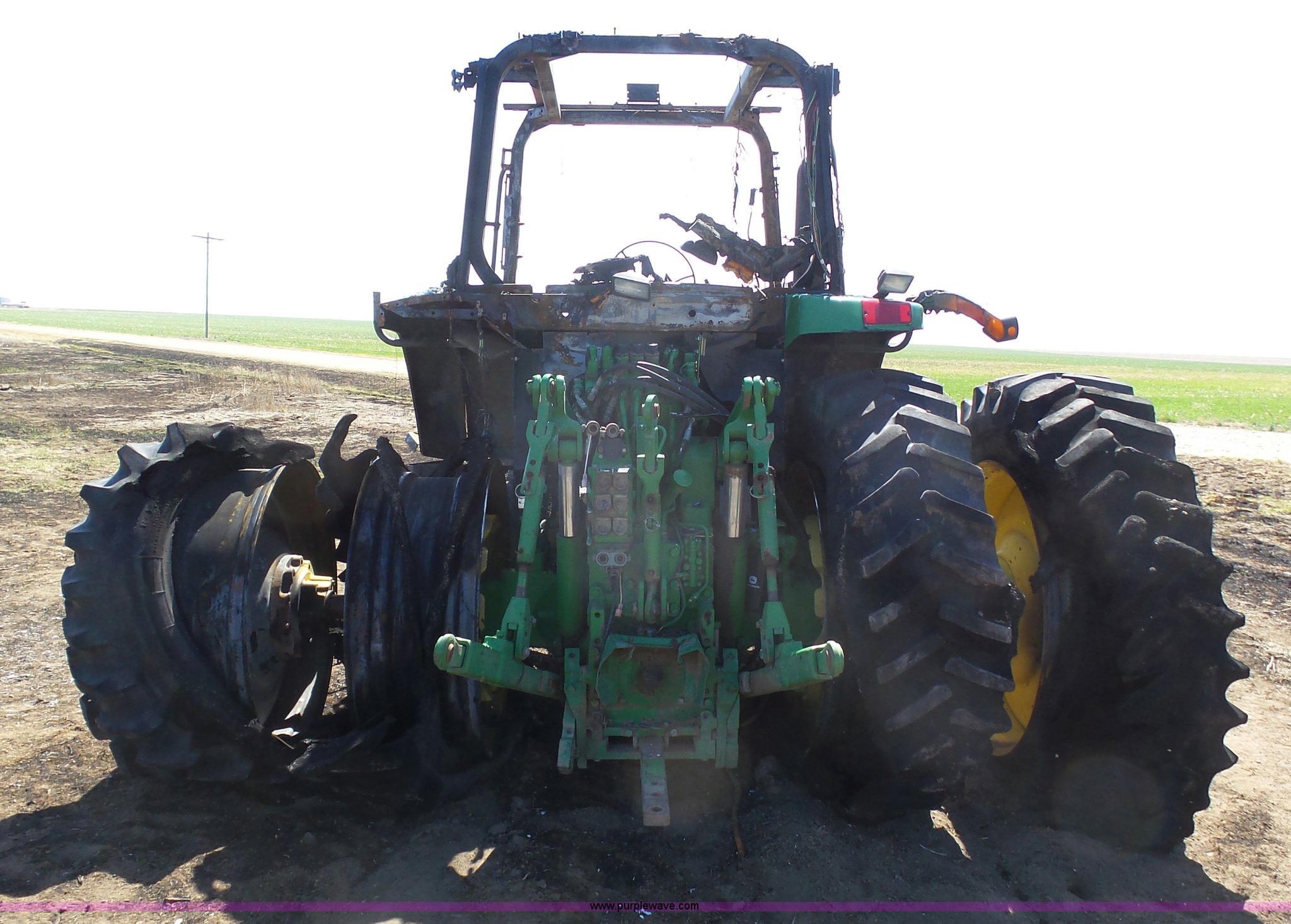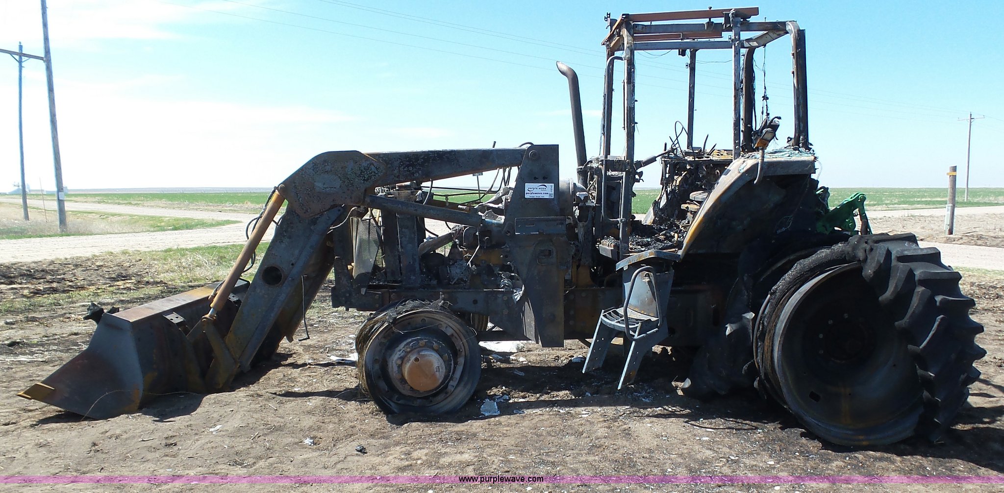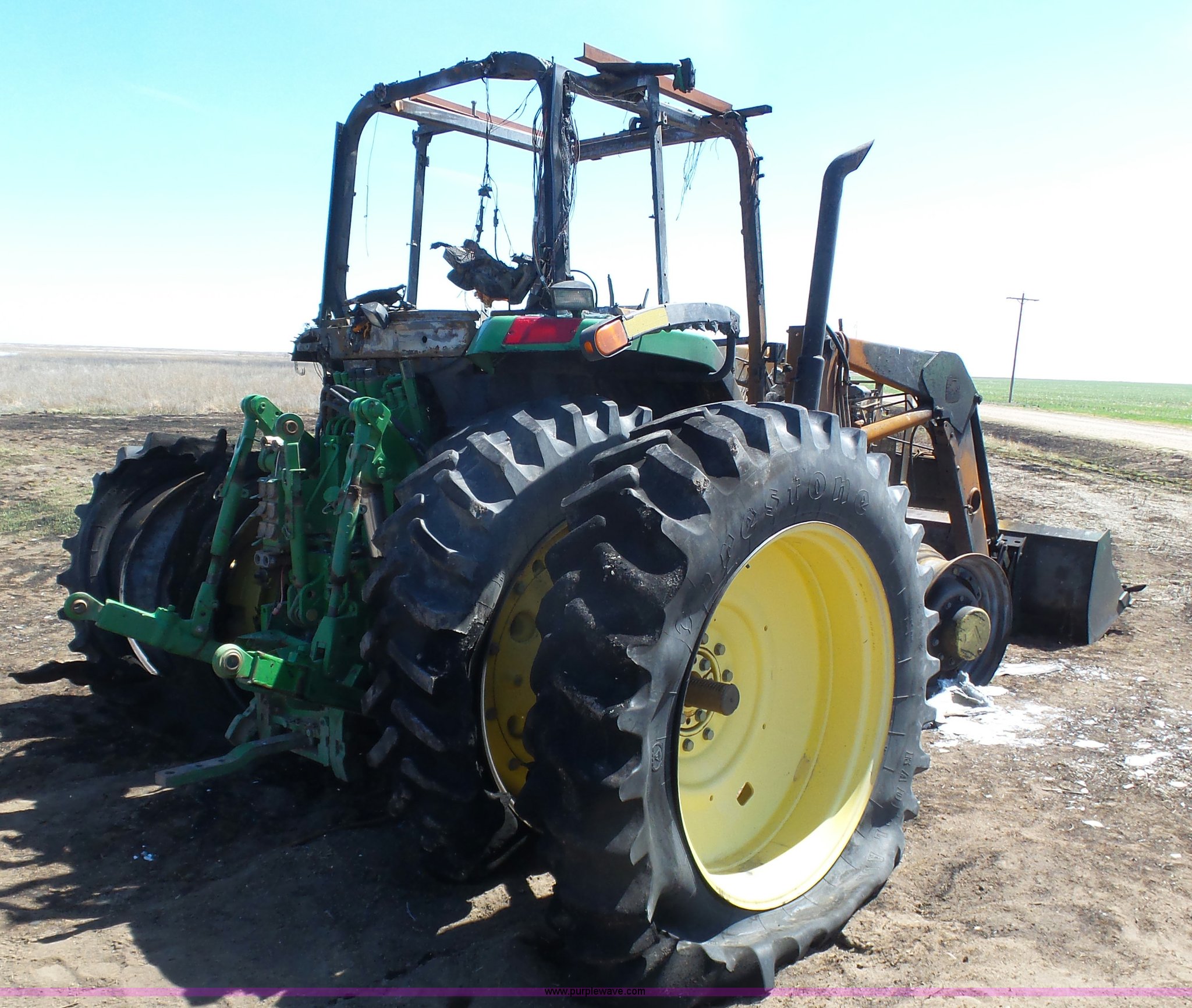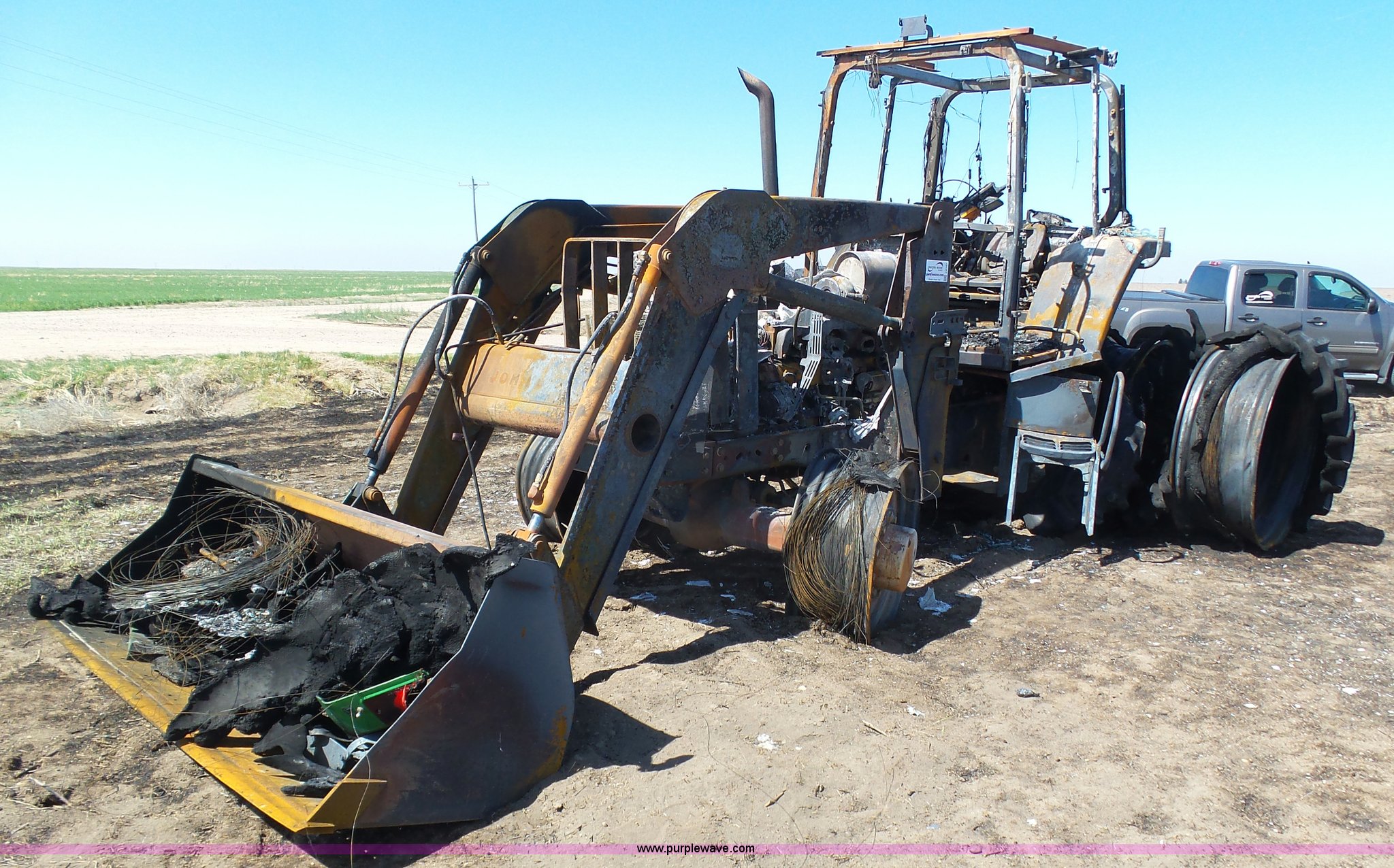 Purple Wave is selling a used Tractor in Kansas. This item is a 2002 John Deere 7810 MFWD tractor with the following: Unknown hours on meter, John Deere 6081TRW10 8.1L six cylinder turbo diesel engine, Serial RG6081T149061, Powershift transmission, 16F-16R gears, Suspension seat, John Deere loader, 85"W bucket, Quick attach, Three point, Seven pin outlet, 1000 PTO, Rear hydraulic remote sets, 18.4R42 dual rear tires, Non-operational unit, Fire damage, Serial 7810072634