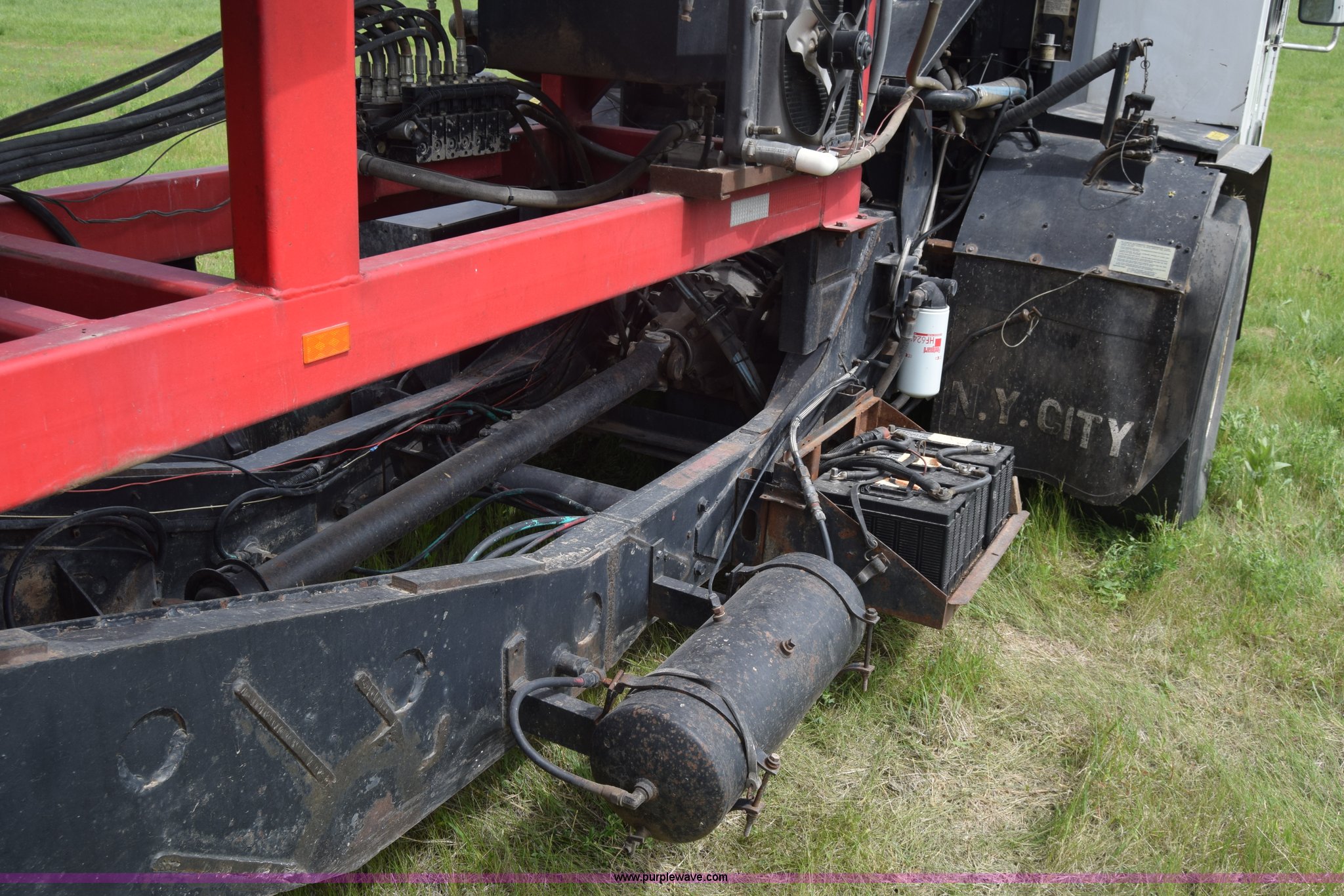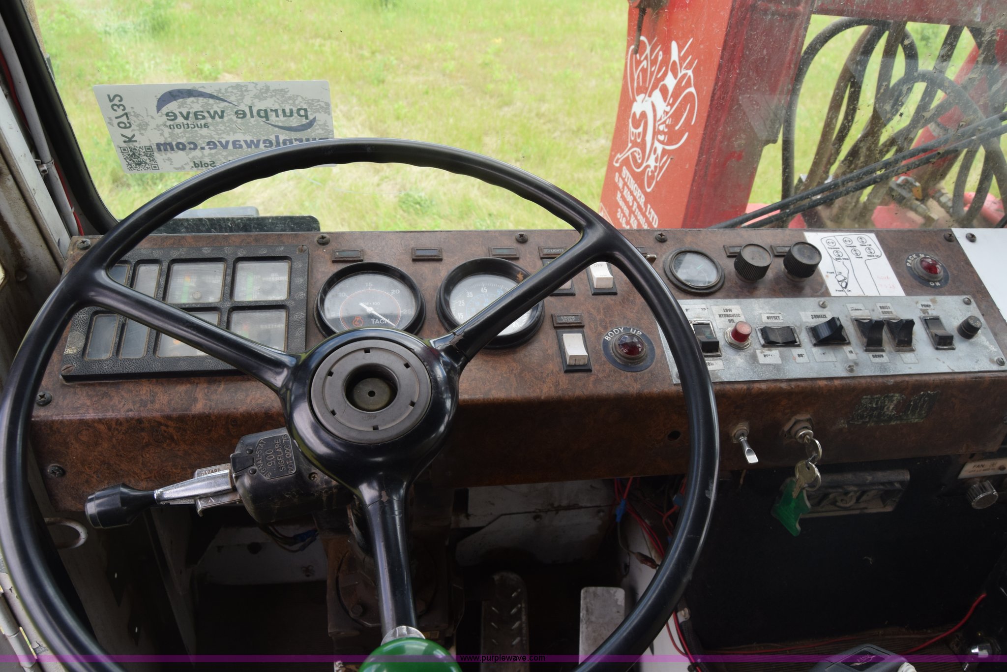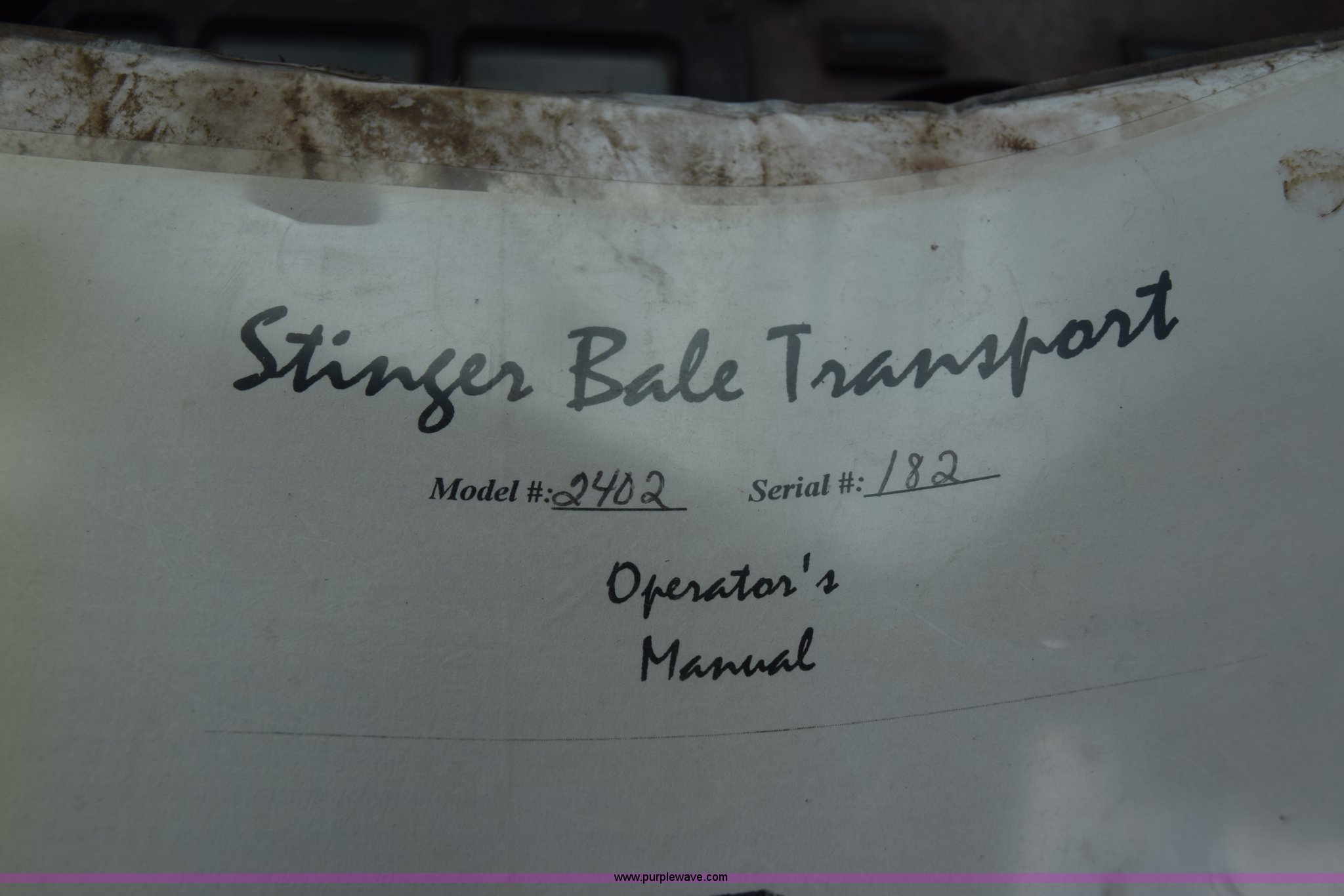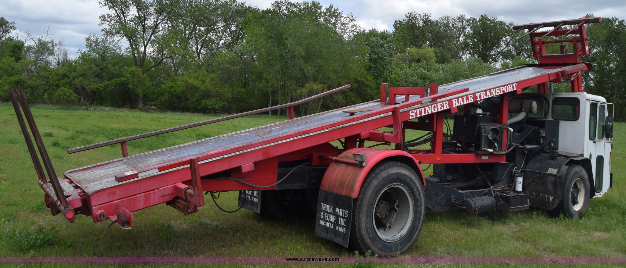 Purple Wave is selling a used Hay Handling in Kansas. This item is a Stinger 2402 bale transport/stacker with the following: 34,453 miles on odometer, 14,865 hours on meter, Detroit Diesel V8 diesel engine, Automatic transmission, AC and heat, AM/FM, Air suspension seat, 34' x 54"W bale deck, (8) 4'x4' square bale capacity, Approx. 26,000 lbs capacity, Rubber bushed spring suspension, Air brakes, 425/65R22.5 front tires, 12.00R24 rear tires, Serial 182