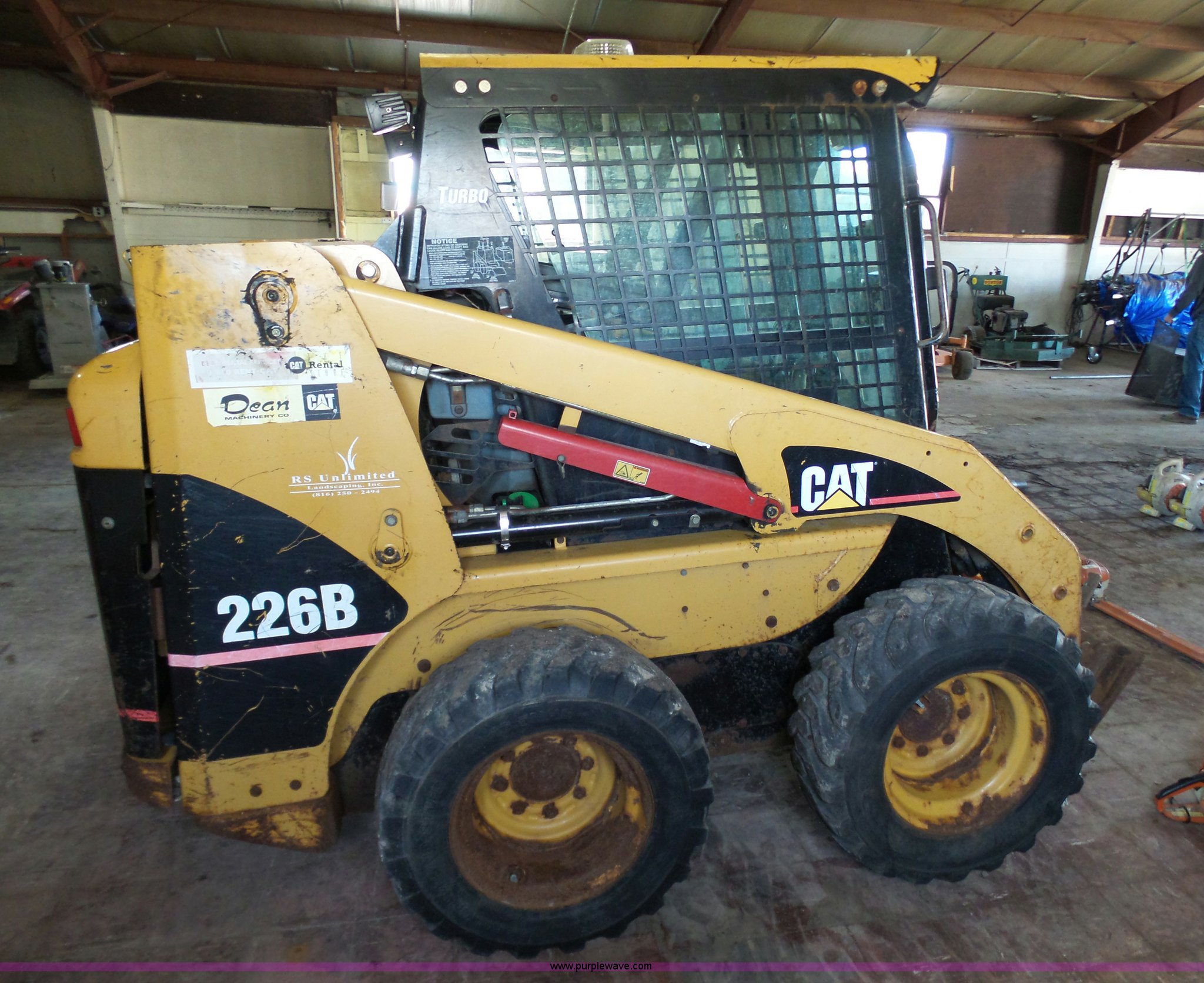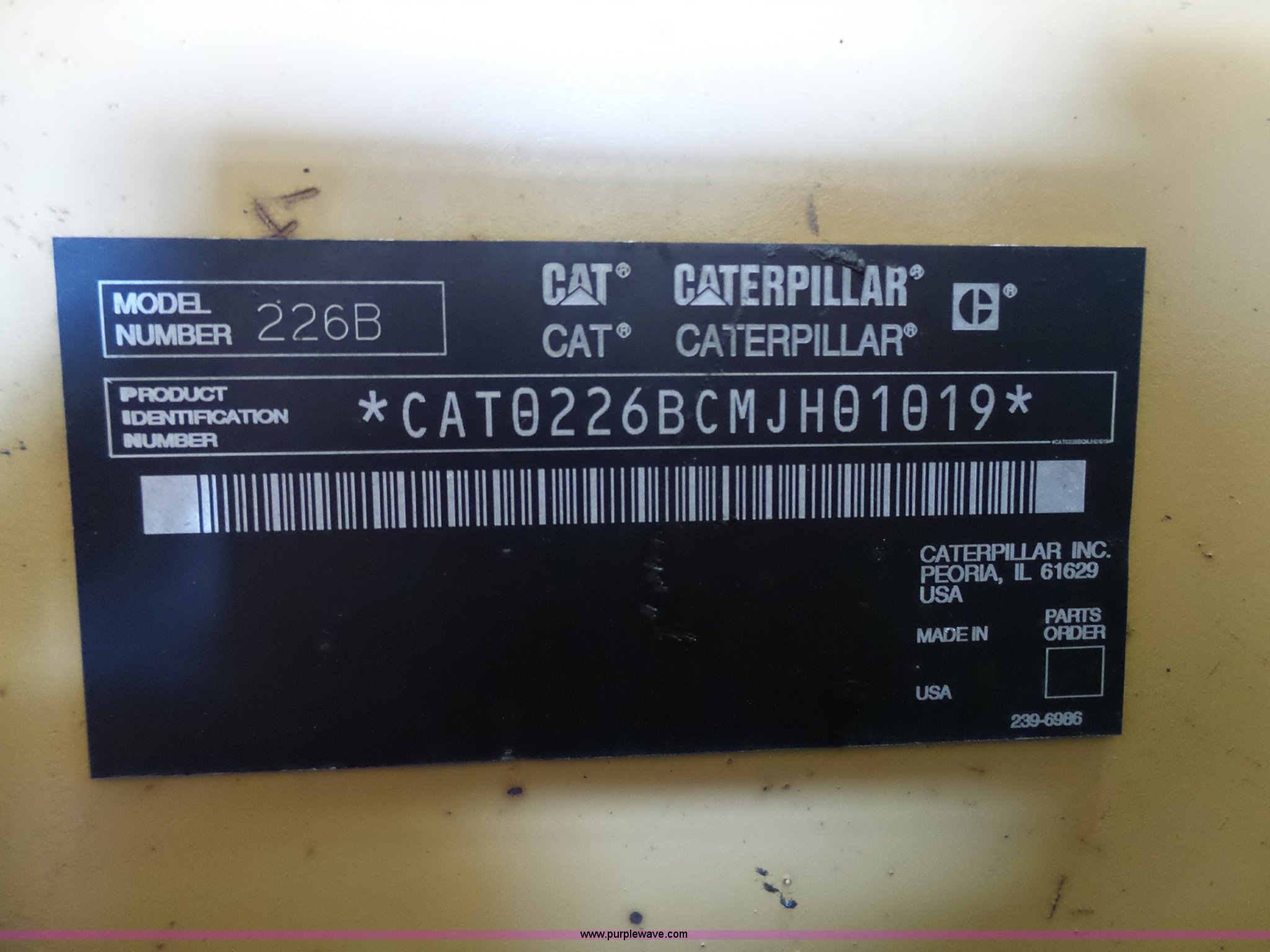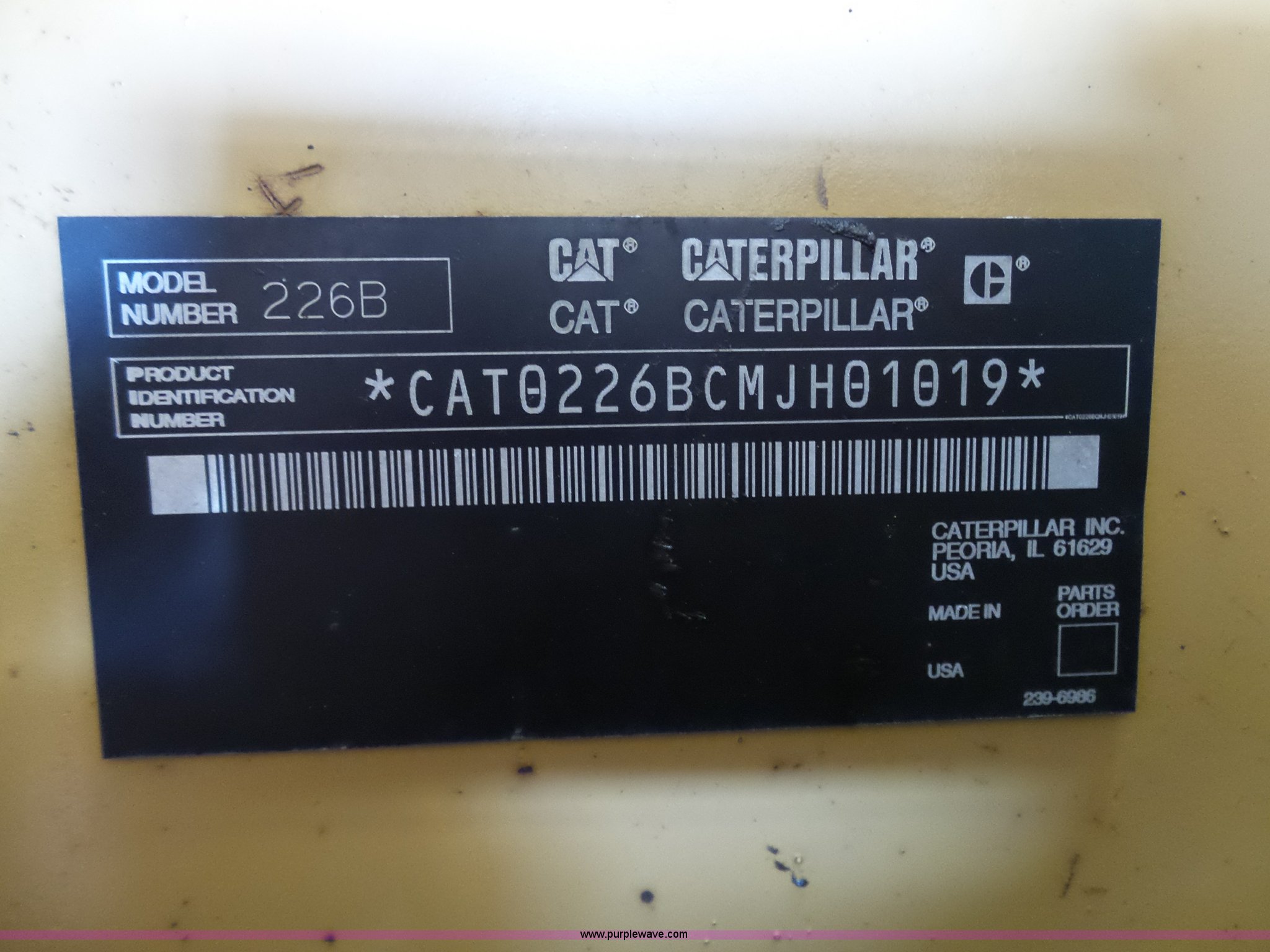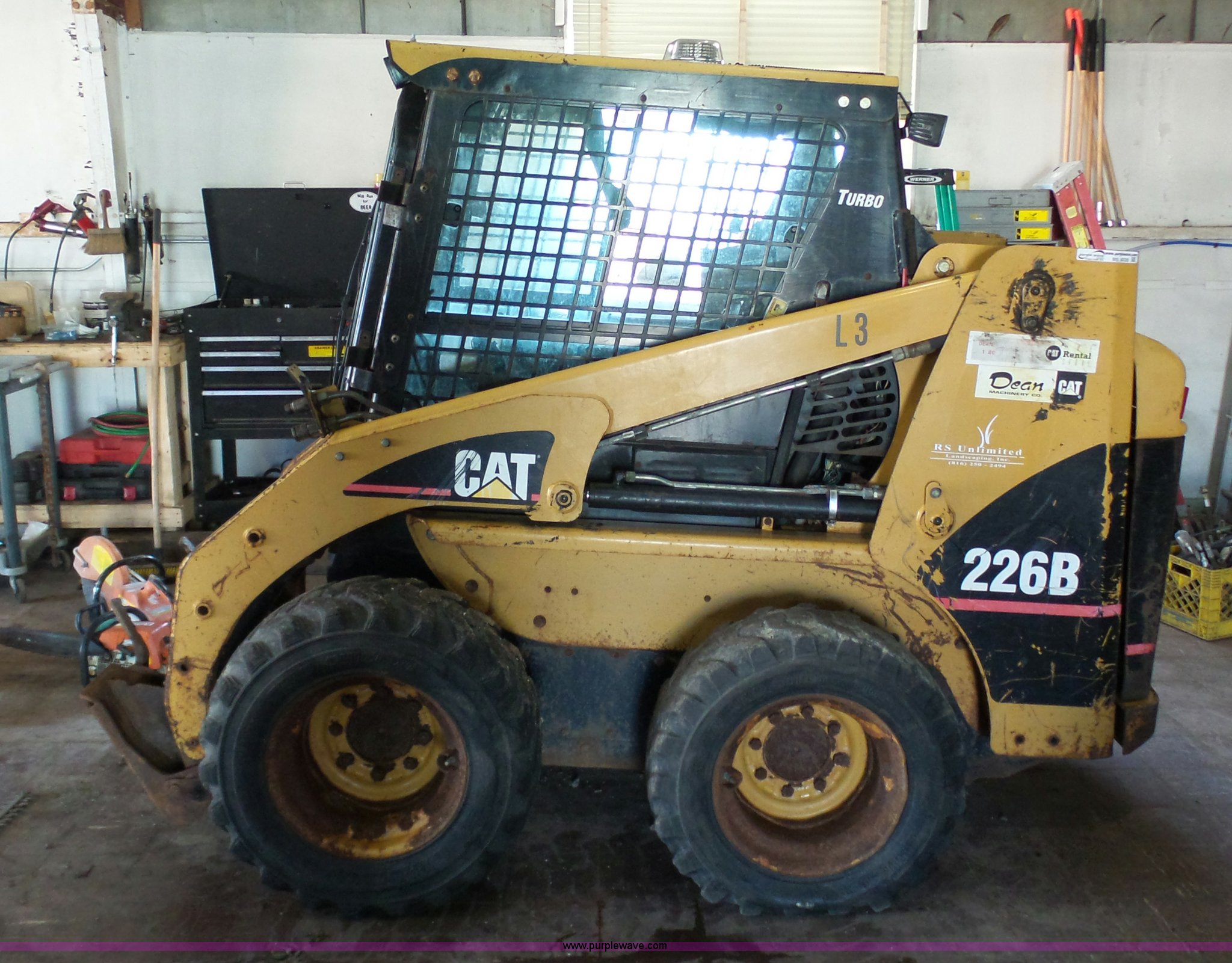 Purple Wave is selling a used Skid Steer Loader in Missouri. This item is a 2004 Caterpillar 226B skid steer with the following: 2,318 hours on meter, Caterpillar four cylinder turbo diesel engine, Hydrostatic transmission, Enclosed cab, AC and heat, Joystick controls, Front and rear work lights, 68"W bucket, Bolt-on teeth, Manual quick coupler, Auxiliary hydraulics, 10-16.5 tires, 5,834 lbs. base operating weight, Serial CAT0226BCMJH01019