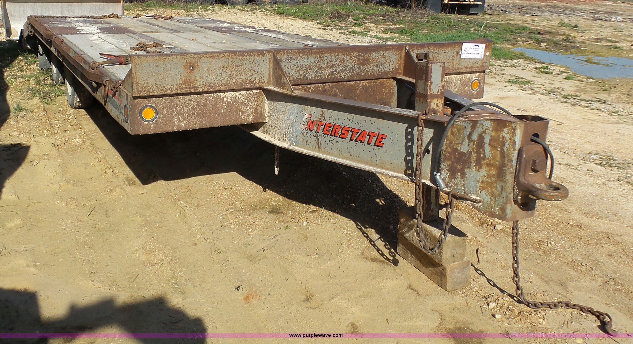 Purple Wave is selling a used Equip. Trailer in Missouri. This item is a 1989 Interstate equipment trailer with the following: 19'L x 100"W deck, 5'L dovetail, 54"L x 21"W ramps, Adjustable pintle hitch, Spring and beam suspension, Electric brakes, 8.75R16.5LT tires, GVWR 23,200 lbs, Chains and binders are not included