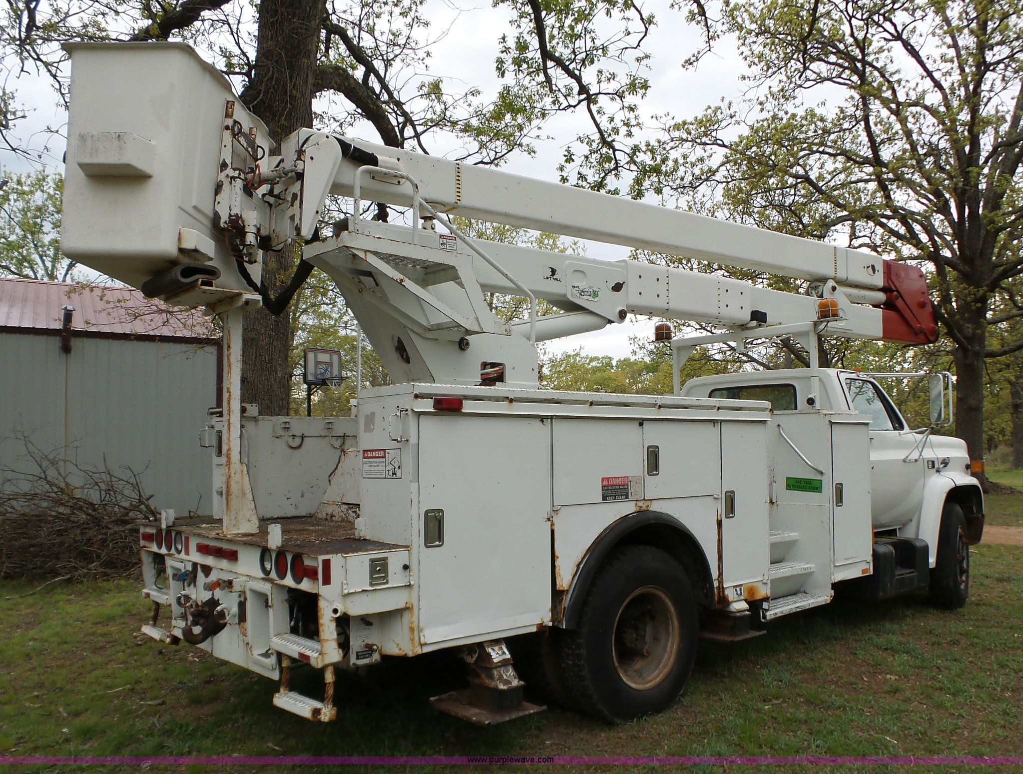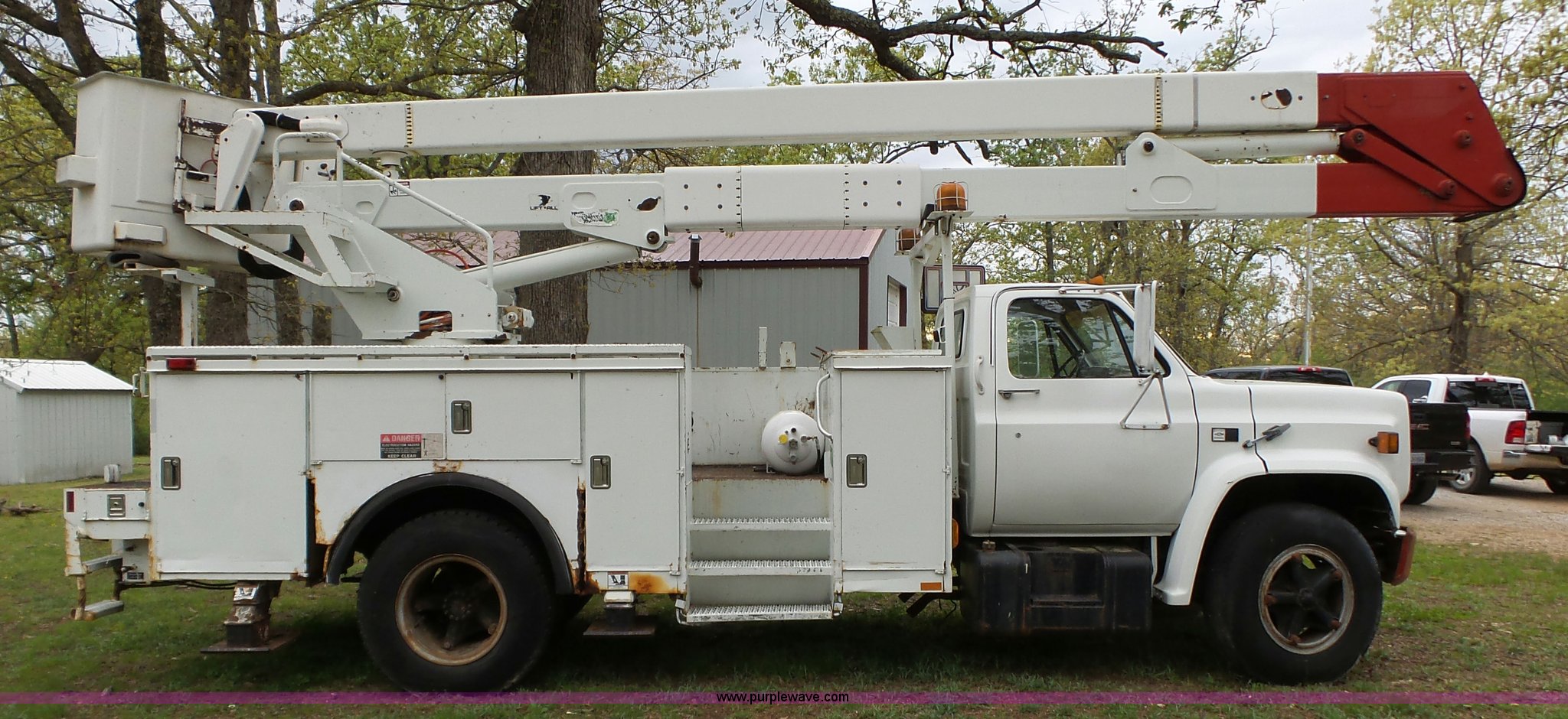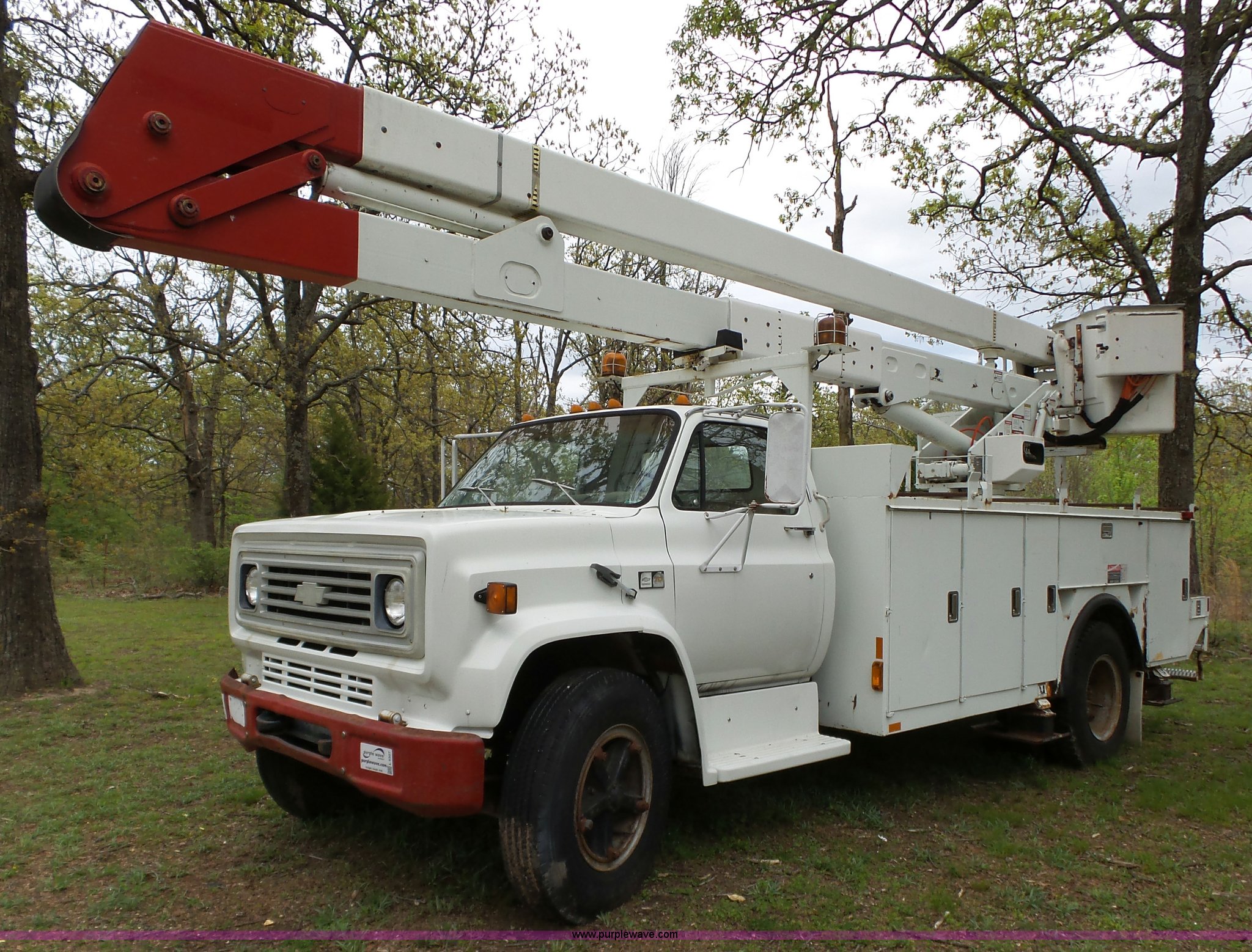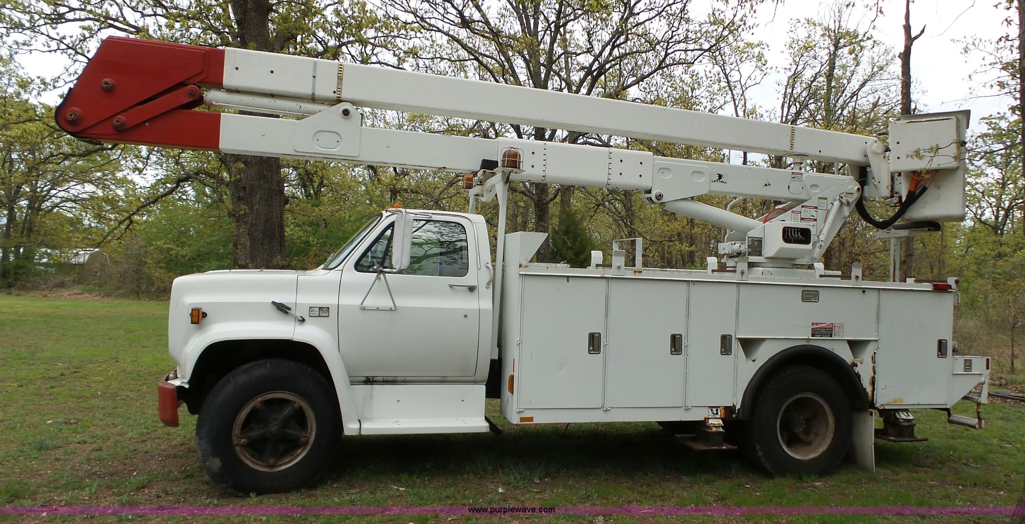 Purple Wave is selling a used Bucket Truck in Oklahoma. This item is a 1988 Chevrolet C70 bucket truck with the following: 38,600 miles on odometer, 6.0L V8 propane engine, Five speed manual transmission, Two speed rear end, Heat, AM/FM, Spring suspension seat, Beacon light, Front tow hooks, PTO, Stahl service bed, Shelving, Slide-out drawers, Pintle hitch, 1999 Lift-All LAN-21-2E boom, 600 lbs maximum lift capacity, 51' maximum lift height, Ground and platform controls, Boom rotation, Articulating insulated boom, Serial 6358089951LAN, Single fuel tank, Spring suspension, Hydraulic brakes, 9.00R20 tires, GVWR 23,160 lbs, Windsheild cracked, Hydraulic pump included, detached