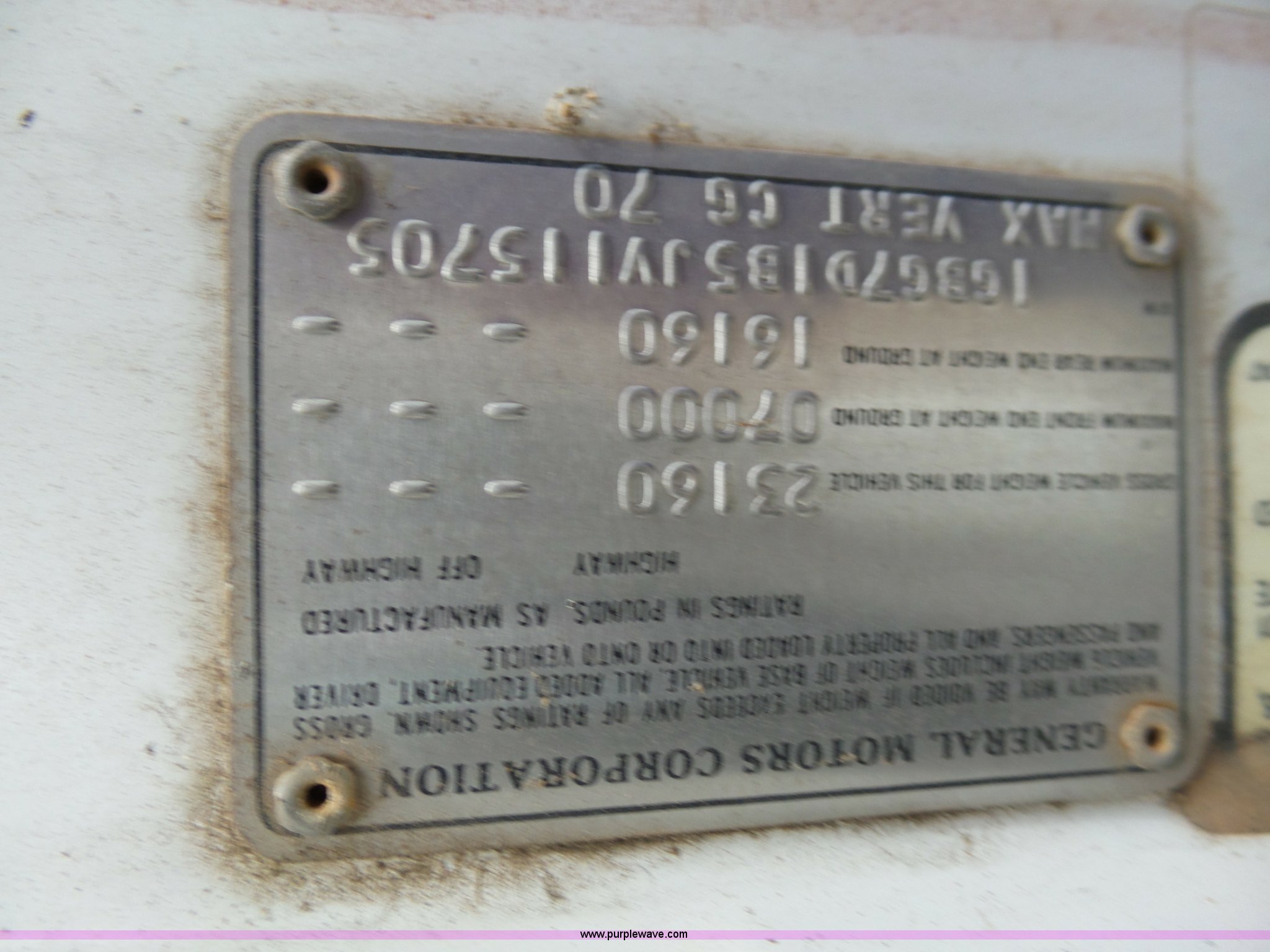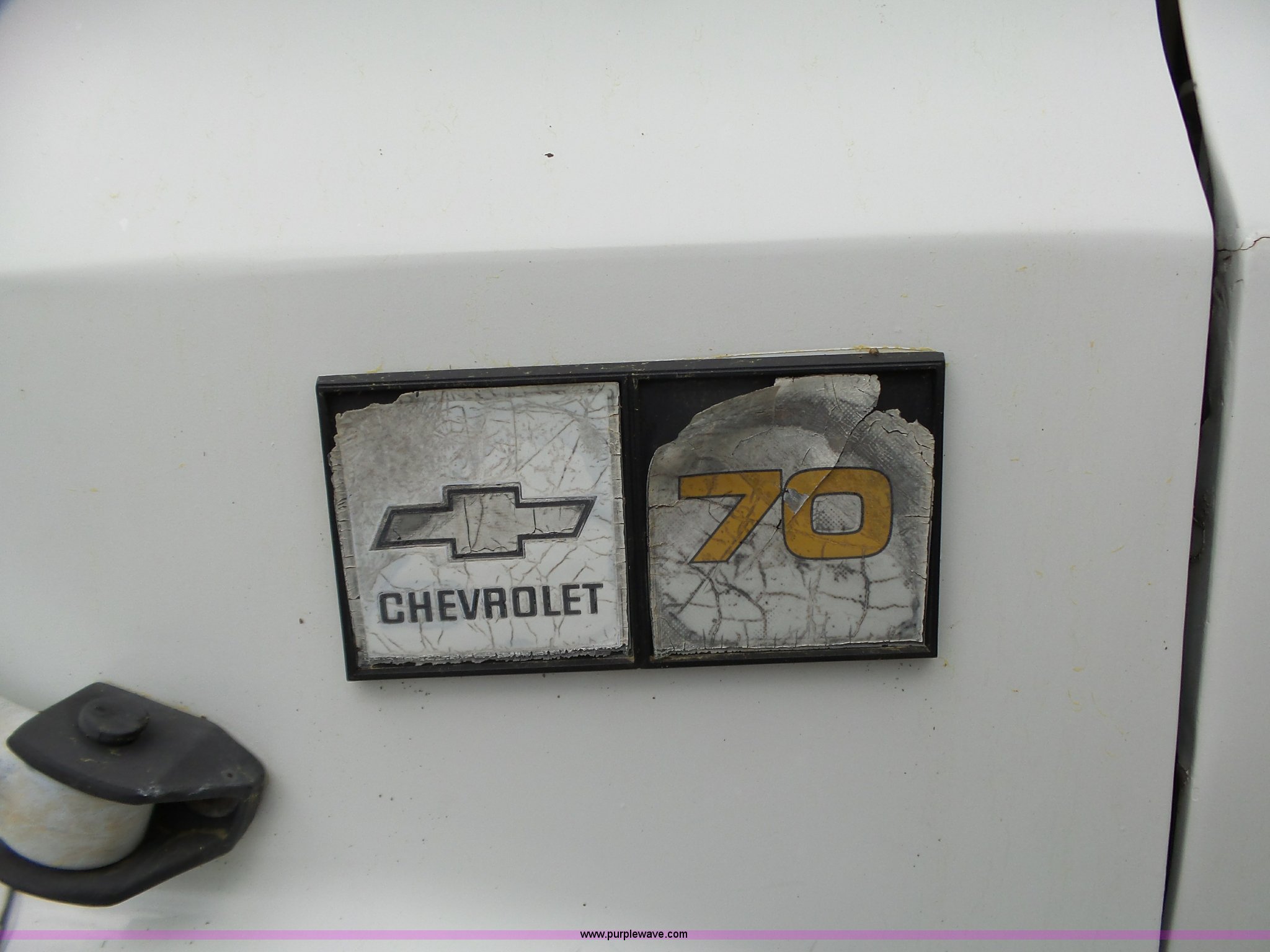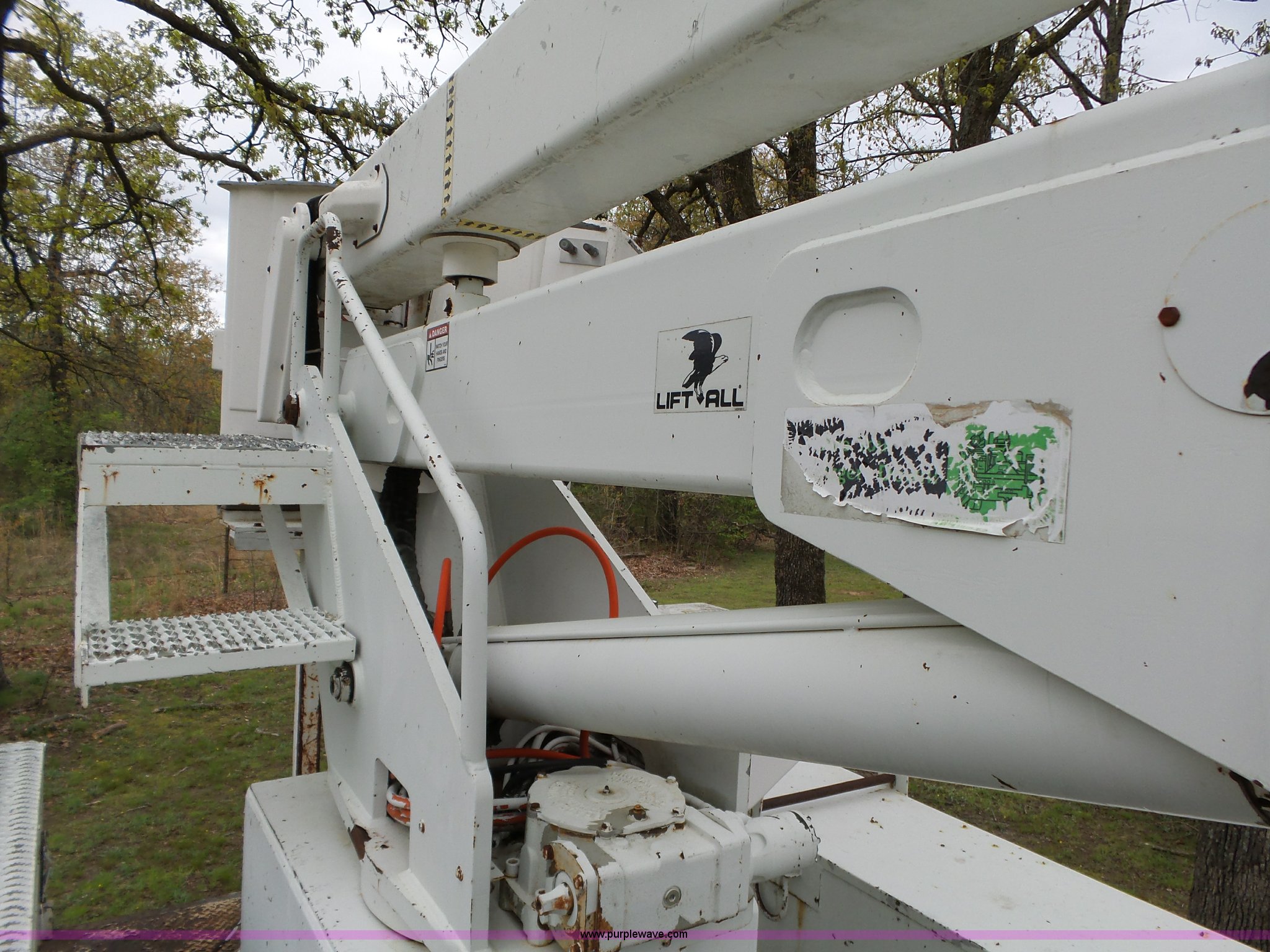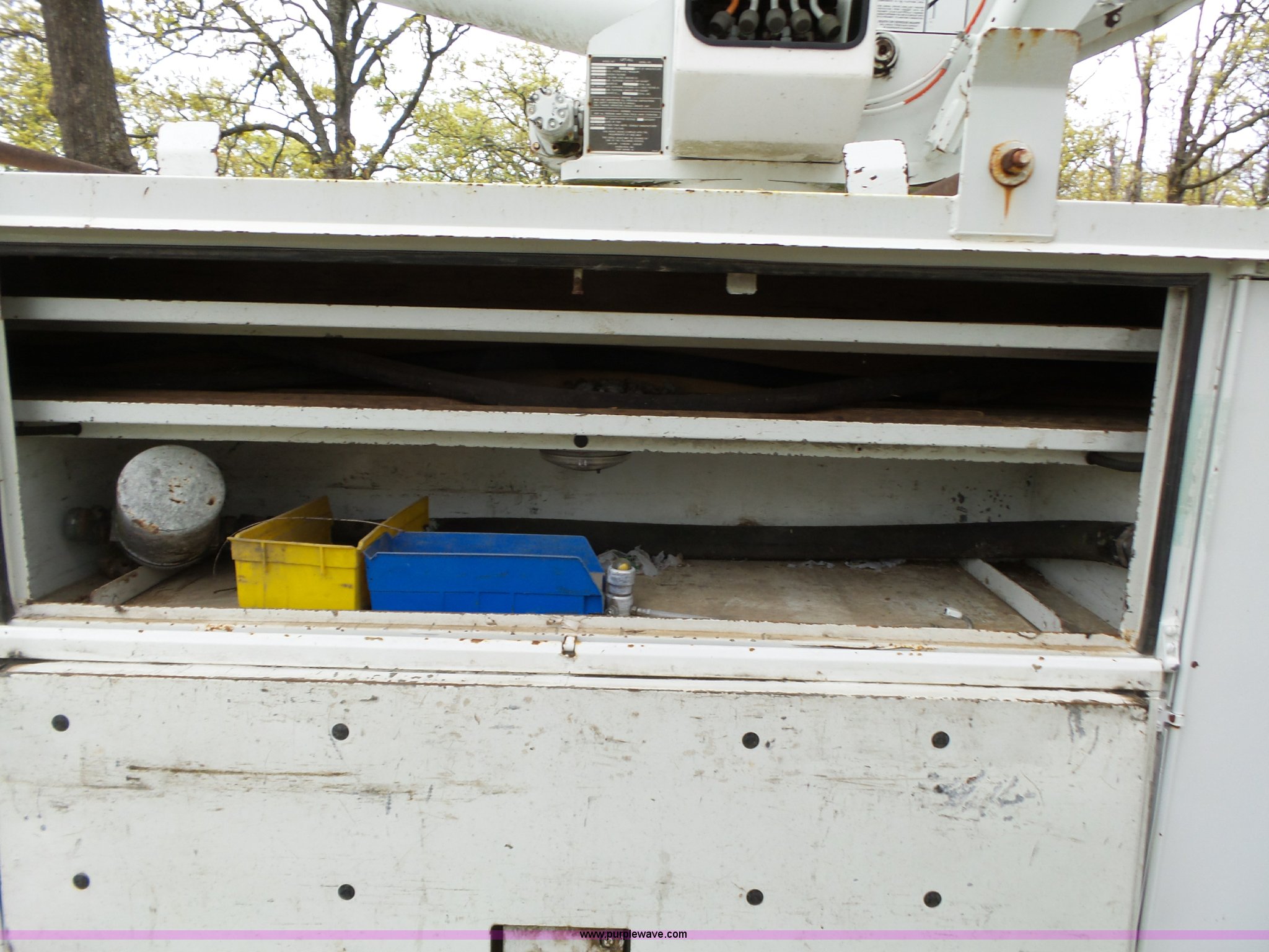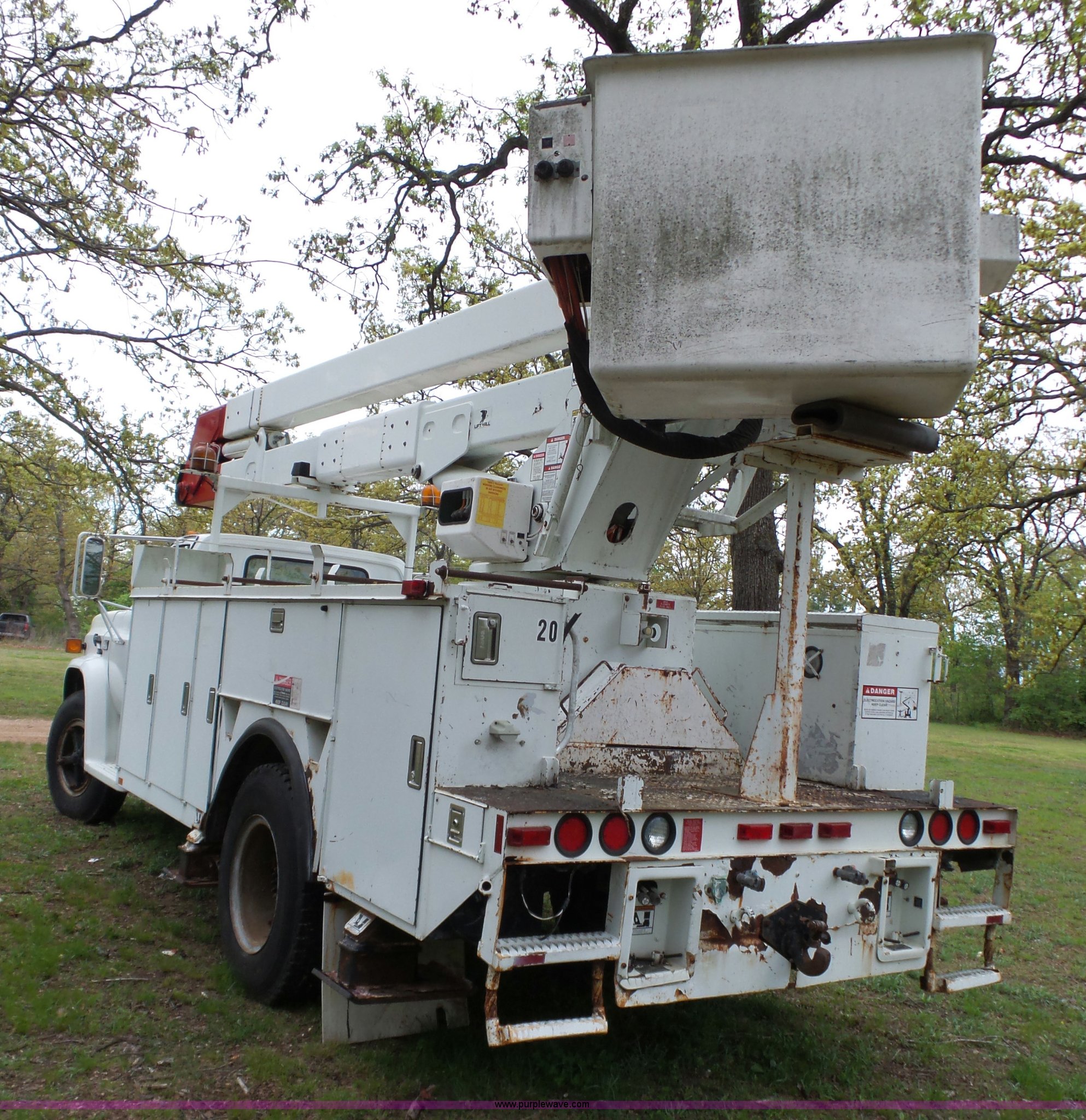 Purple Wave is selling a used Bucket Truck in Oklahoma. This item is a 1988 Chevrolet C70 bucket truck with the following: 38,600 miles on odometer, 6.0L V8 propane engine, Five speed manual transmission, Two speed rear end, Heat, AM/FM, Spring suspension seat, Beacon light, Front tow hooks, PTO, Stahl service bed, Shelving, Slide-out drawers, Pintle hitch, 1999 Lift-All LAN-21-2E boom, 600 lbs maximum lift capacity, 51' maximum lift height, Ground and platform controls, Boom rotation, Articulating insulated boom, Serial 6358089951LAN, Single fuel tank, Spring suspension, Hydraulic brakes, 9.00R20 tires, GVWR 23,160 lbs, Windsheild cracked, Hydraulic pump included, detached